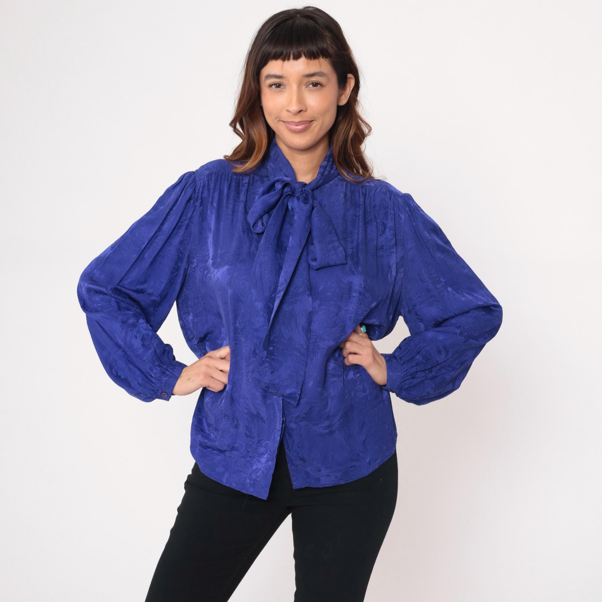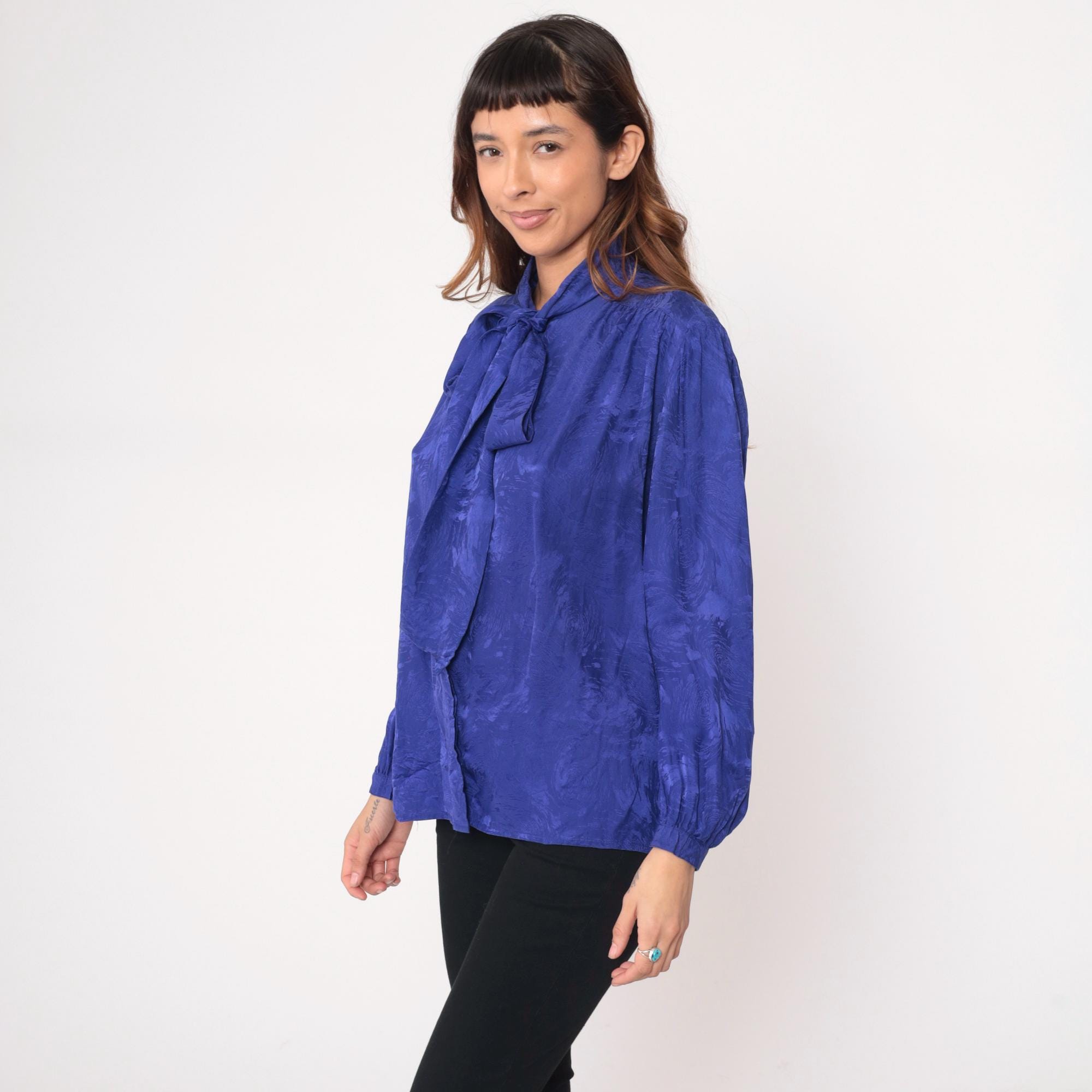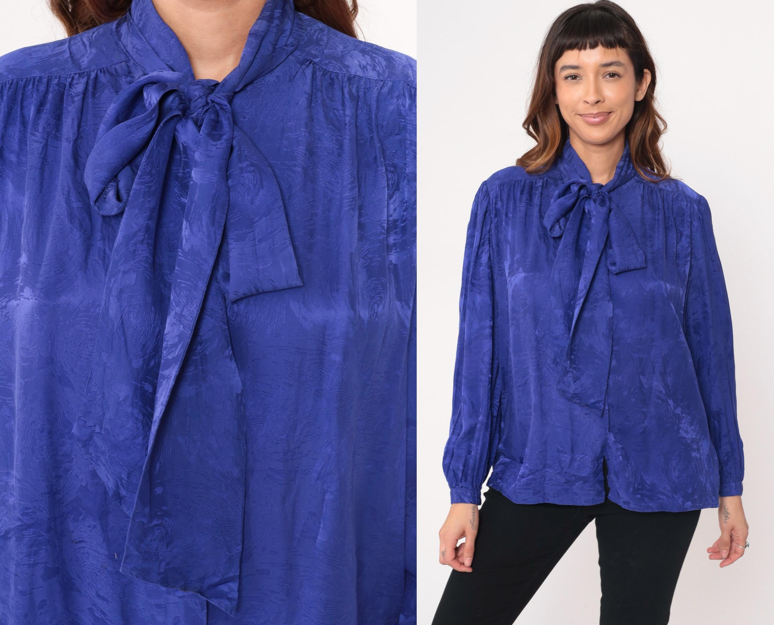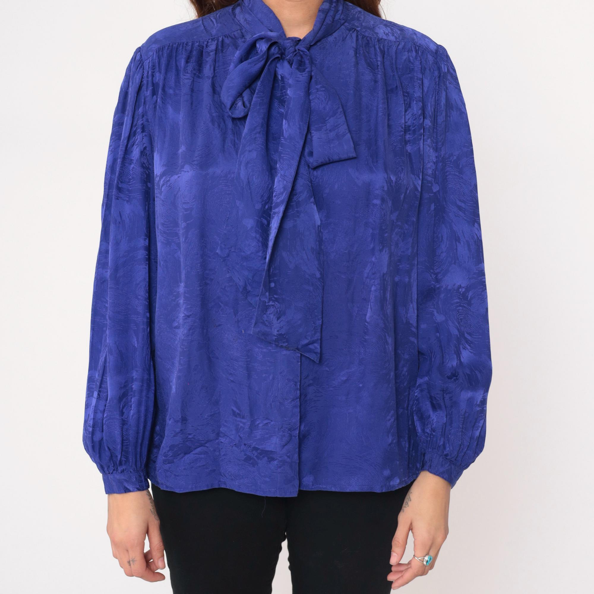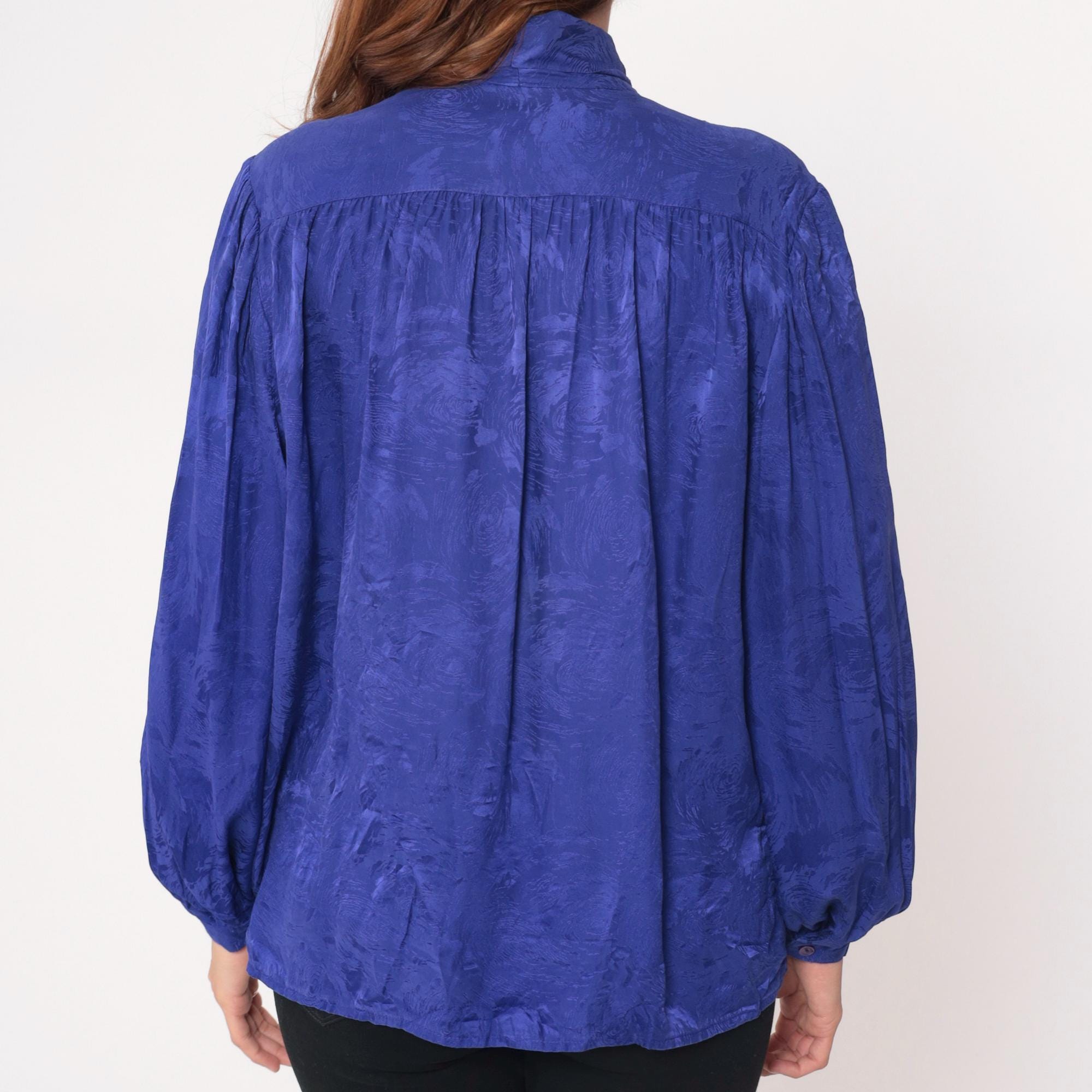 90s royal blue silk blouse from Argenti with pussy bow tie neckline and gathered shoulders. Long sleeves with ruched cuffs, back yoke with gathered detail across shoulders, jacquard textured silk fabric with subtle tonal pattern throughout.