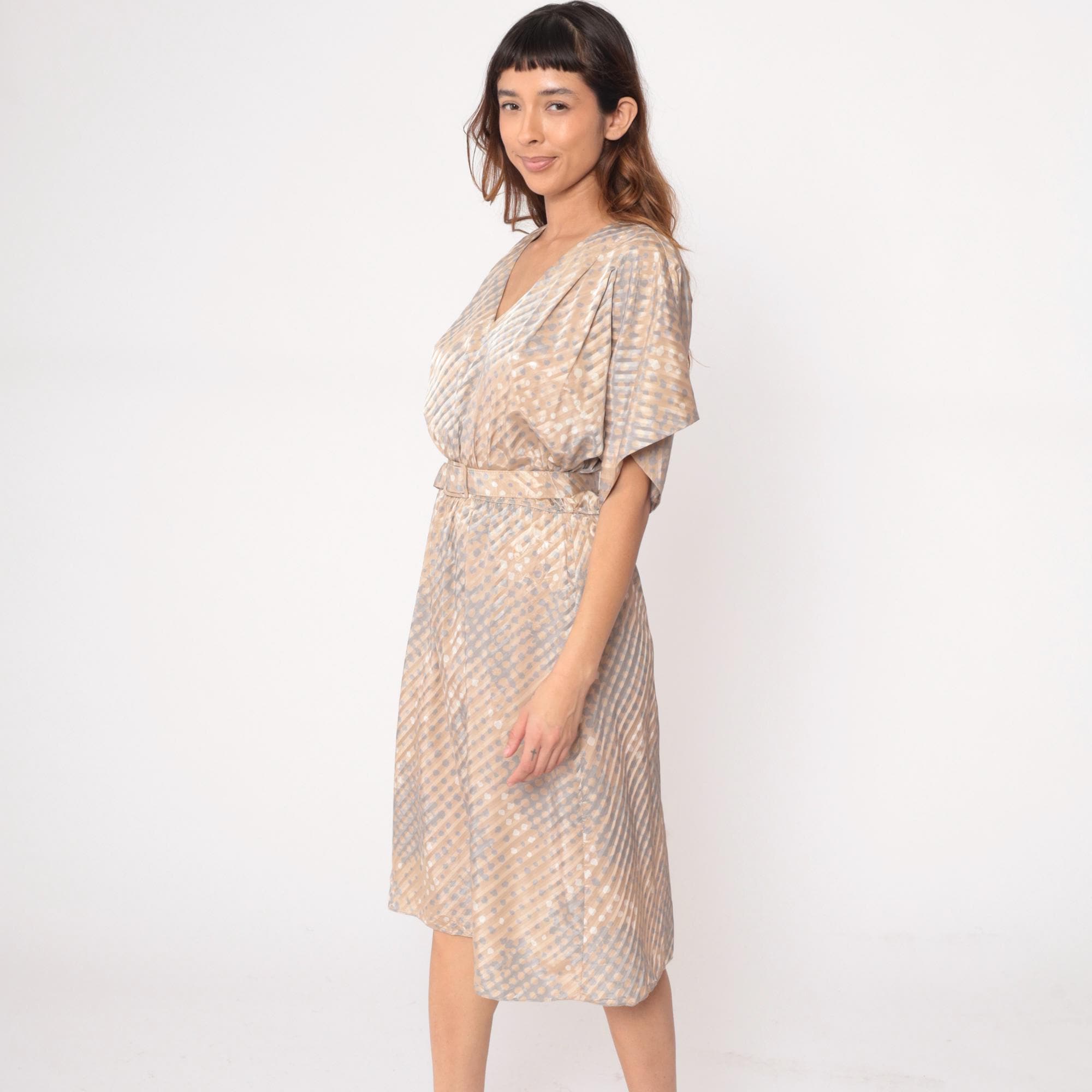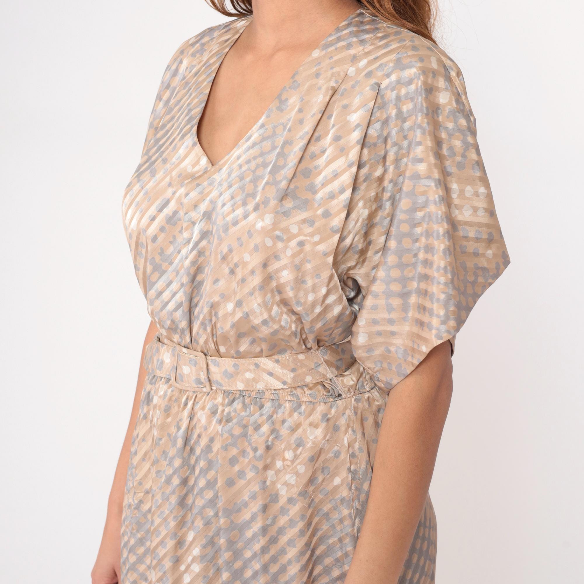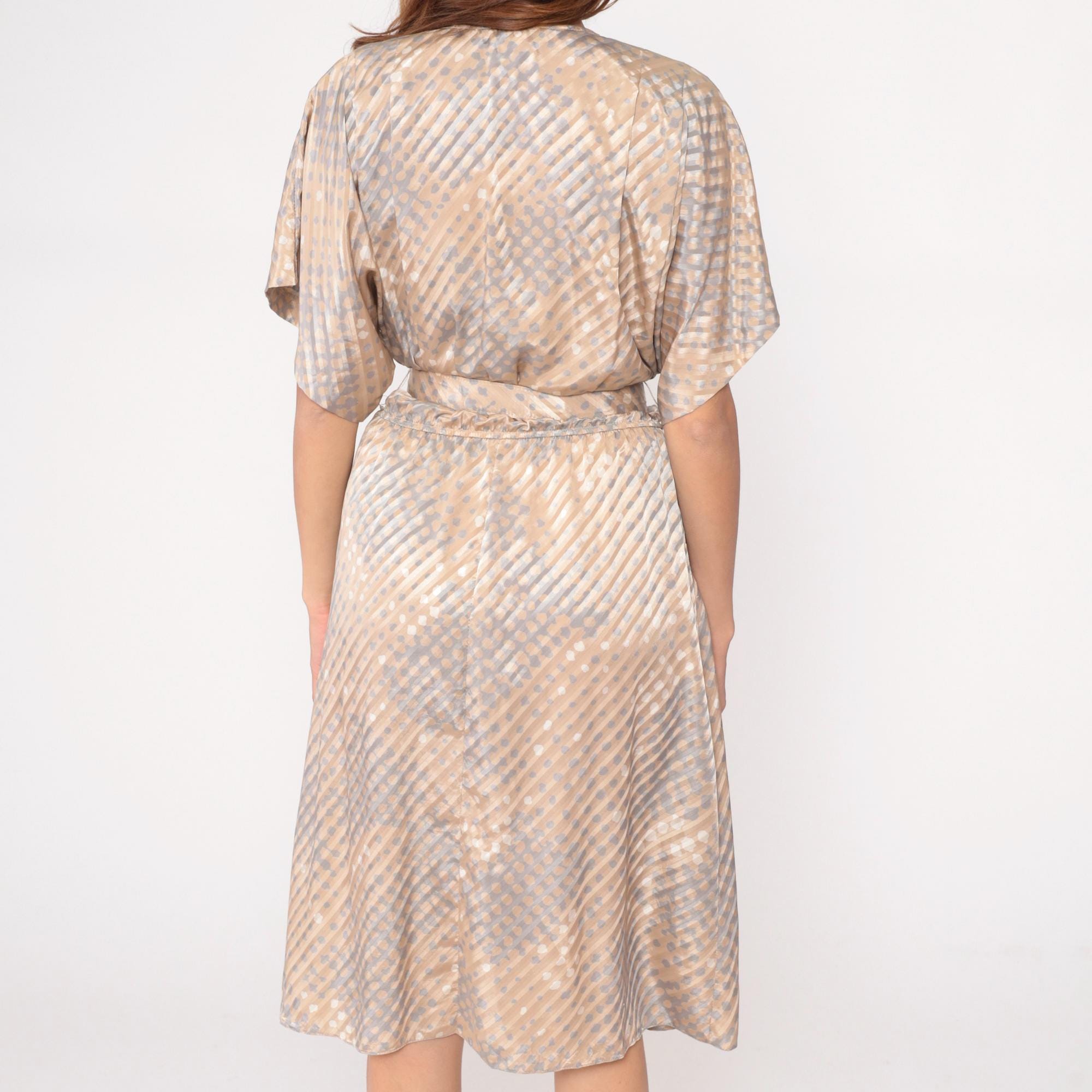 80s beige and silver polka dot wrap dress from Pellini with diagonal striped pattern throughout. Kimono-style short sleeves, V-neckline, matching fabric belt with buckle closure.