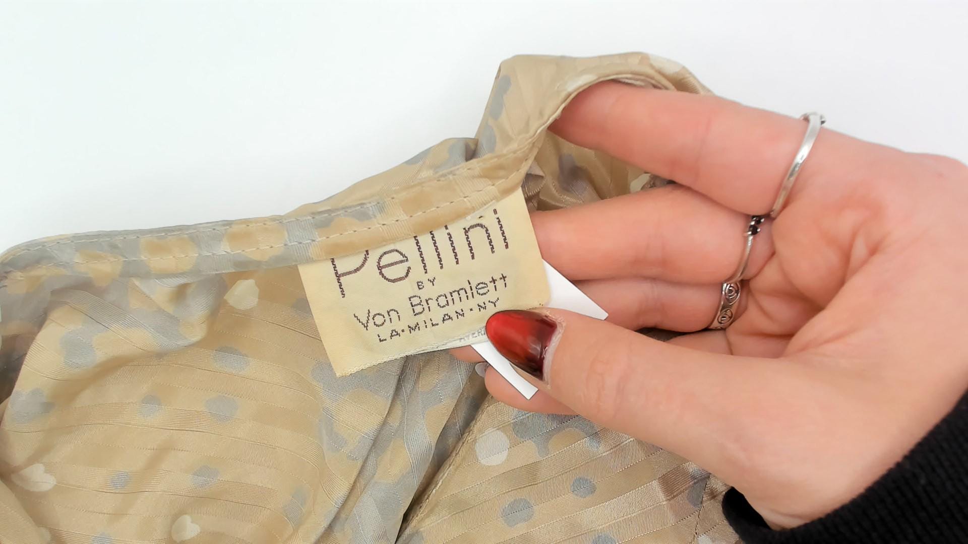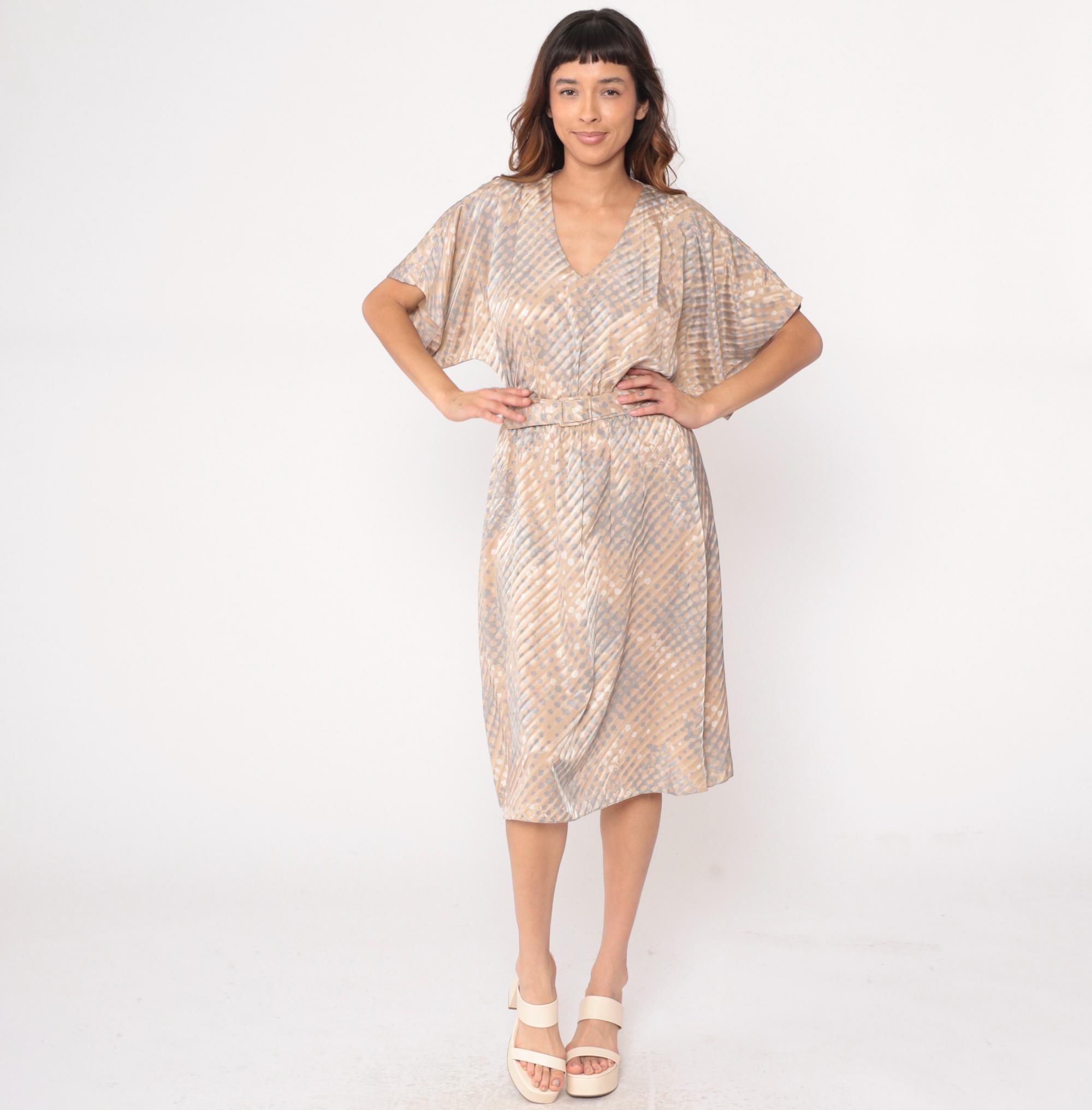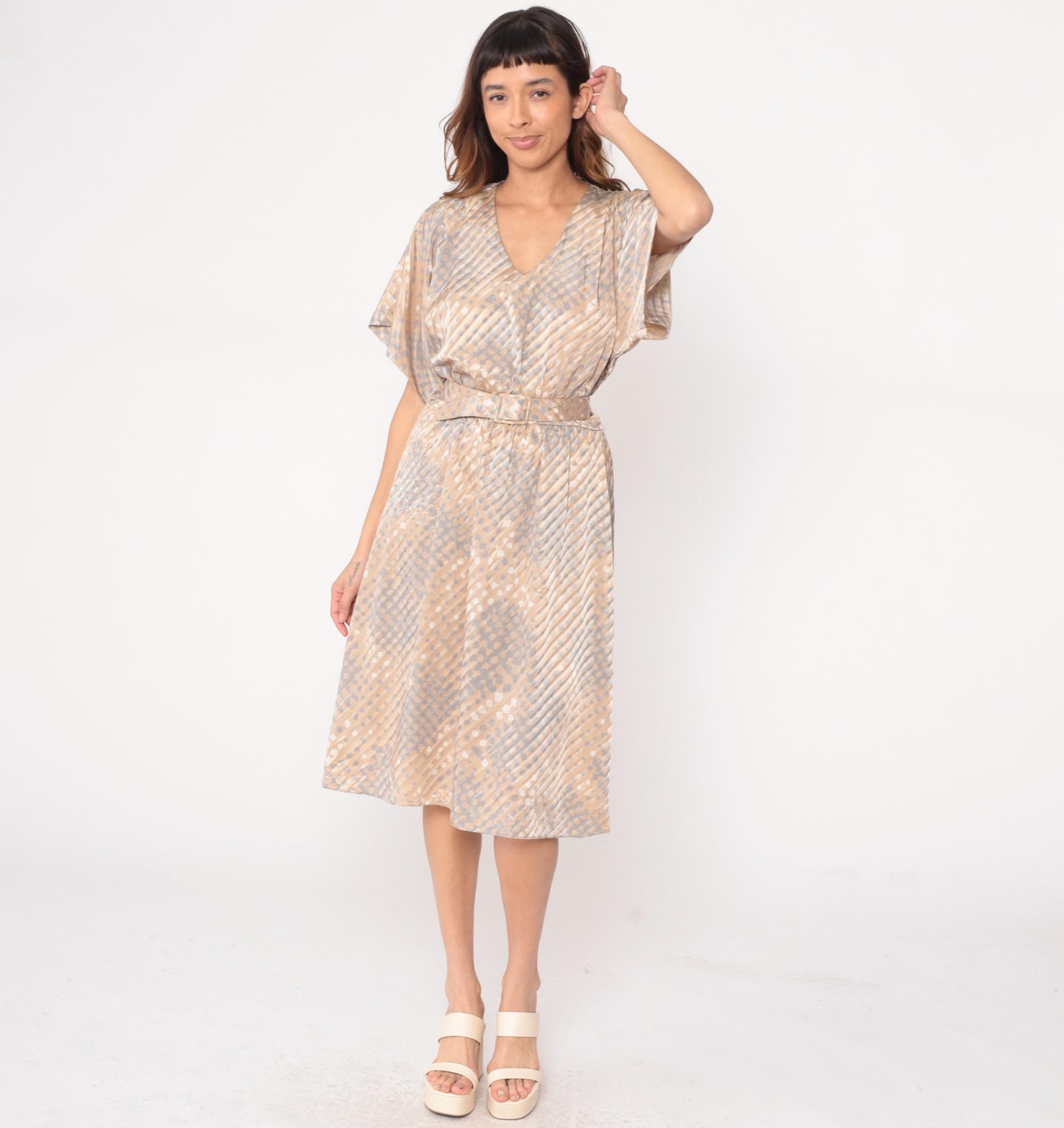 80s beige and silver polka dot wrap dress from Pellini with diagonal striped pattern throughout. Kimono-style short sleeves, V-neckline, matching fabric belt with buckle closure.