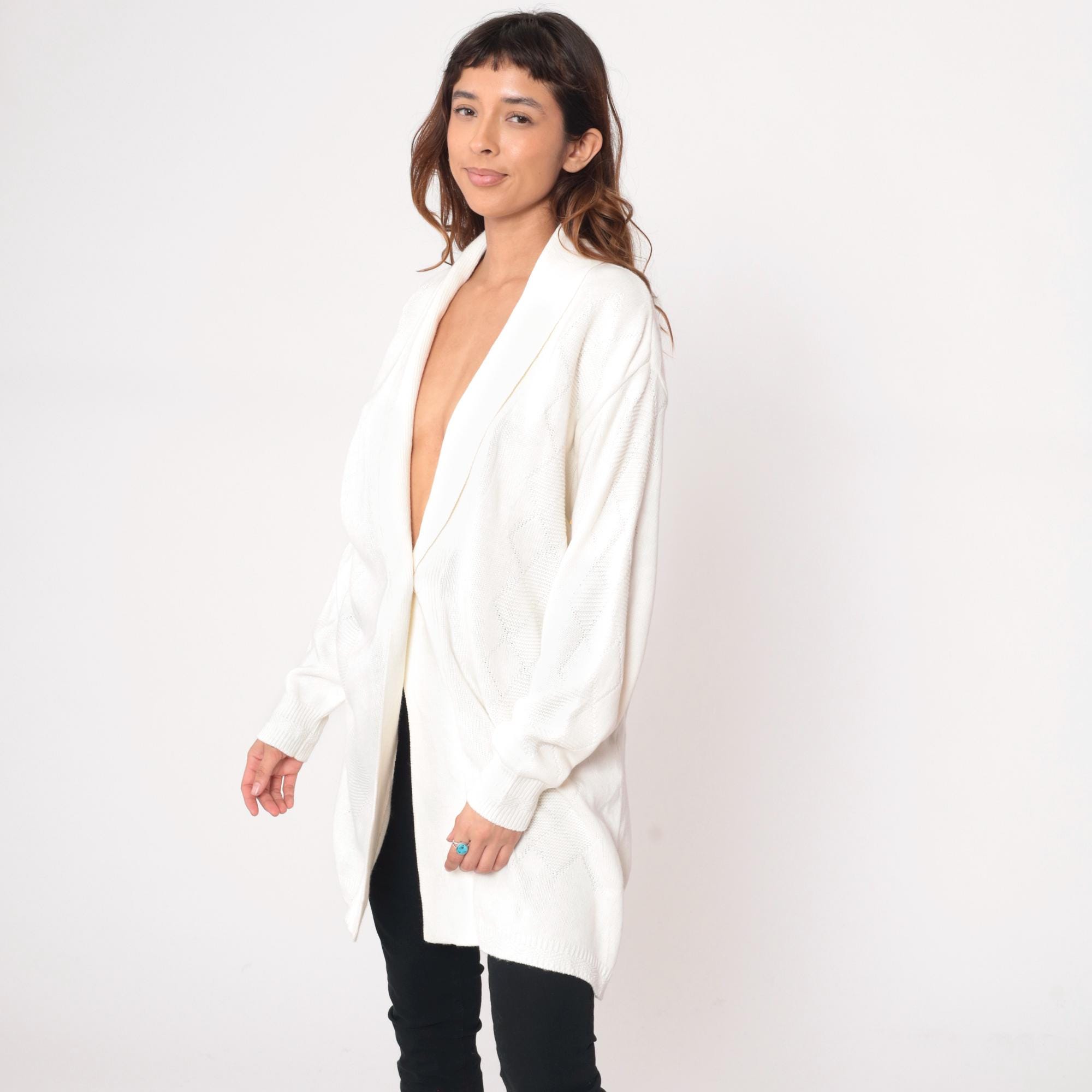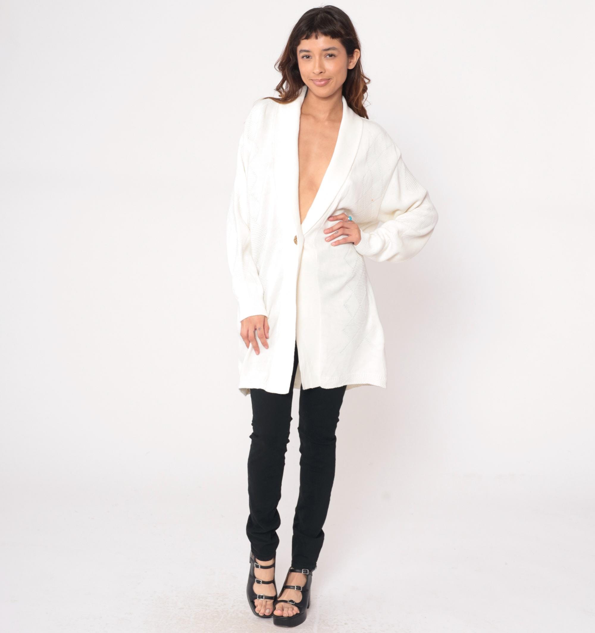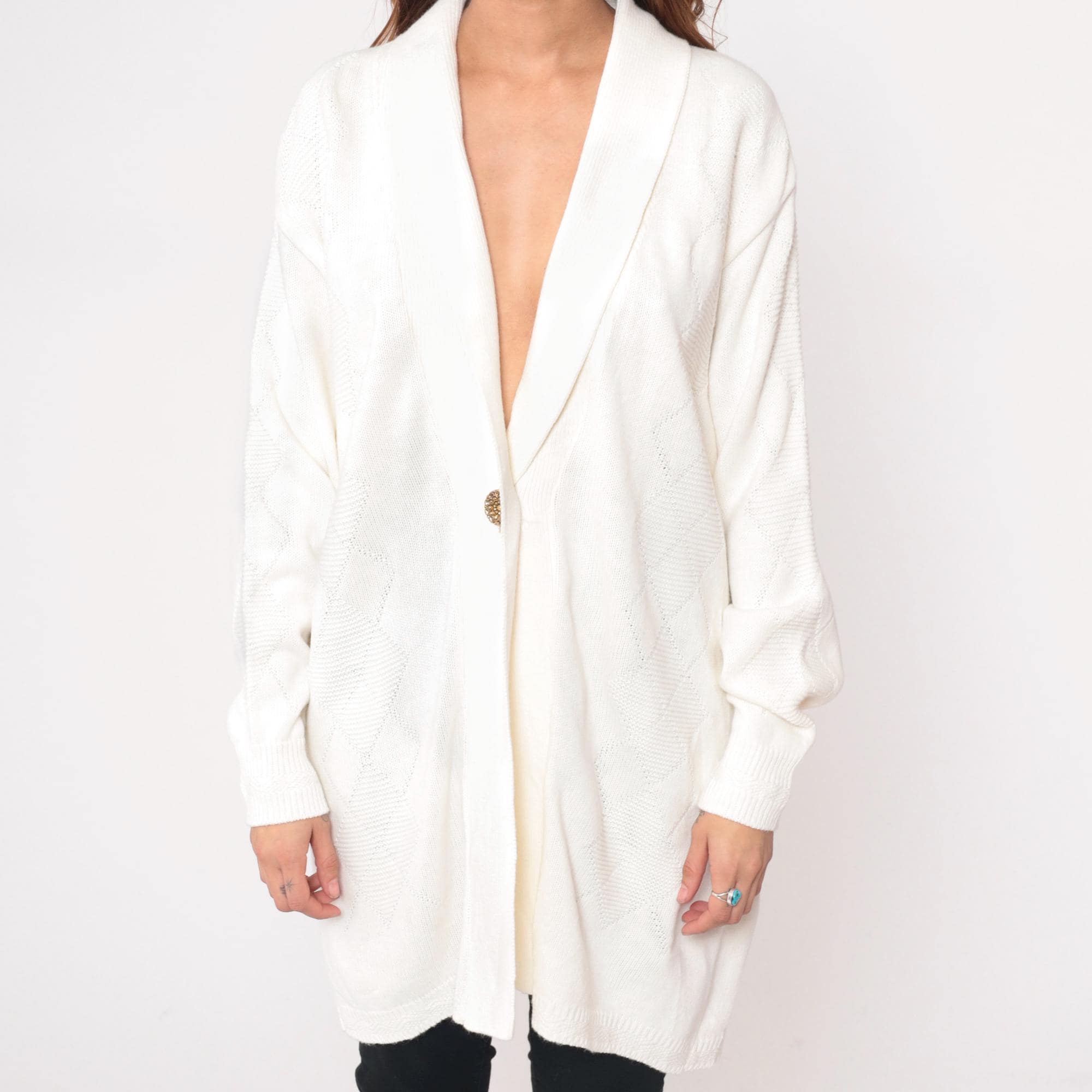80s cream cardigan from Southern Lady with shawl collar and textured cable knit pattern throughout. Longline silhouette with single ornate button closure at center front, long sleeves with ribbed cuffs, ribbed hem.