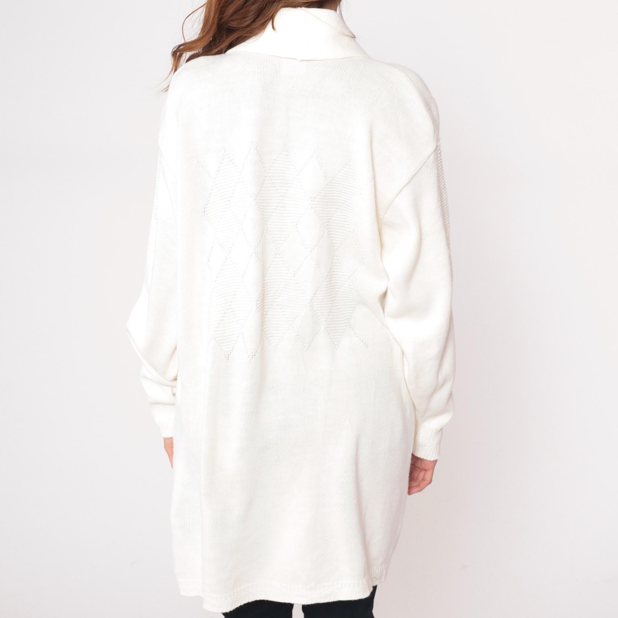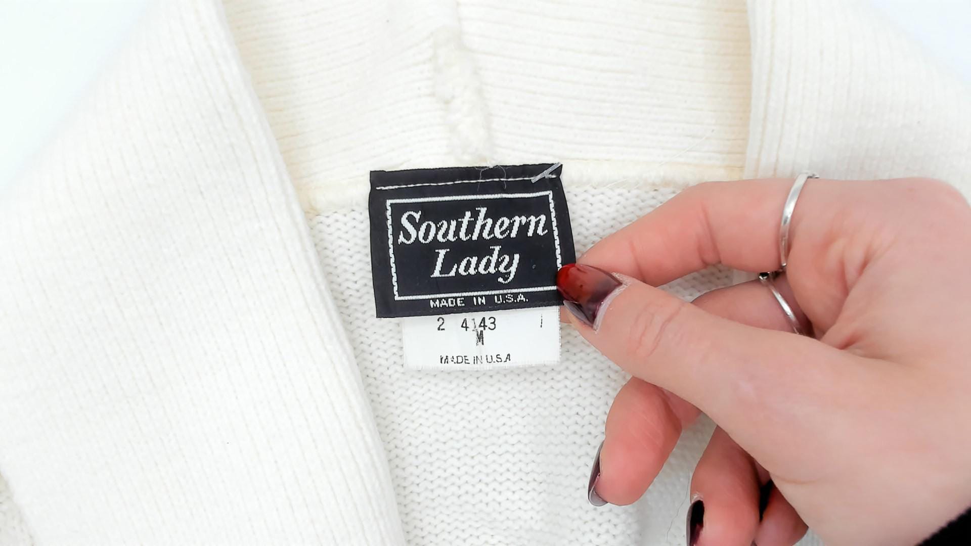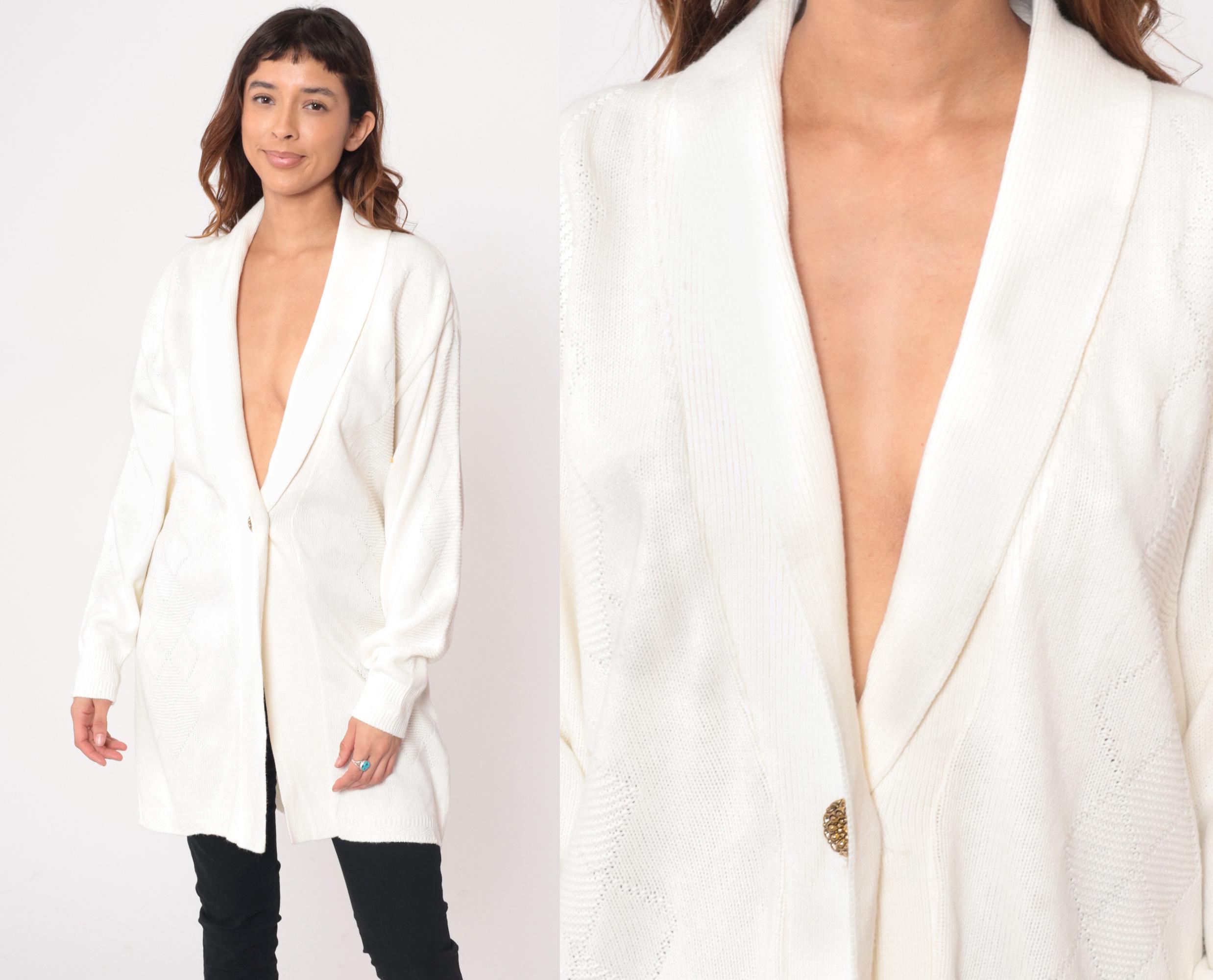 80s cream cardigan from Southern Lady with shawl collar and textured cable knit pattern throughout. Longline silhouette with single ornate button closure at center front, long sleeves with ribbed cuffs, ribbed hem.