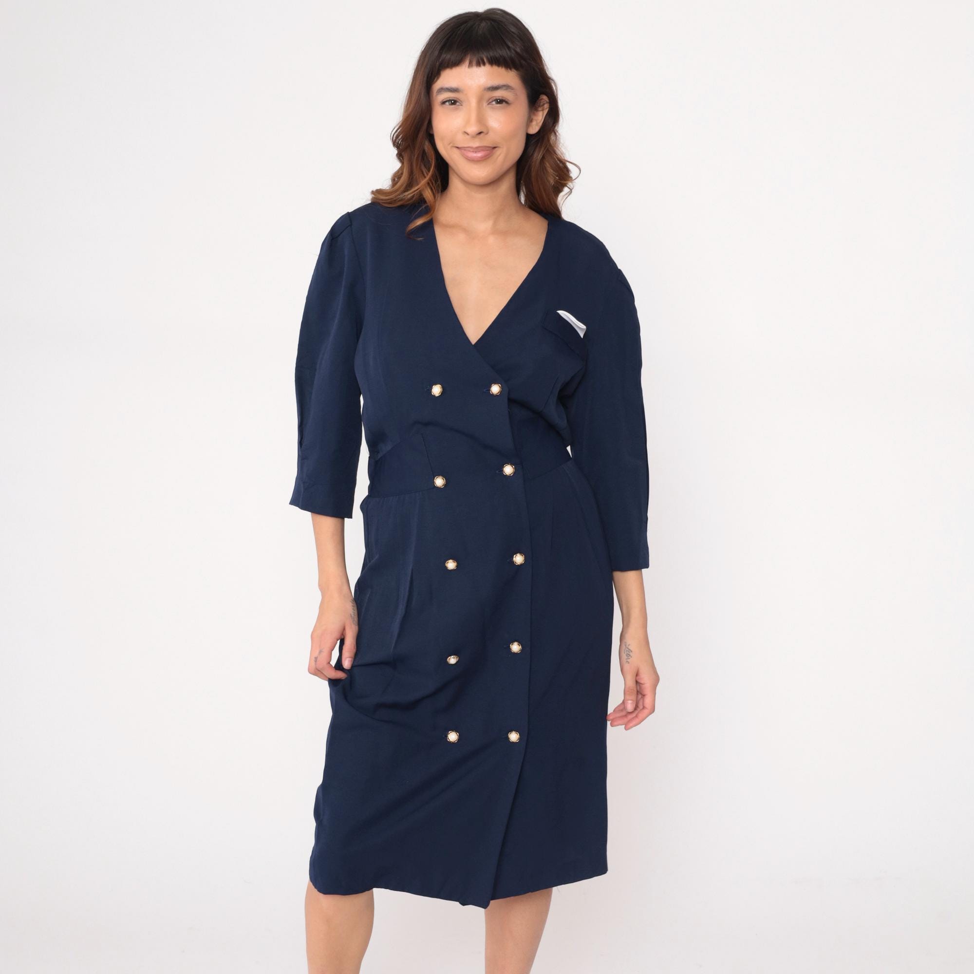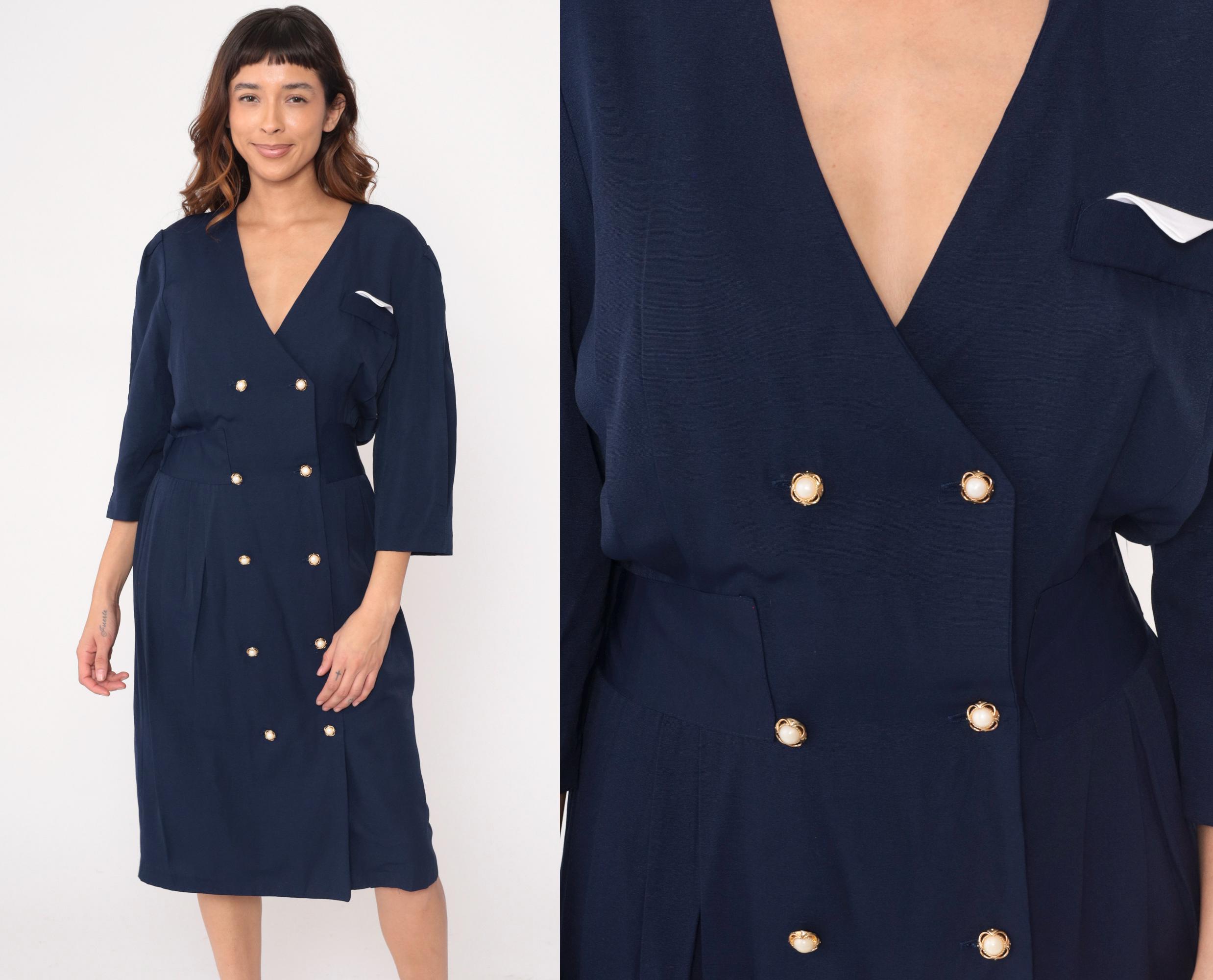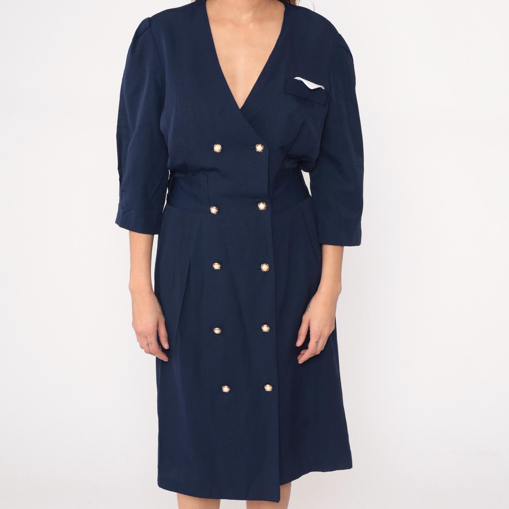 90s navy blue dress from Ms. Basia California with double-breasted button front closure, eight gold and pearl buttons down the center. V-neckline with notched lapel collar, white pocket square detail on left chest, three-quarter length sleeves. Gathered waist at back, knee-length straight skirt.