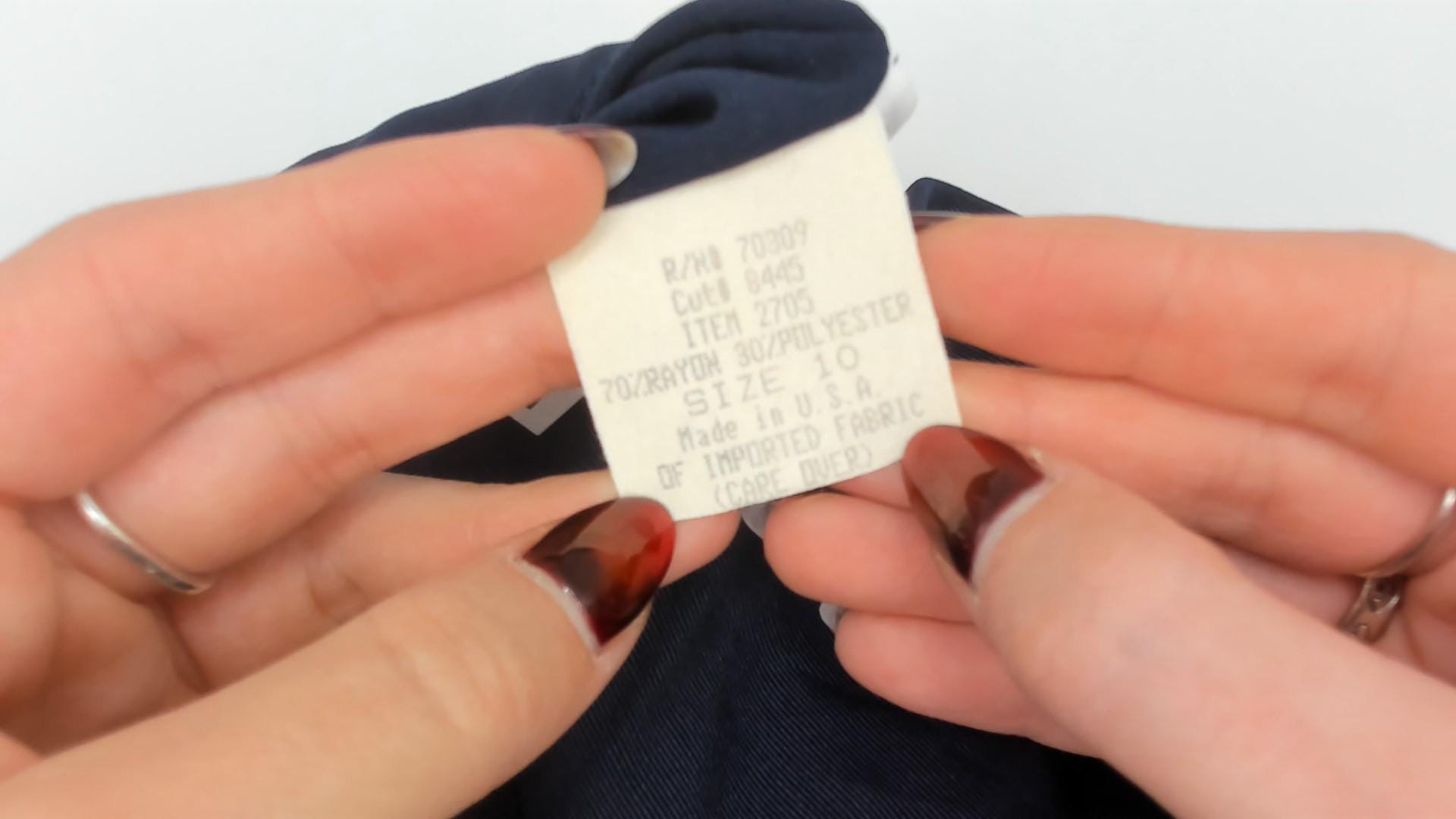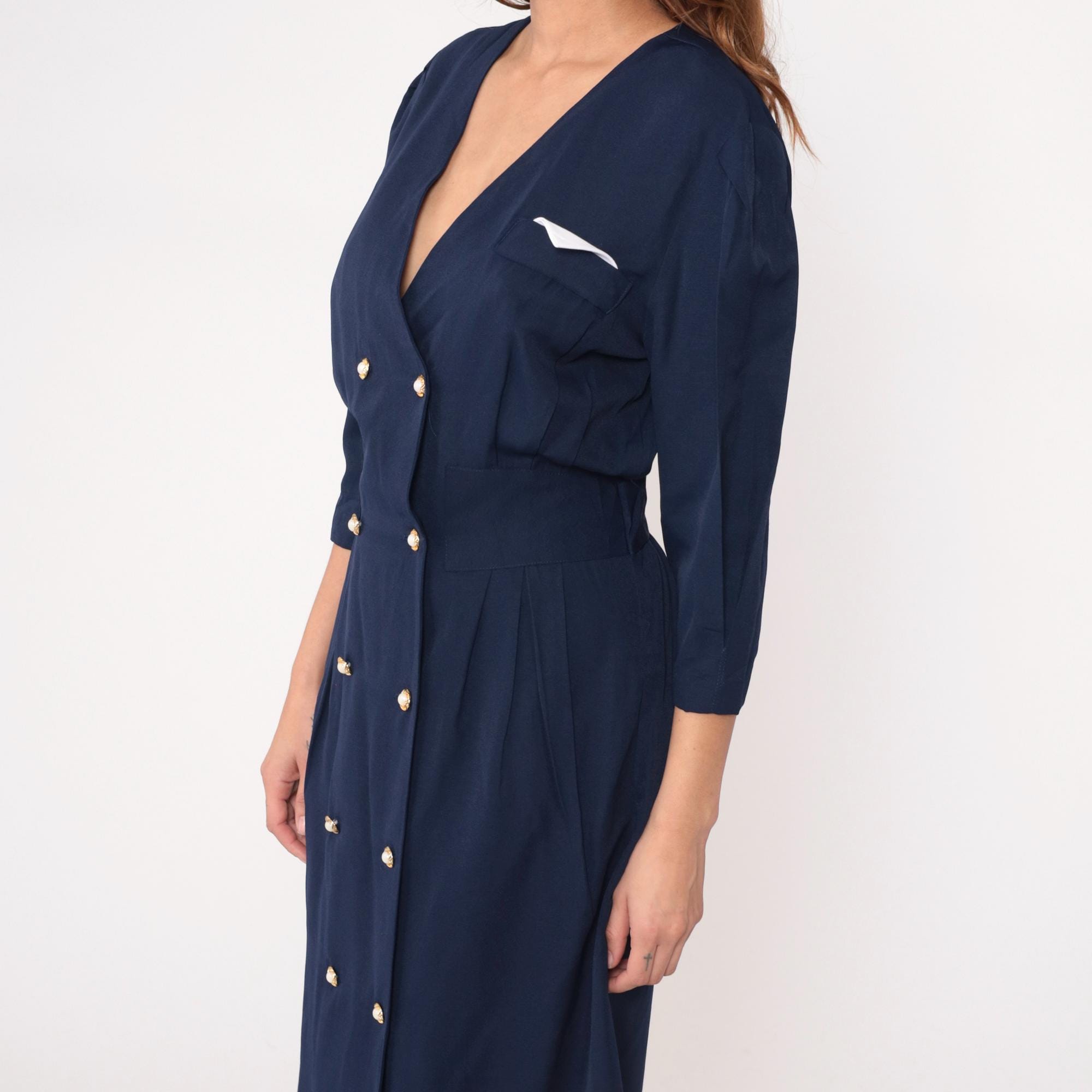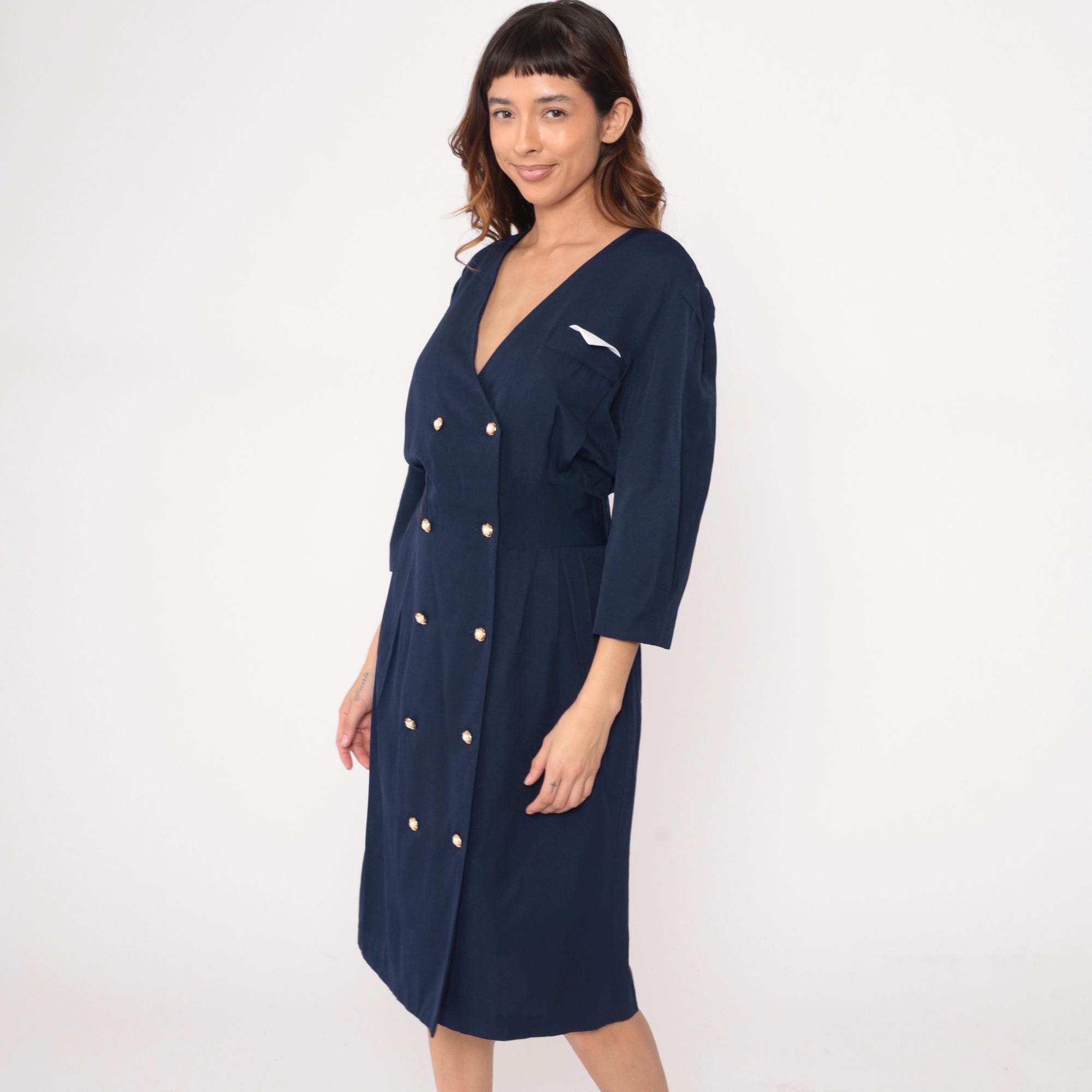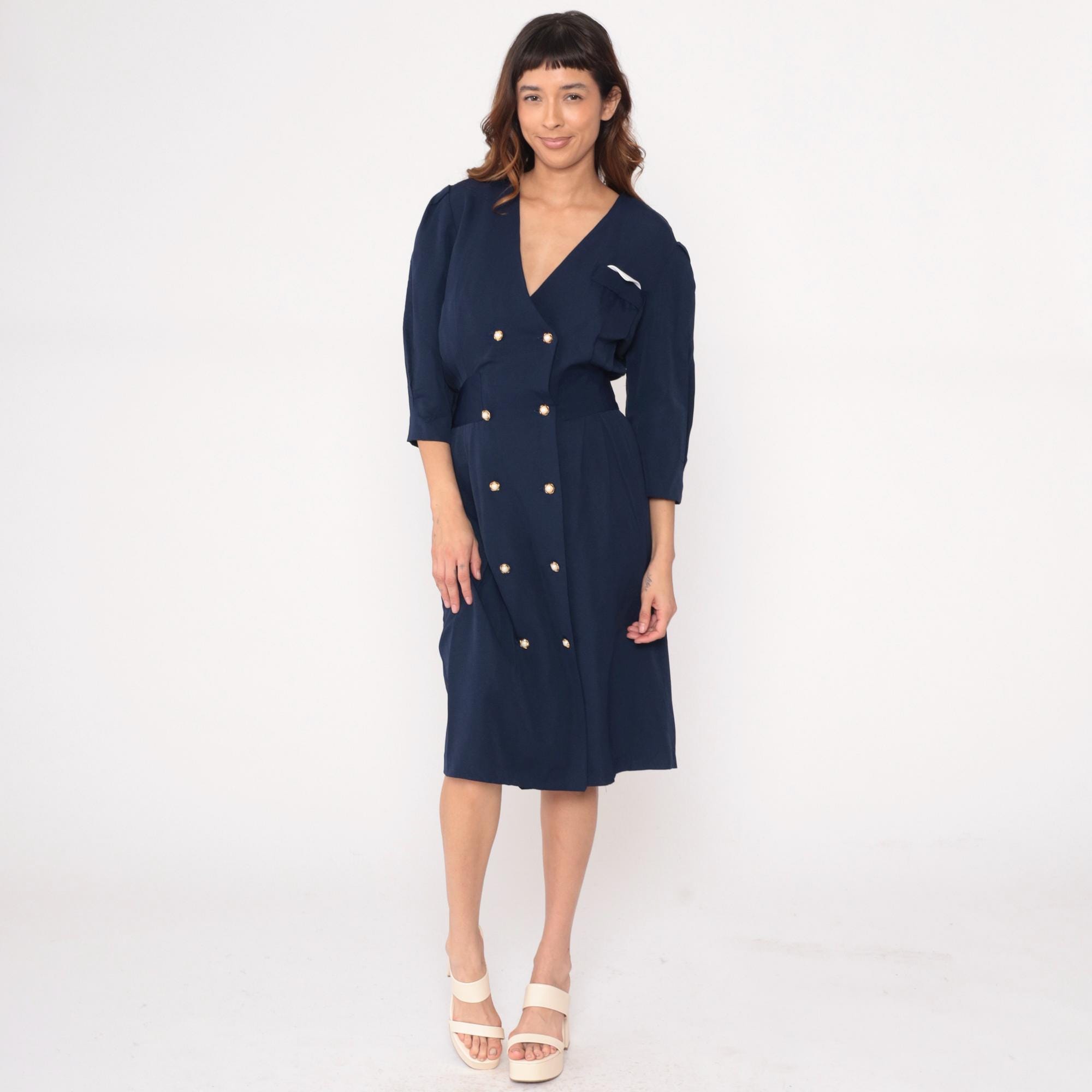 90s navy blue dress from Ms. Basia California with double-breasted button front closure, eight gold and pearl buttons down the center. V-neckline with notched lapel collar, white pocket square detail on left chest, three-quarter length sleeves. Gathered waist at back, knee-length straight skirt.