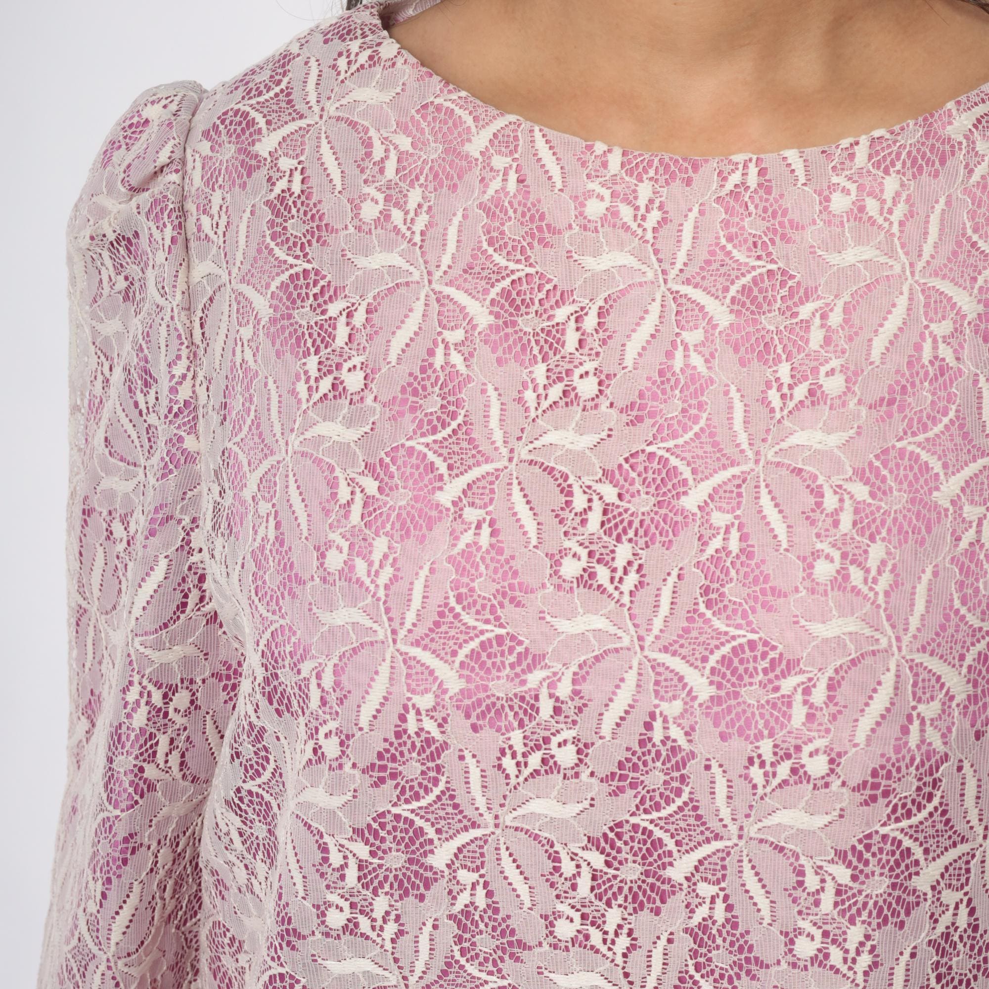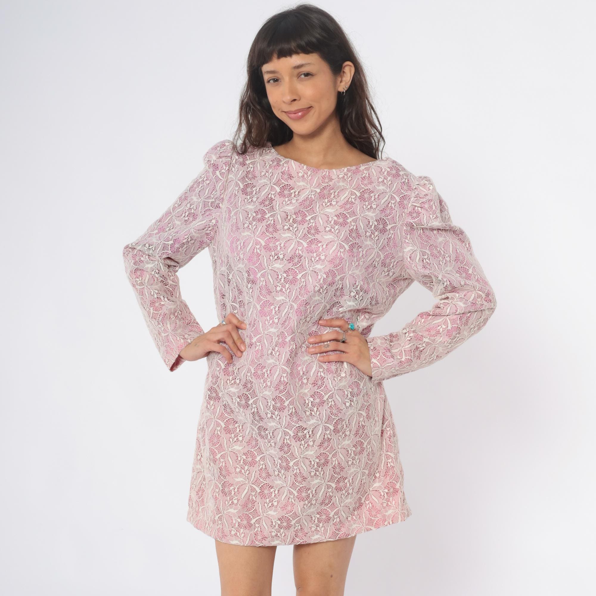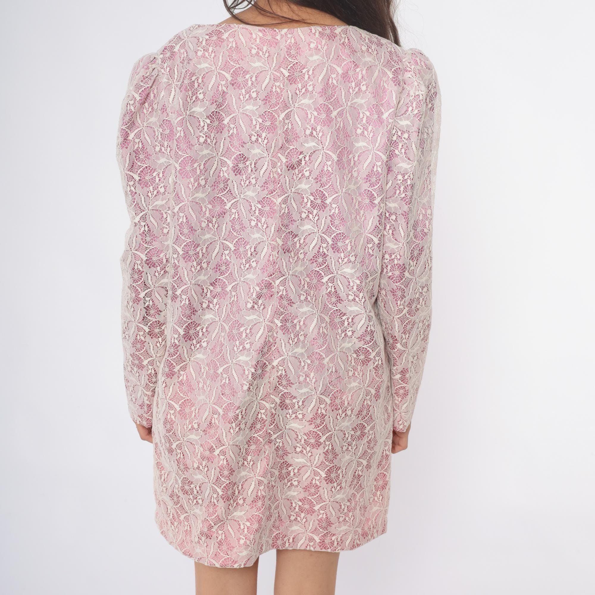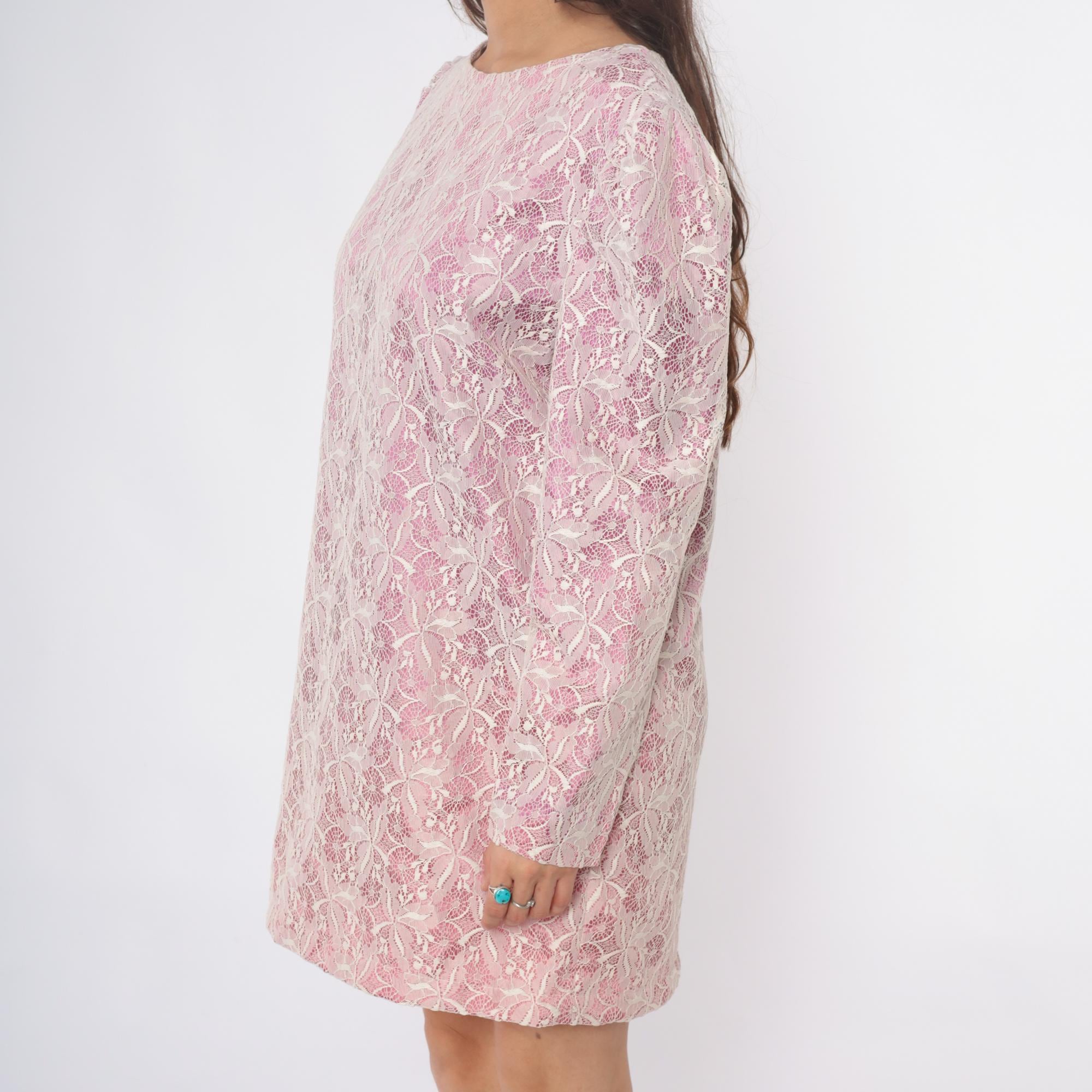 70s purple and white floral lace mini dress with long sleeves and straight shift silhouette. Allover delicate lace in a floral pattern with pink lining visible beneath the white lace overlay. Pullover style with no closure.
