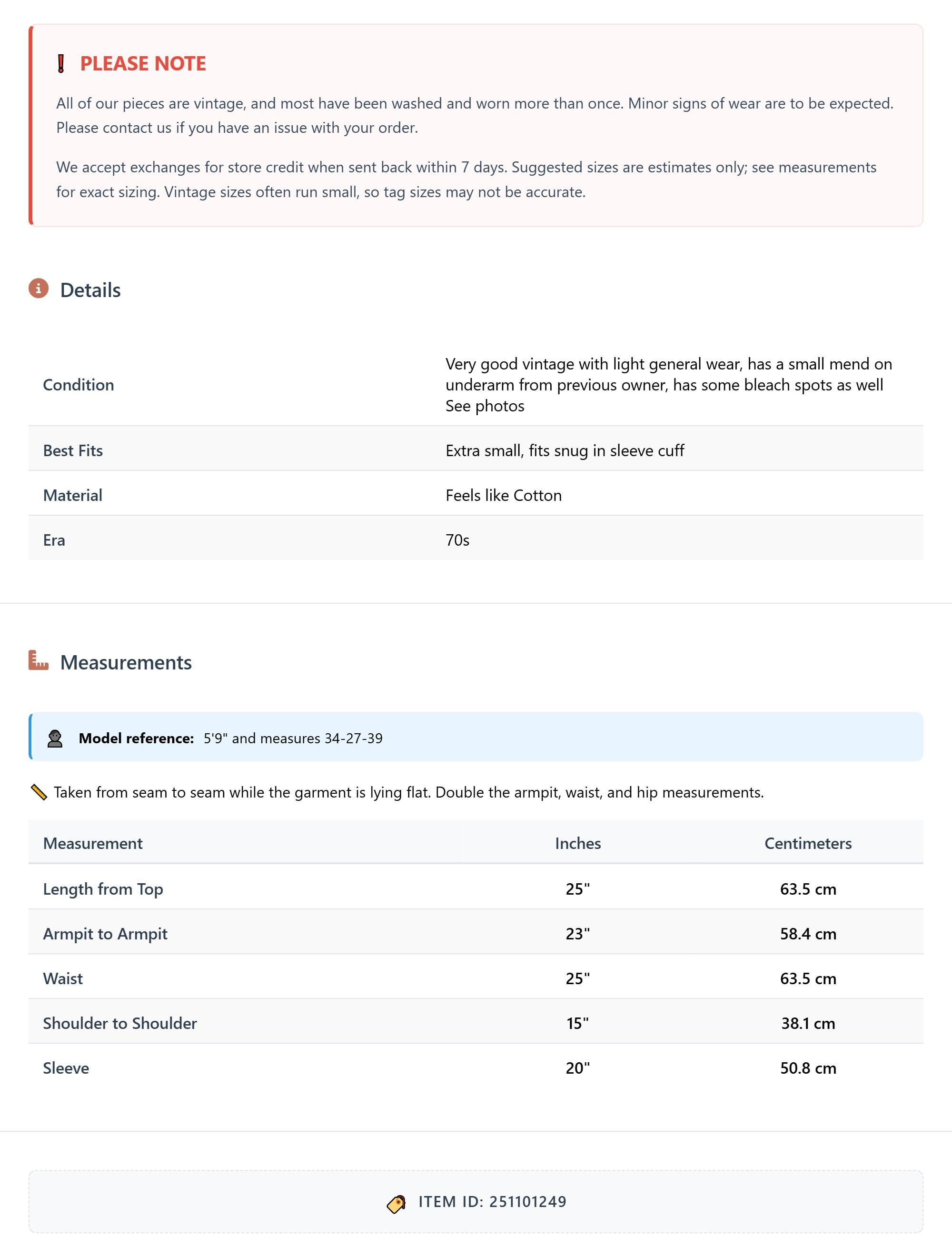 Condition: Very good vintage with light general wear, has a small mend on underarm from previous owner, has some bleach spots as well See photos
