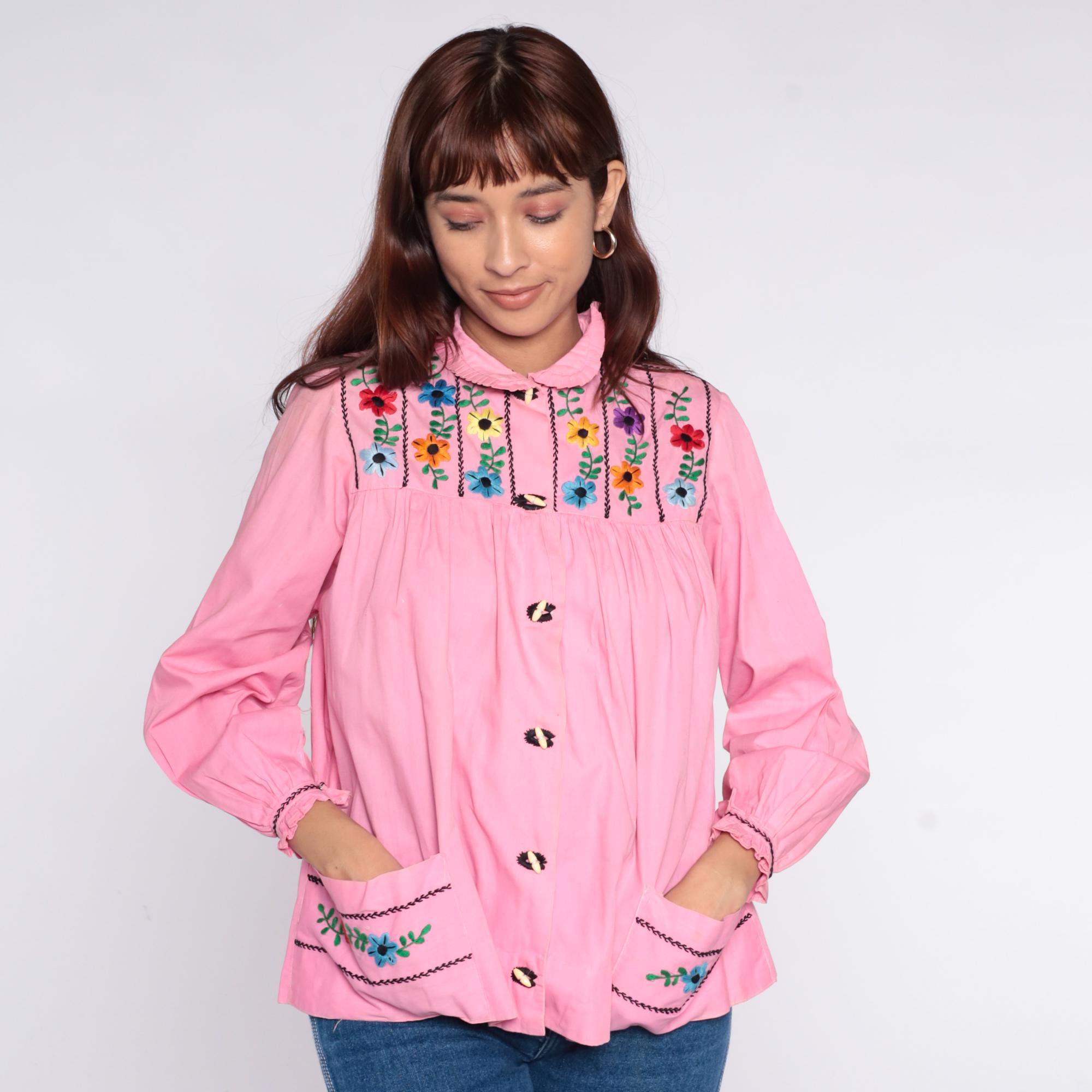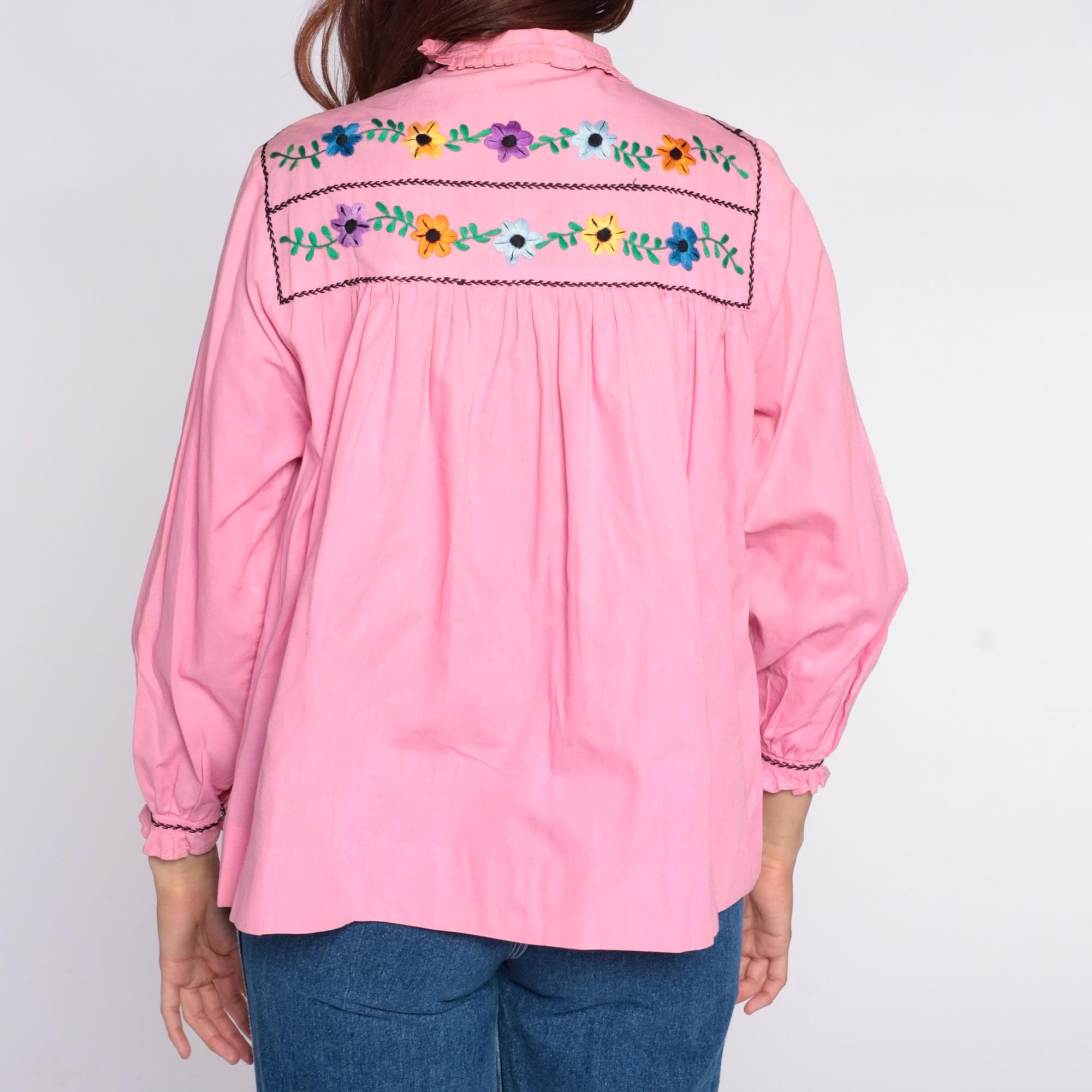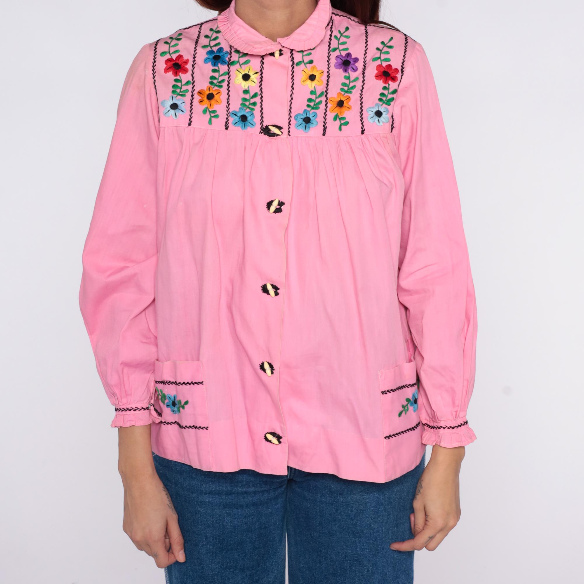 70s pink embroidered blouse with colorful floral embroidery and black chain stitch trim across front and back yoke. Peter pan collar with ruffle trim, button front closure with decorative buttons, long sleeves with ruffle cuffs and embroidered floral detail. Gathered bodice below embroidered yoke.