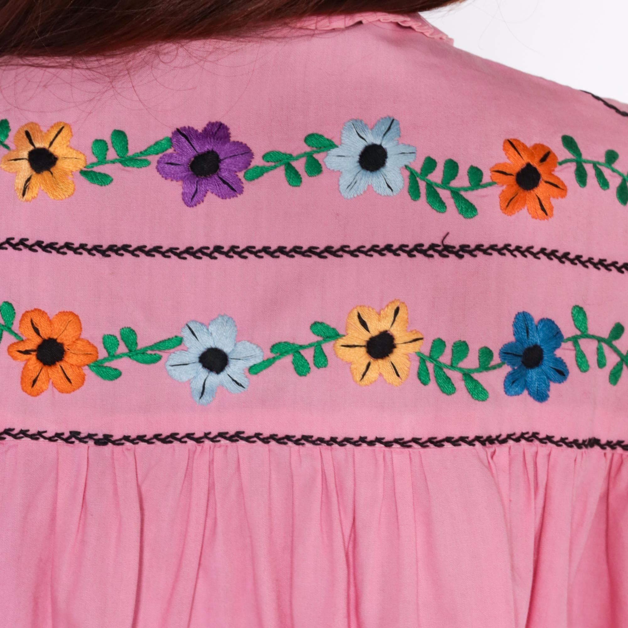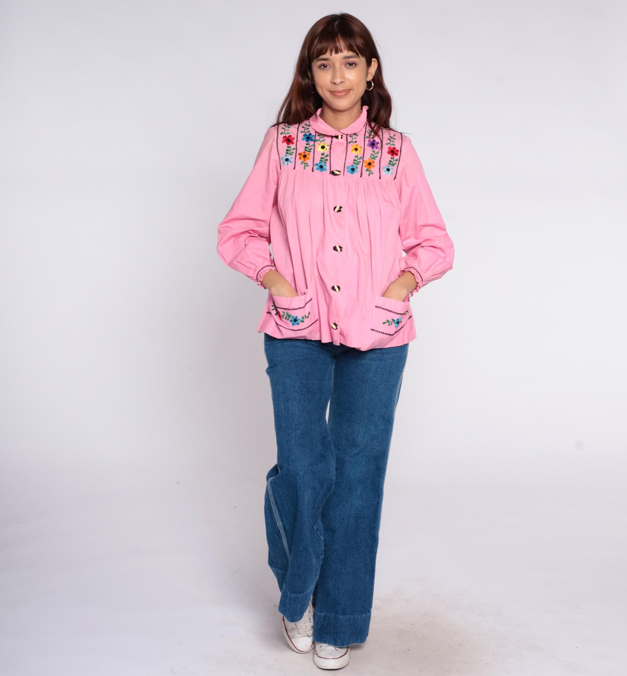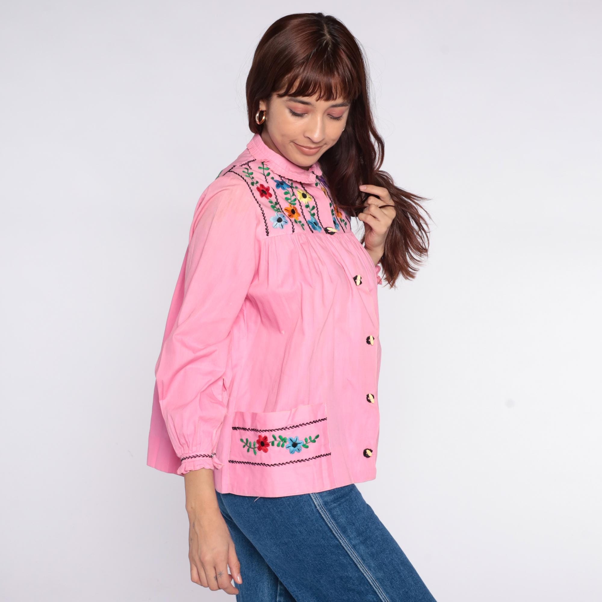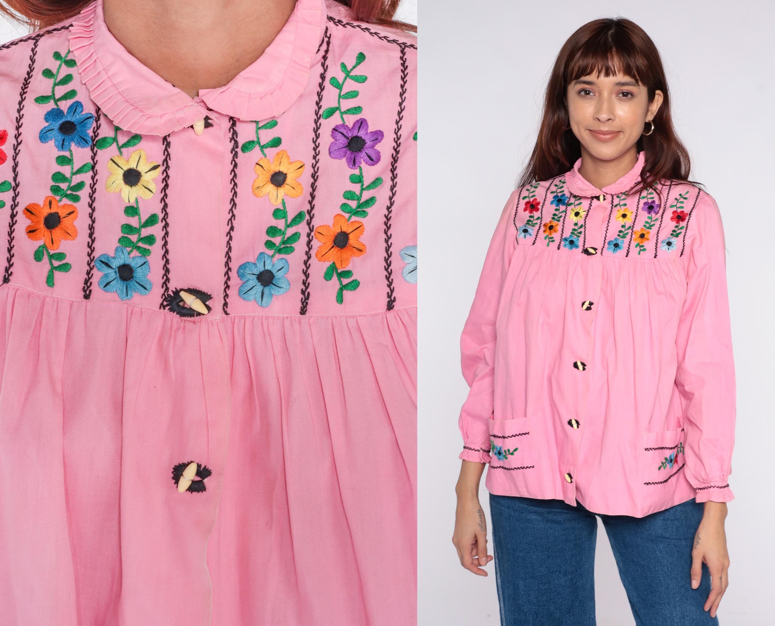 70s pink embroidered blouse with colorful floral embroidery and black chain stitch trim across front and back yoke. Peter pan collar with ruffle trim, button front closure with decorative buttons, long sleeves with ruffle cuffs and embroidered floral detail. Gathered bodice below embroidered yoke.