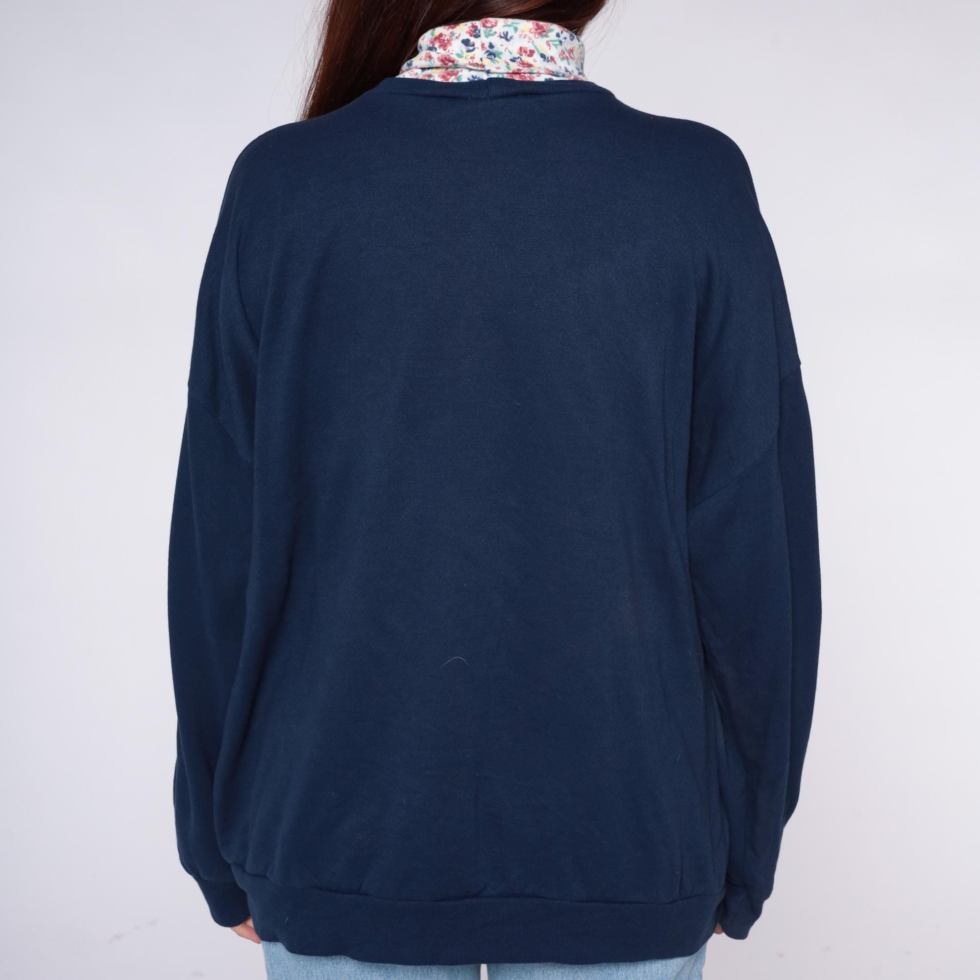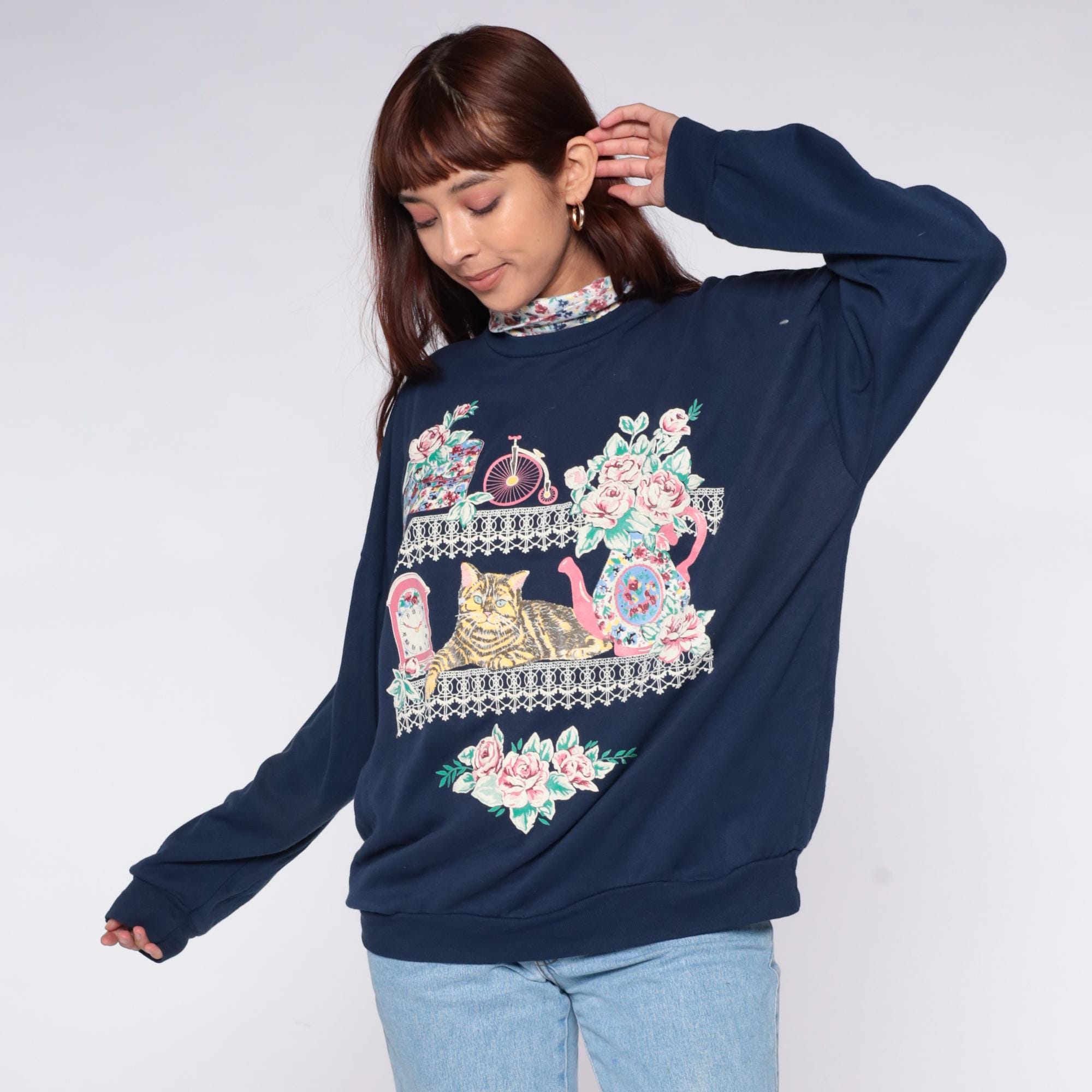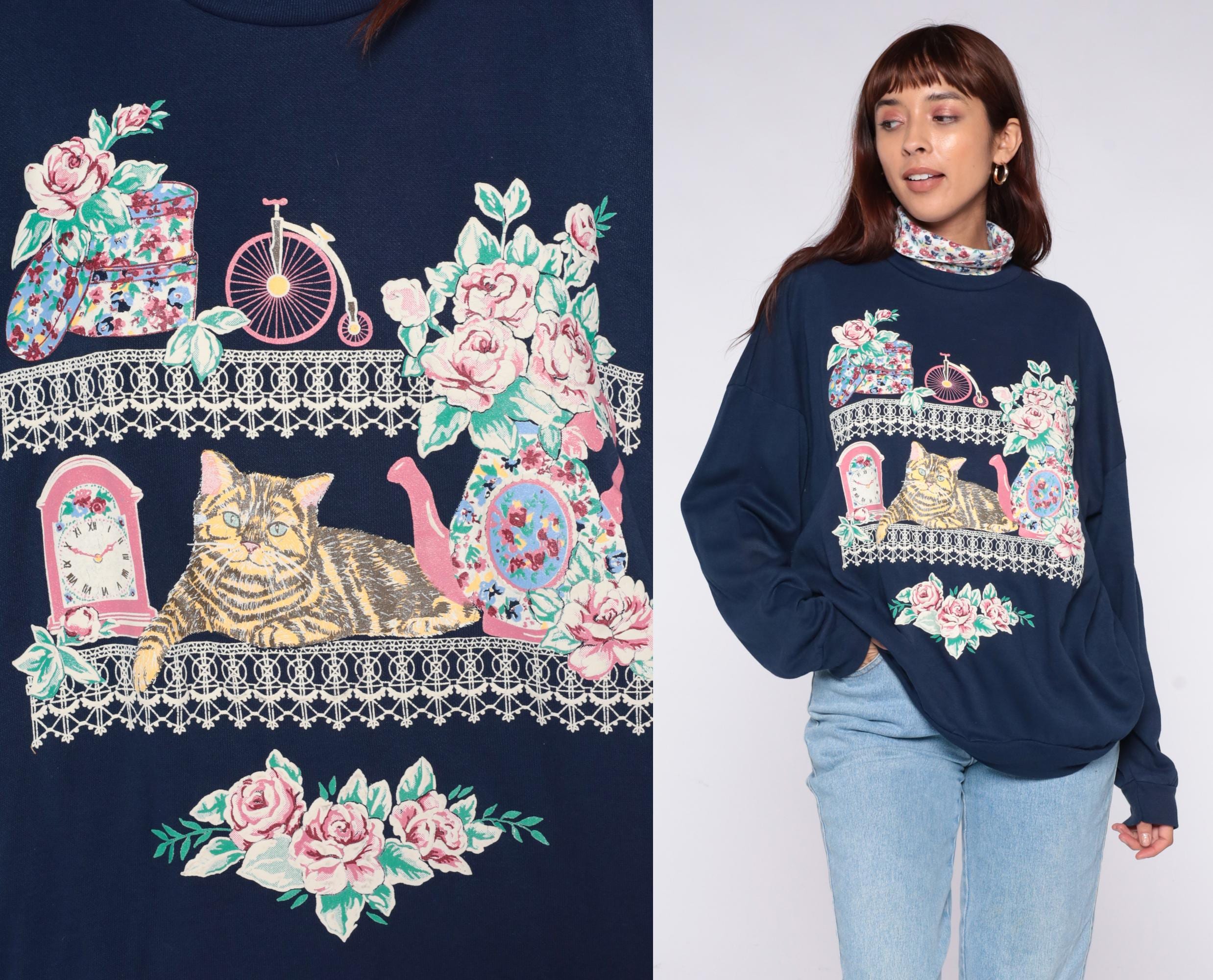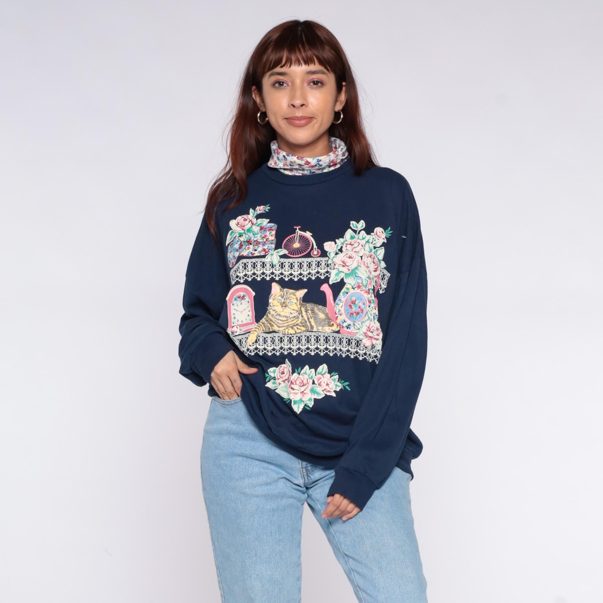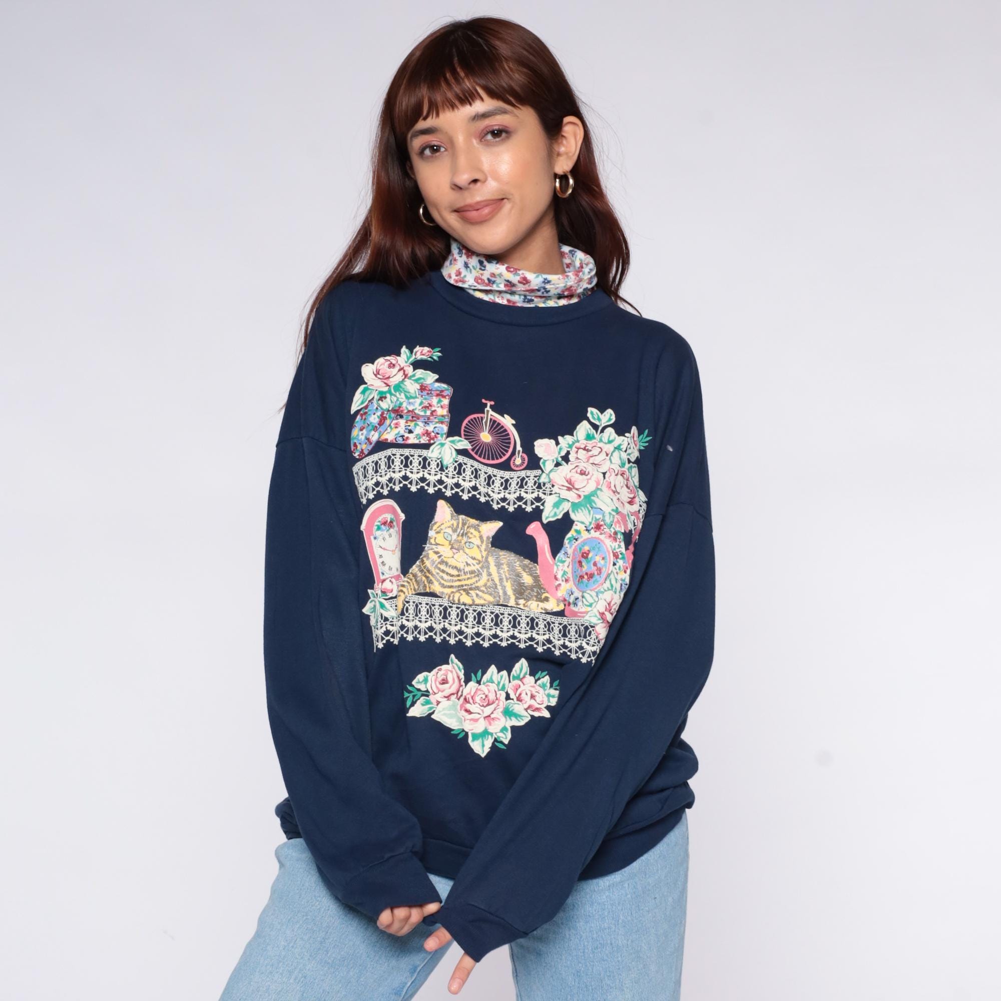 90s navy blue sweatshirt from Act 3 with graphic print across the front depicting a tabby cat surrounded by pink roses, vintage penny-farthing bicycle, ornate clock, mirror, and decorative lace trim borders. Attached floral print turtleneck in pink, blue, and green florals.