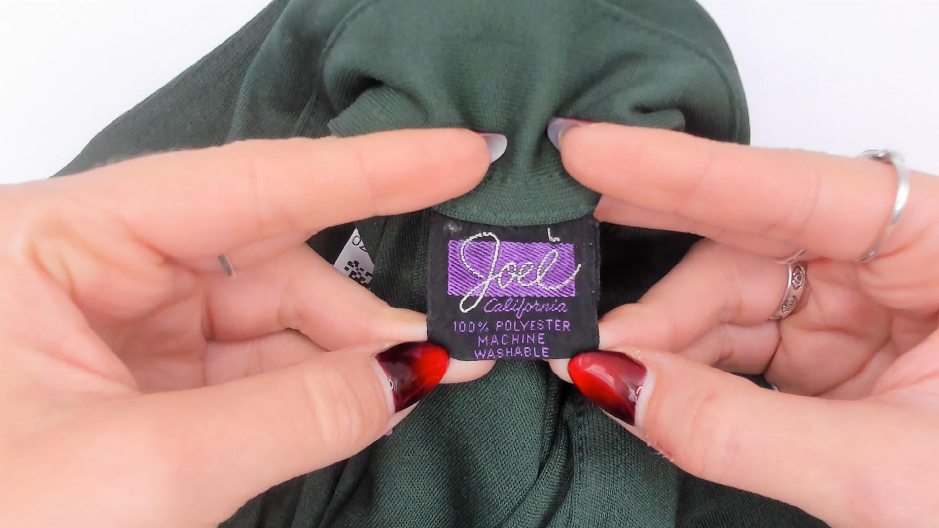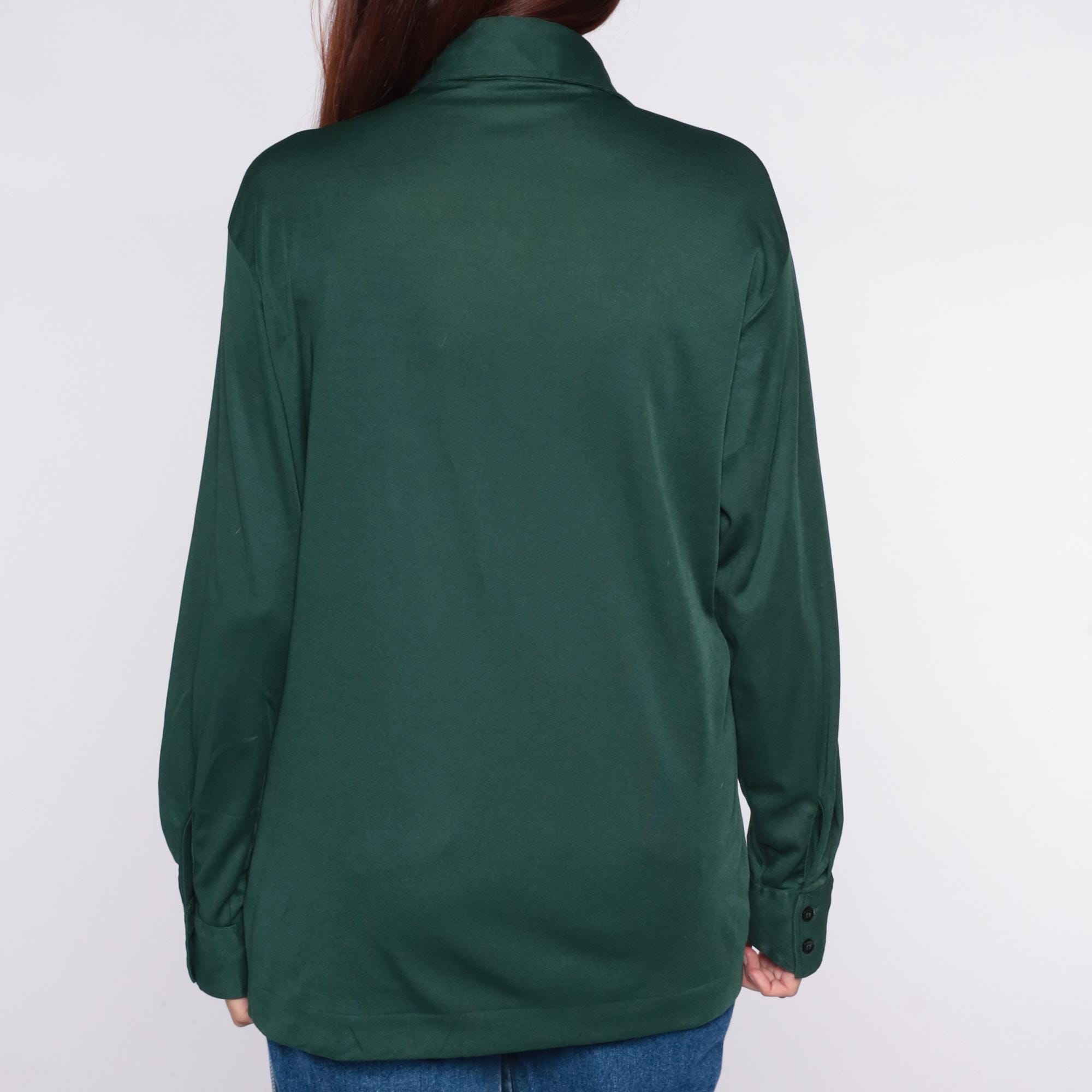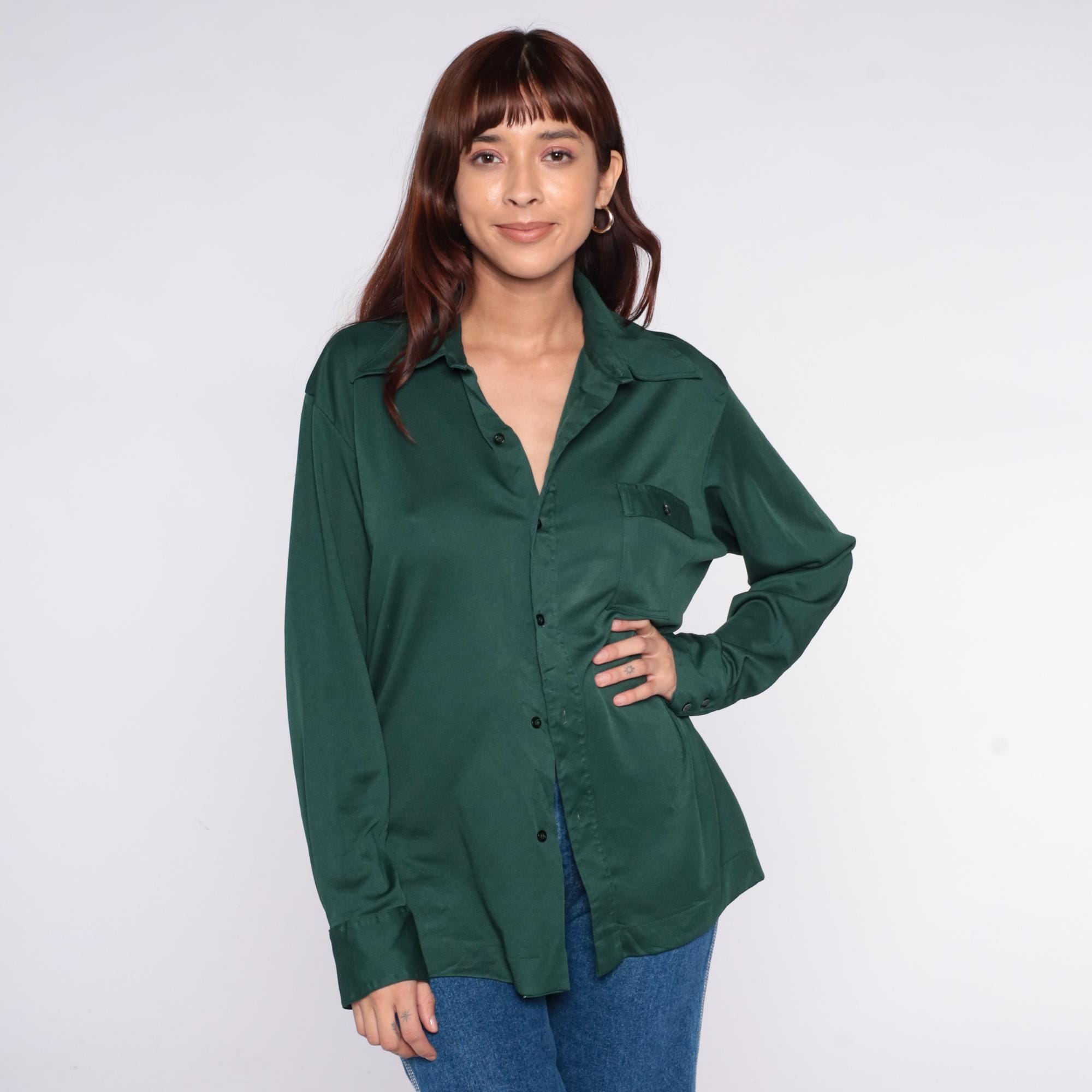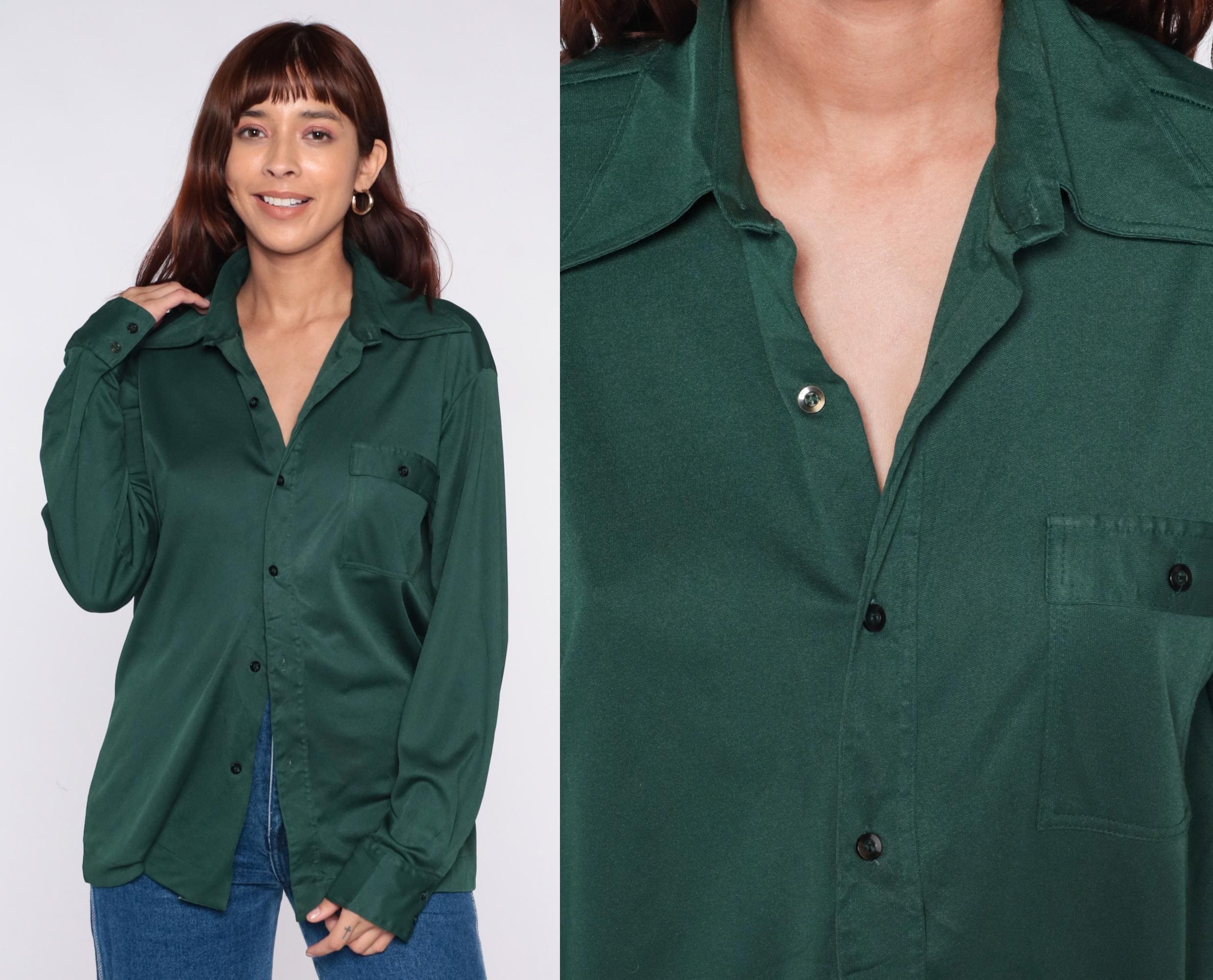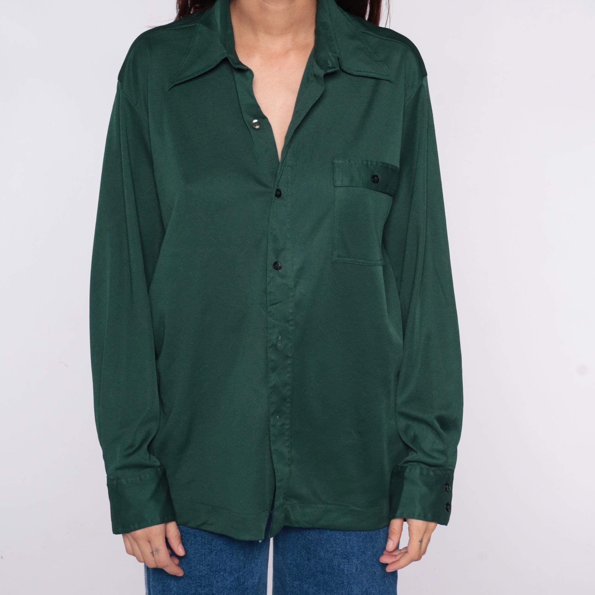 70s green button front shirt from Joel with long sleeves, button cuffs, and single chest pocket. Forest green color throughout with standard collar and full button closure.