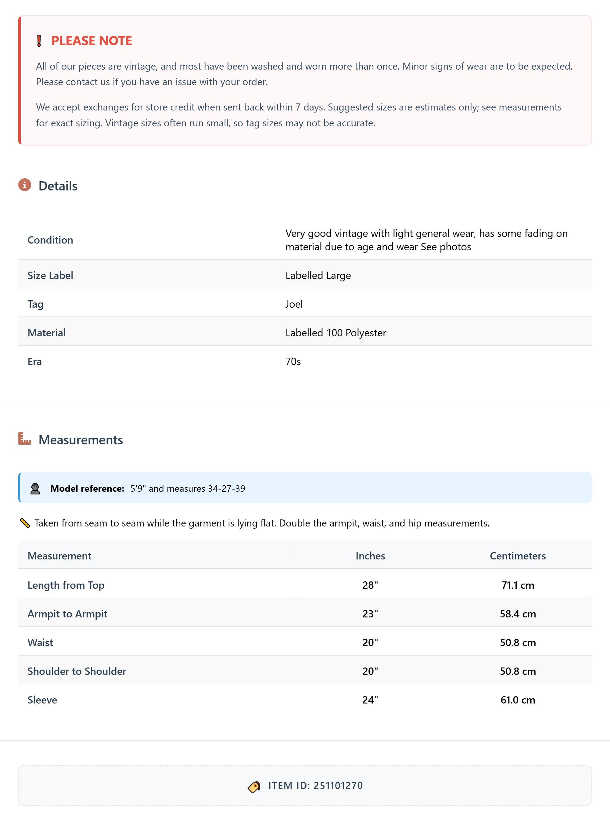 All of our pieces are vintage, and most have been washed and worn more than once. Minor signs of wear are to be expected. Please contact us if you have an issue with your order. We accept exchanges for store credit when sent back within 7 days.