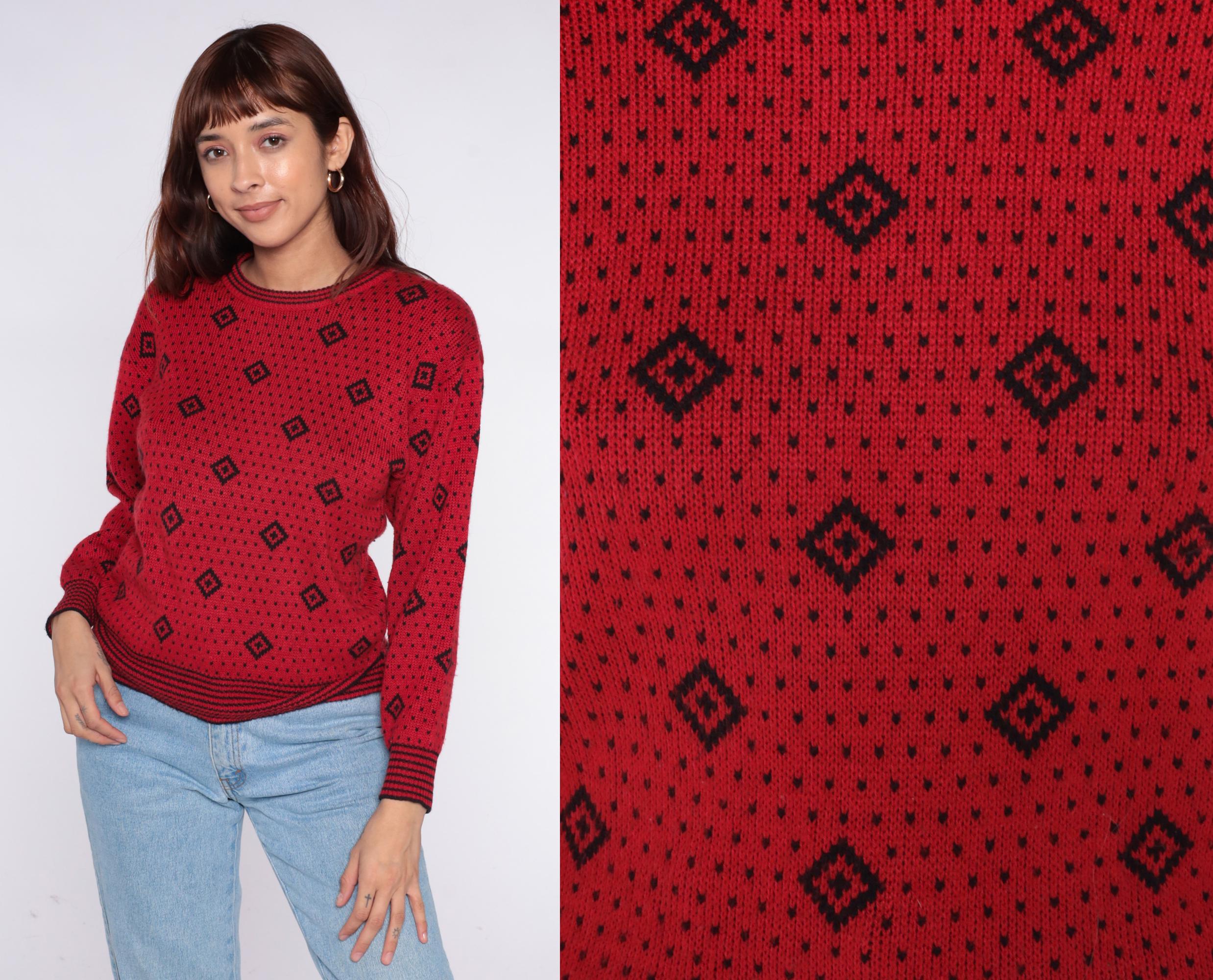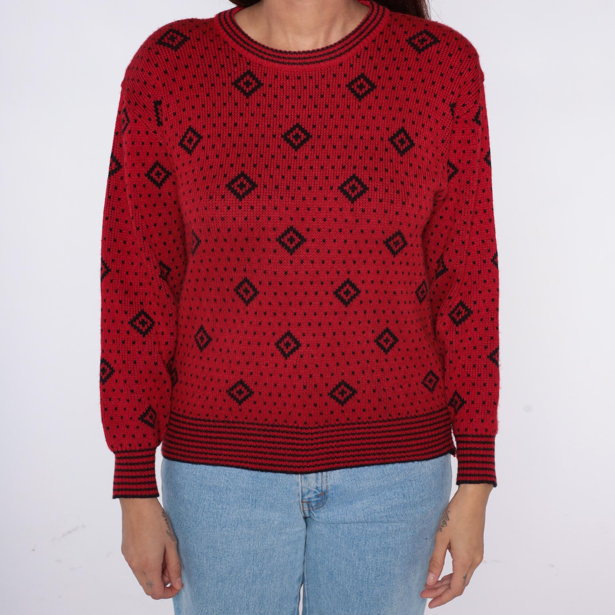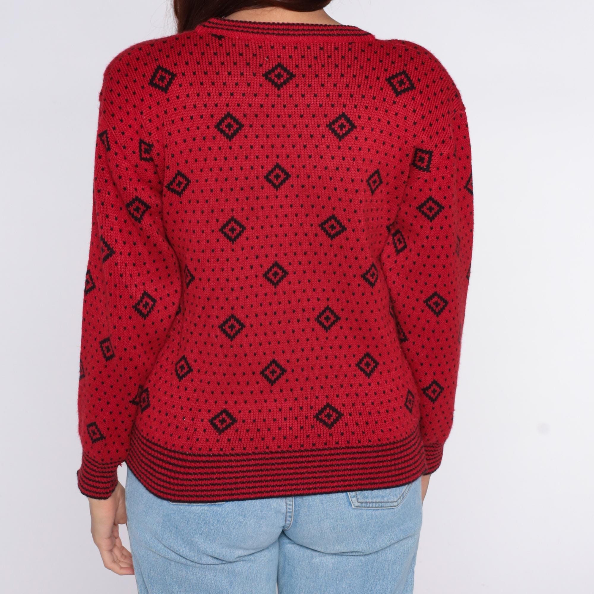 80s red sweater with black geometric diamond pattern and dotted detail throughout. Ribbed crew neckline, long sleeves, ribbed cuffs and hem with black horizontal stripes.