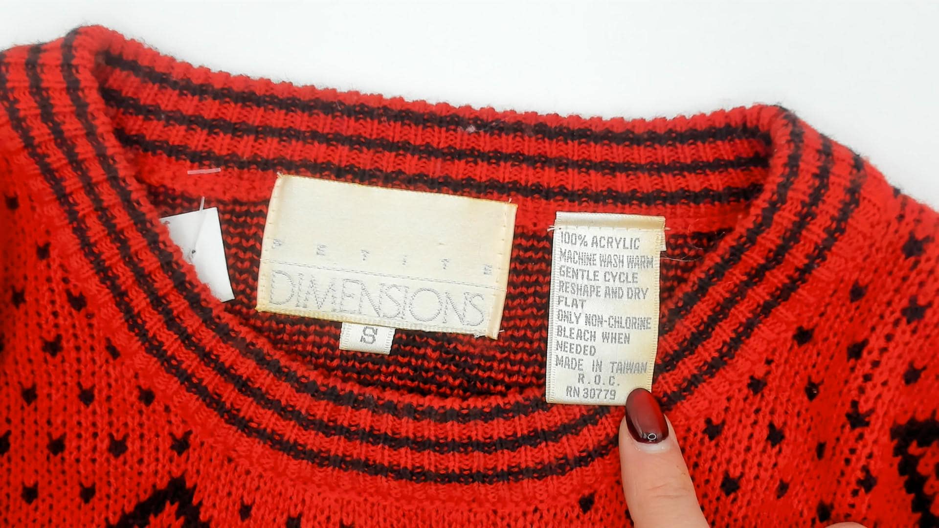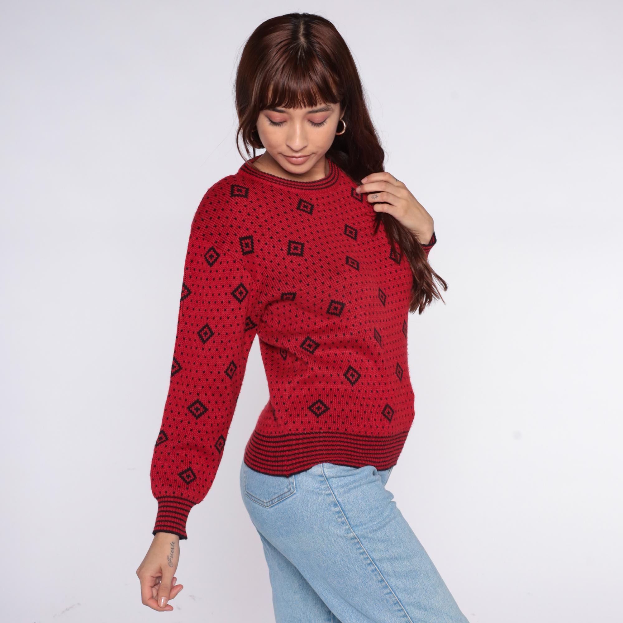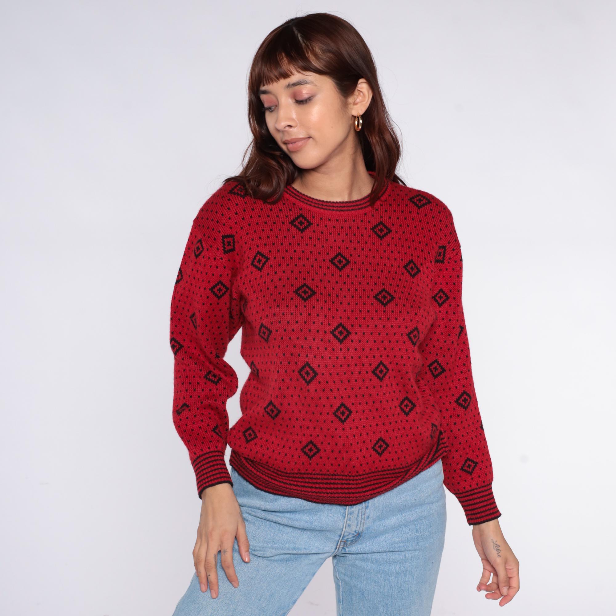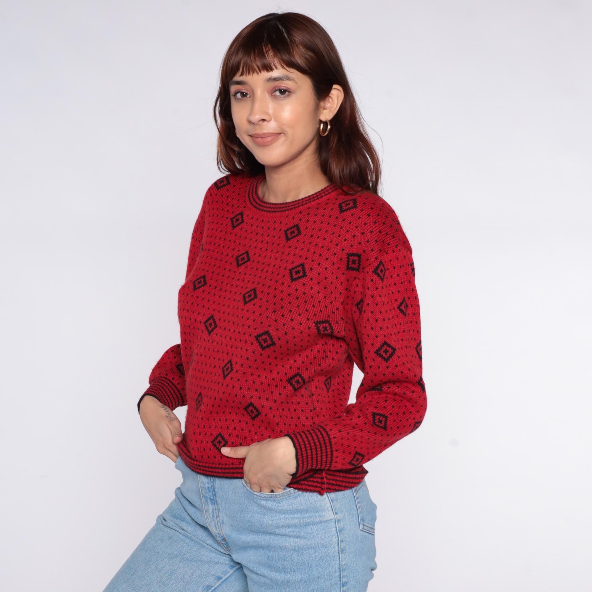 80s red sweater with black geometric diamond pattern and dotted detail throughout. Ribbed crew neckline, long sleeves, ribbed cuffs and hem with black horizontal stripes.