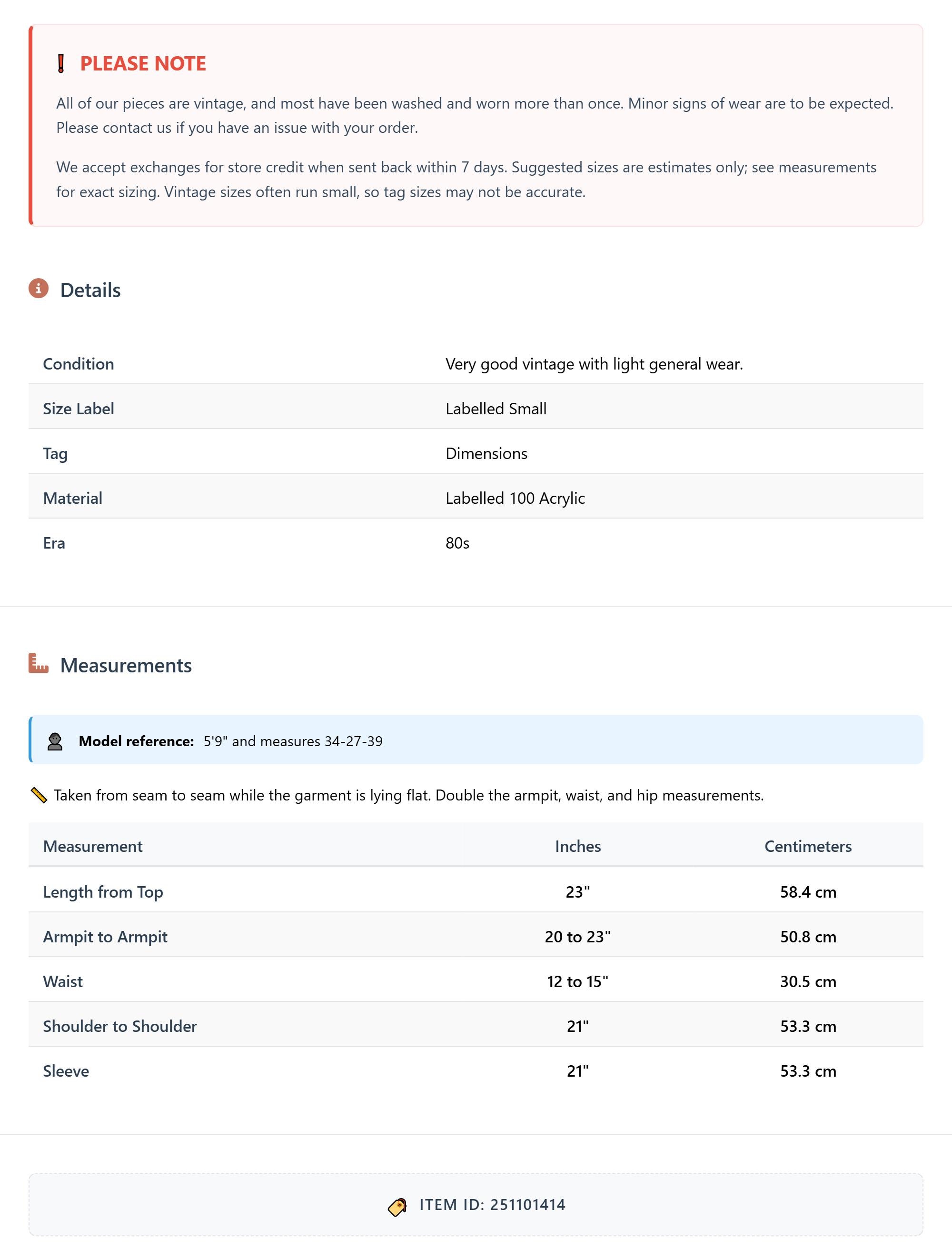 All of our pieces are vintage, and most have been washed and worn more than once. Minor signs of wear are to be expected. Please contact us if you have an issue with your order. We accept exchanges for store credit when sent back within 7 days.