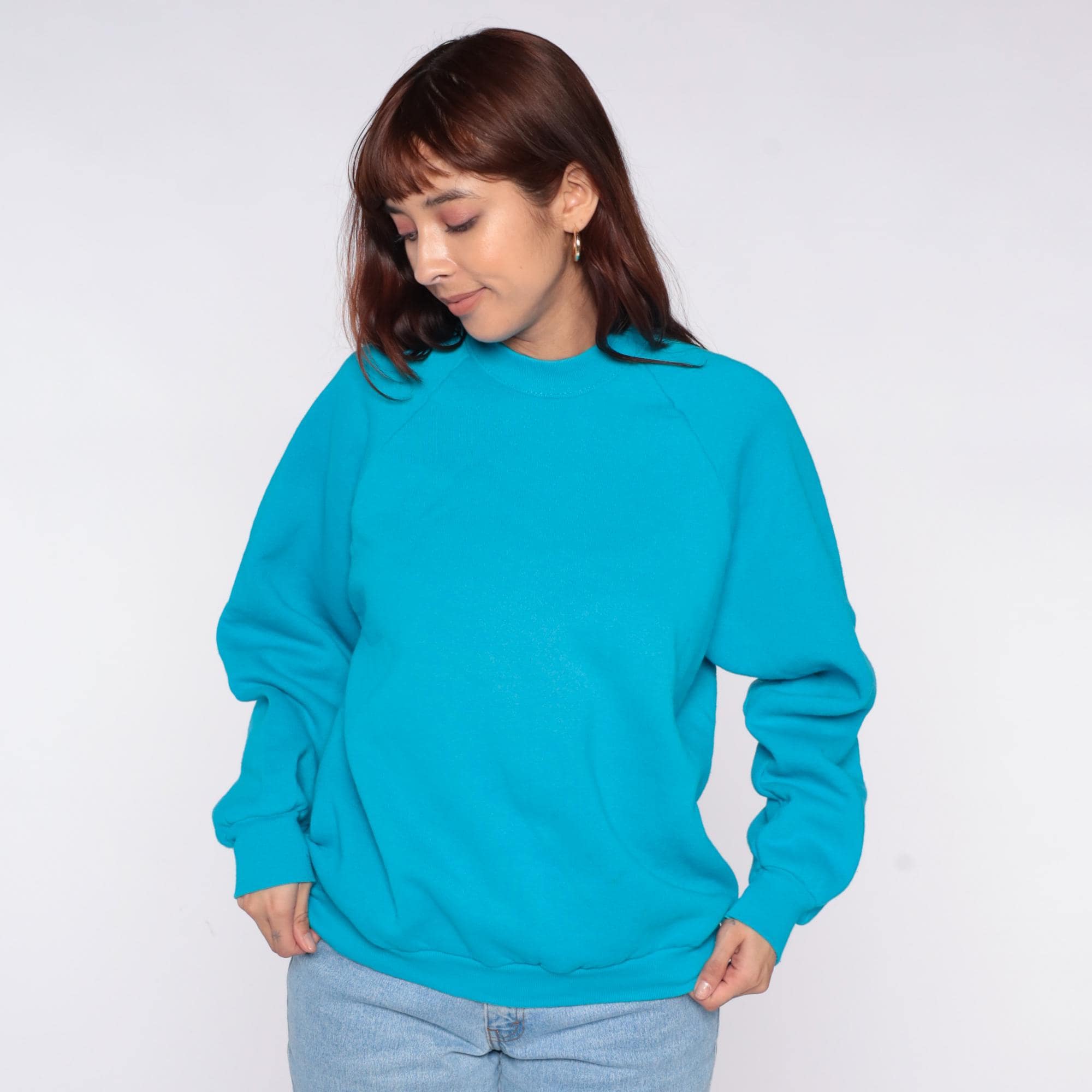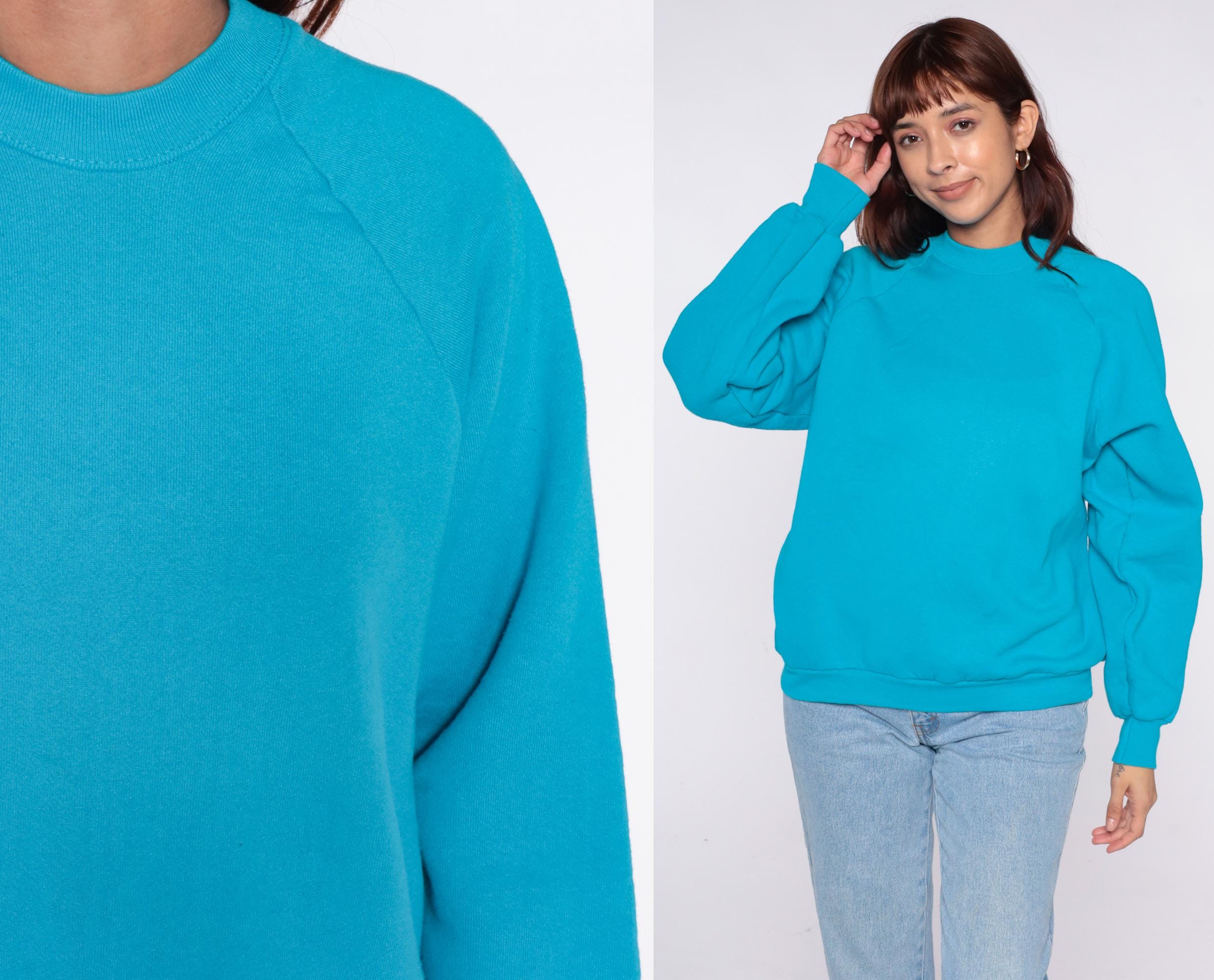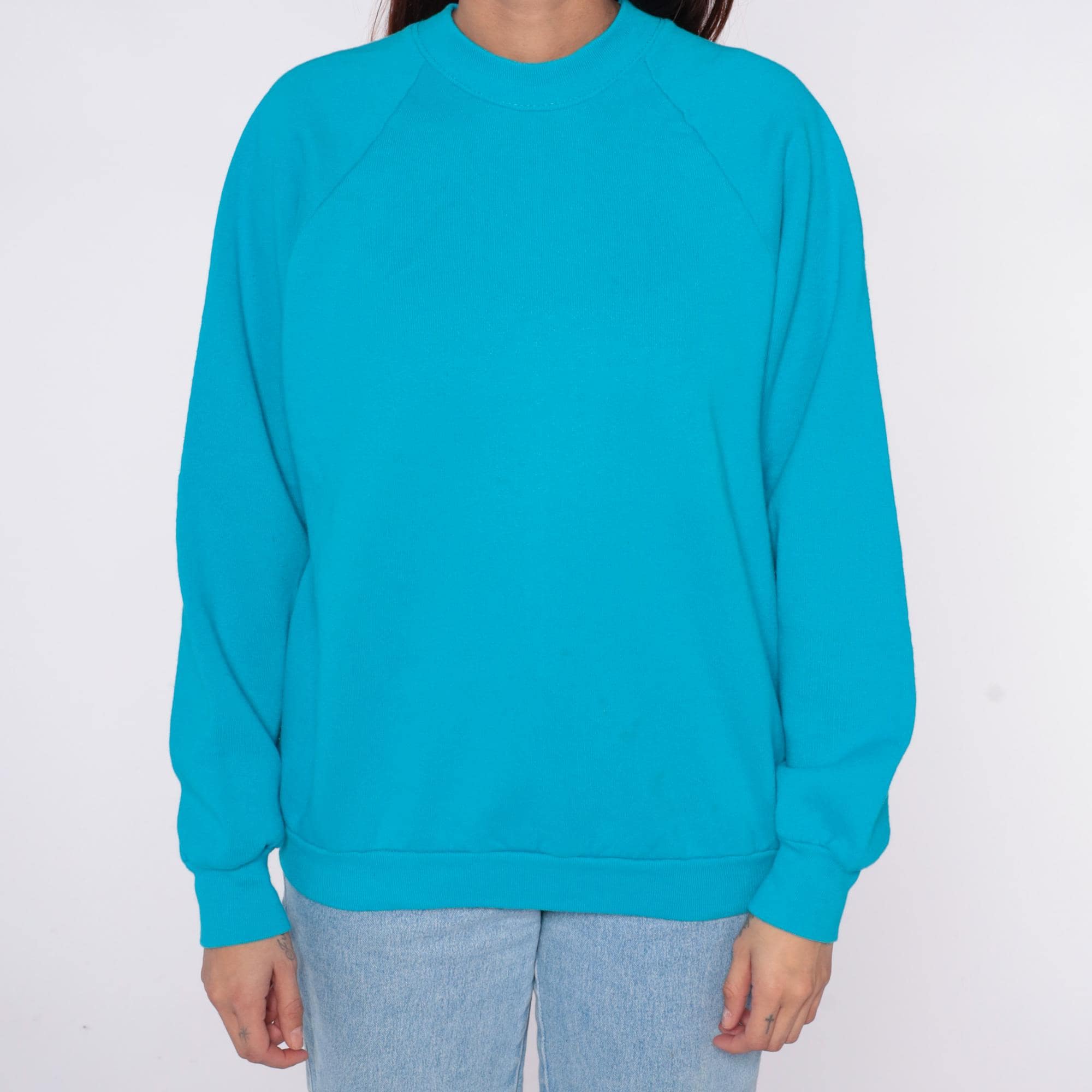 90s turquoise blue sweatshirt from Fruit of the Loom with crew neckline and raglan sleeves. Ribbed cuffs, collar, and hem.