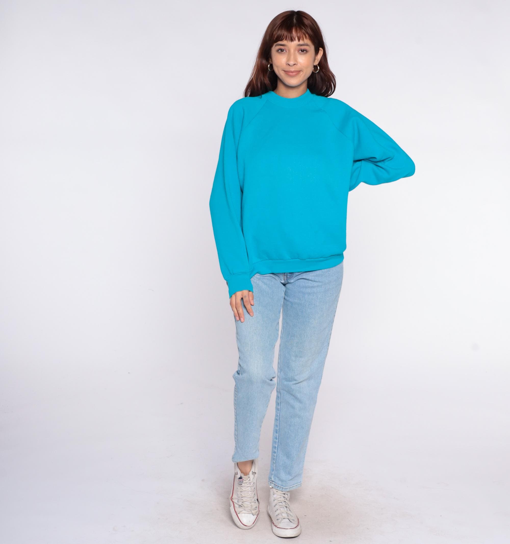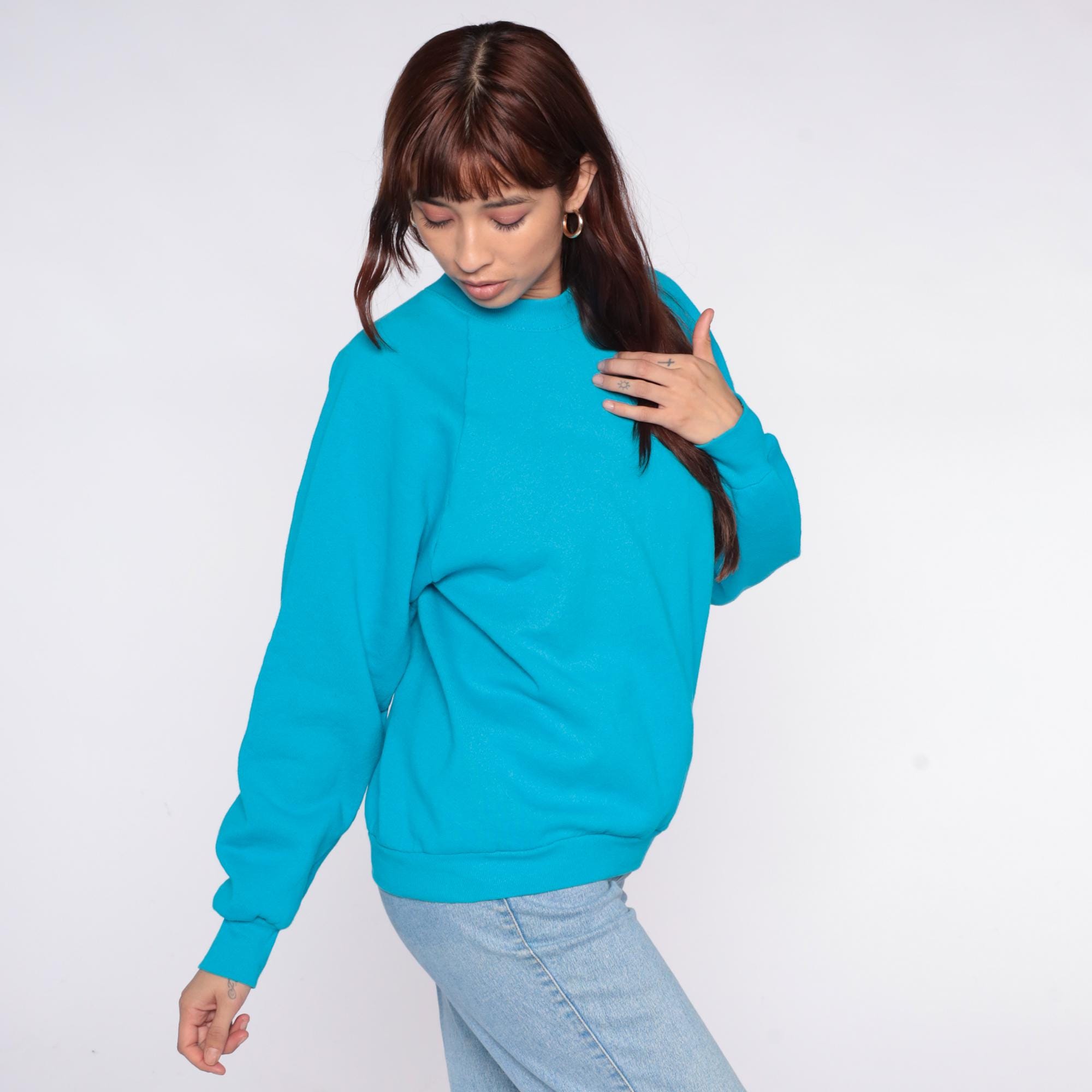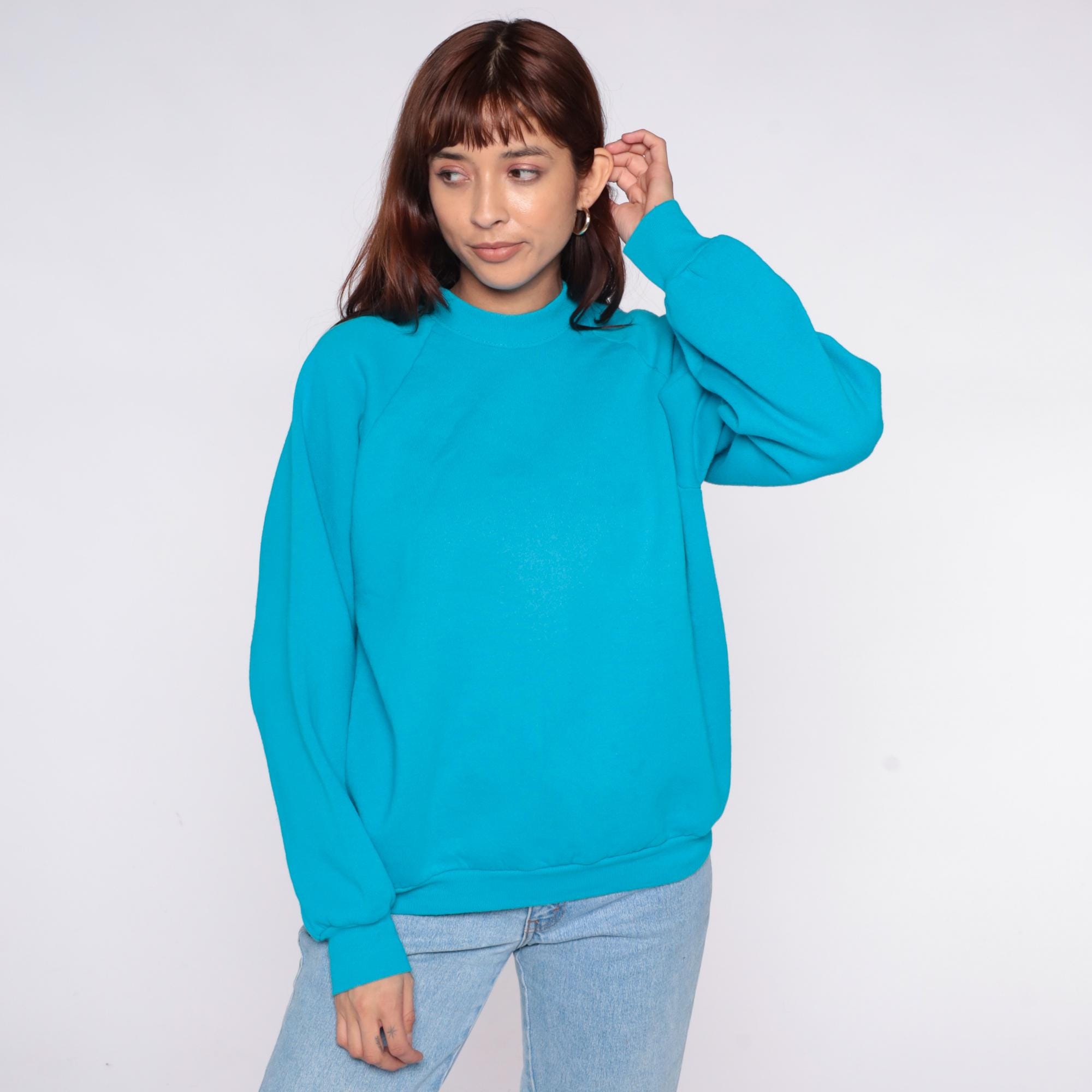 90s turquoise blue sweatshirt from Fruit of the Loom with crew neckline and raglan sleeves. Ribbed cuffs, collar, and hem.