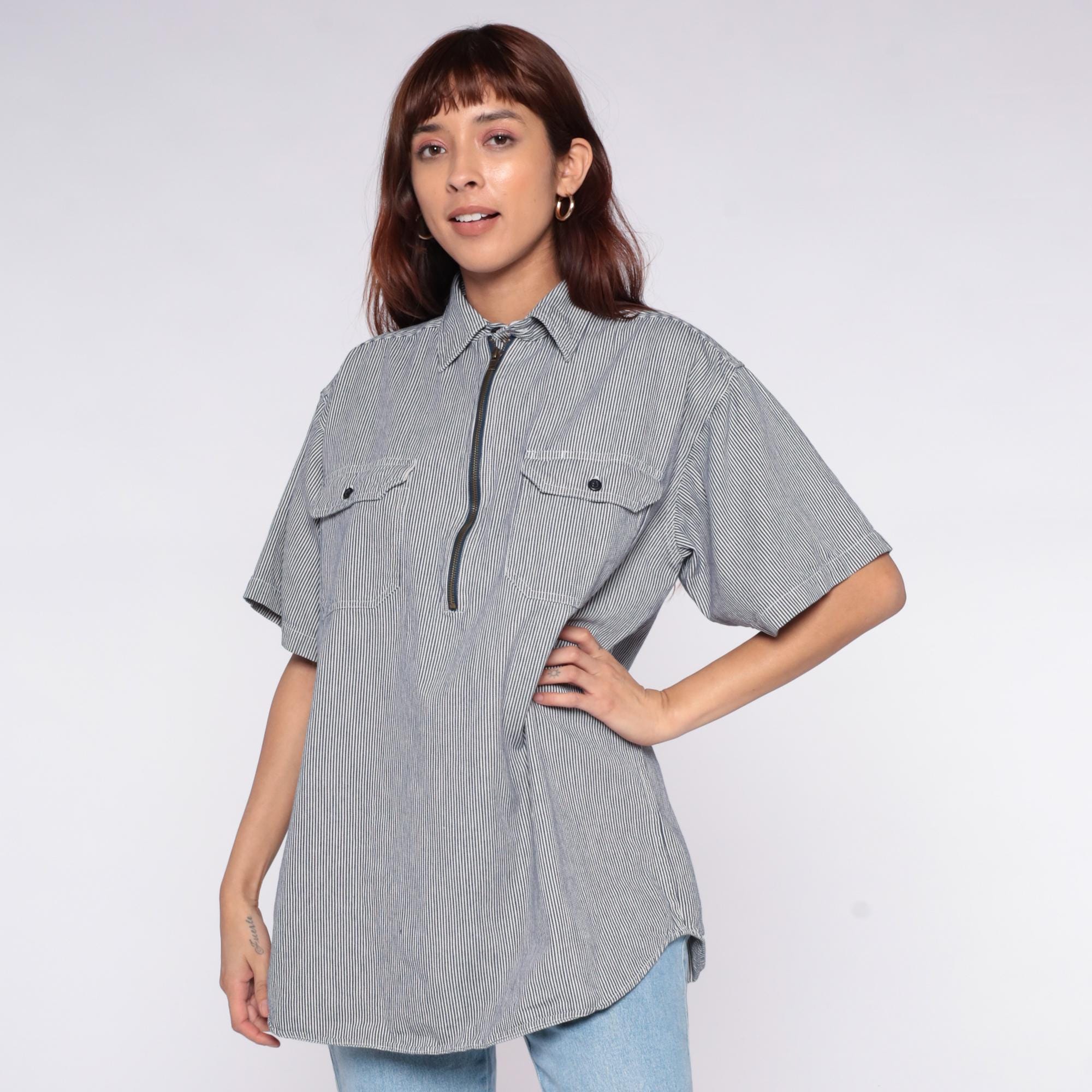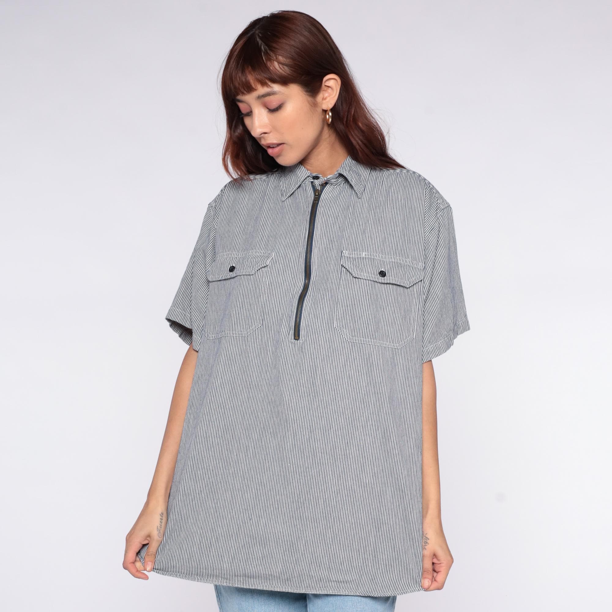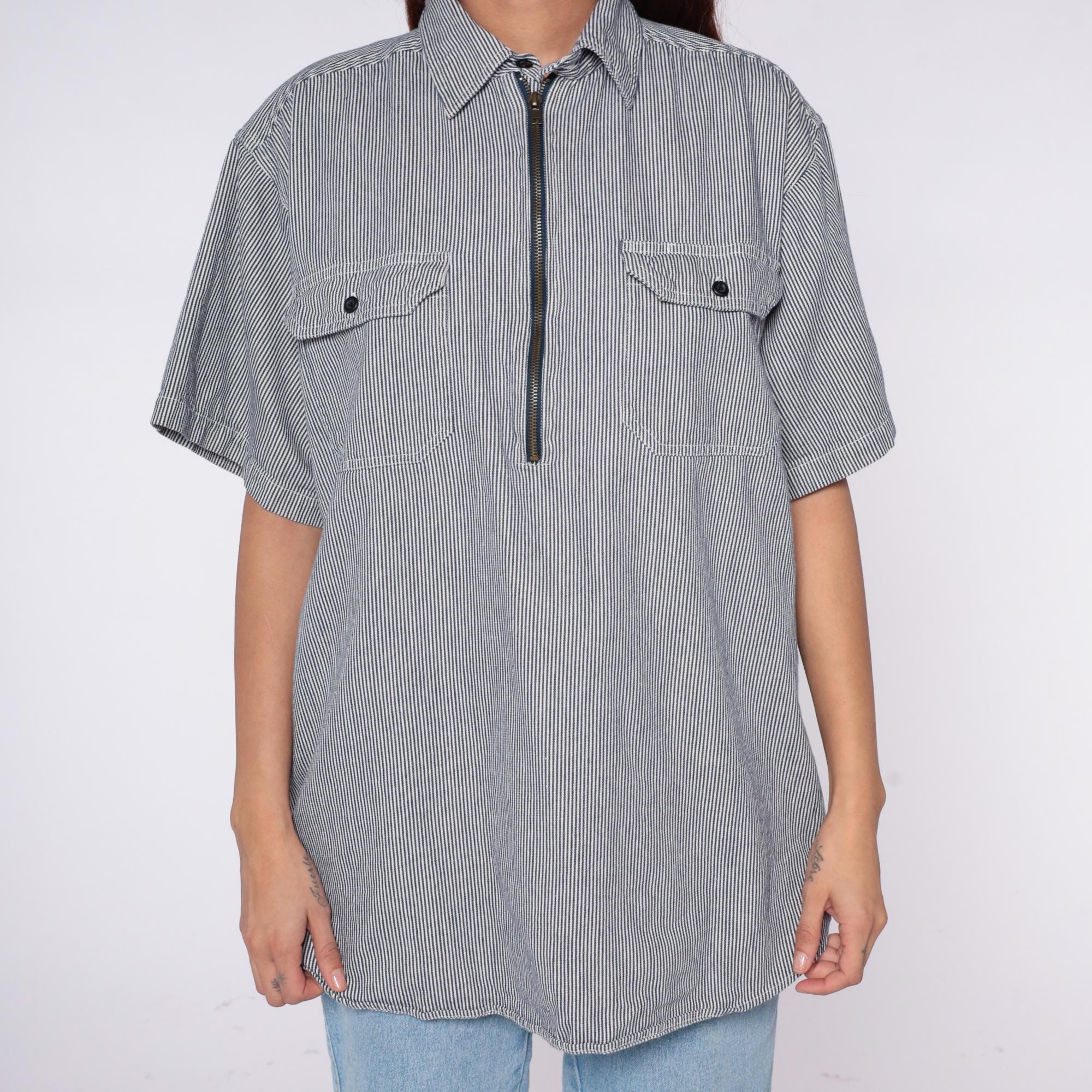 90s black and white striped shirt with half-zip front closure and metal zipper extending from collar. Collared neckline, two chest pockets with button flaps, short sleeves with boxy oversized cut.