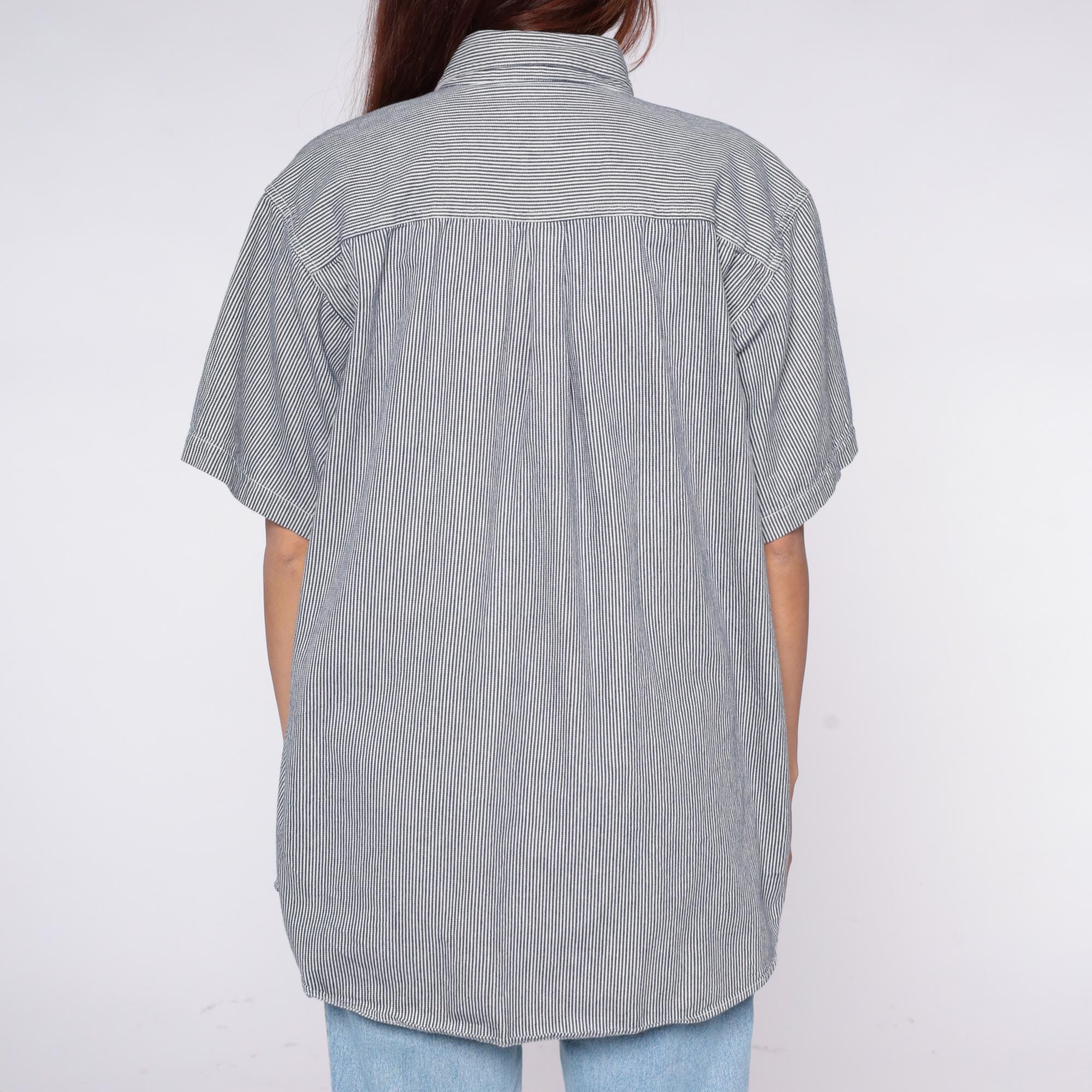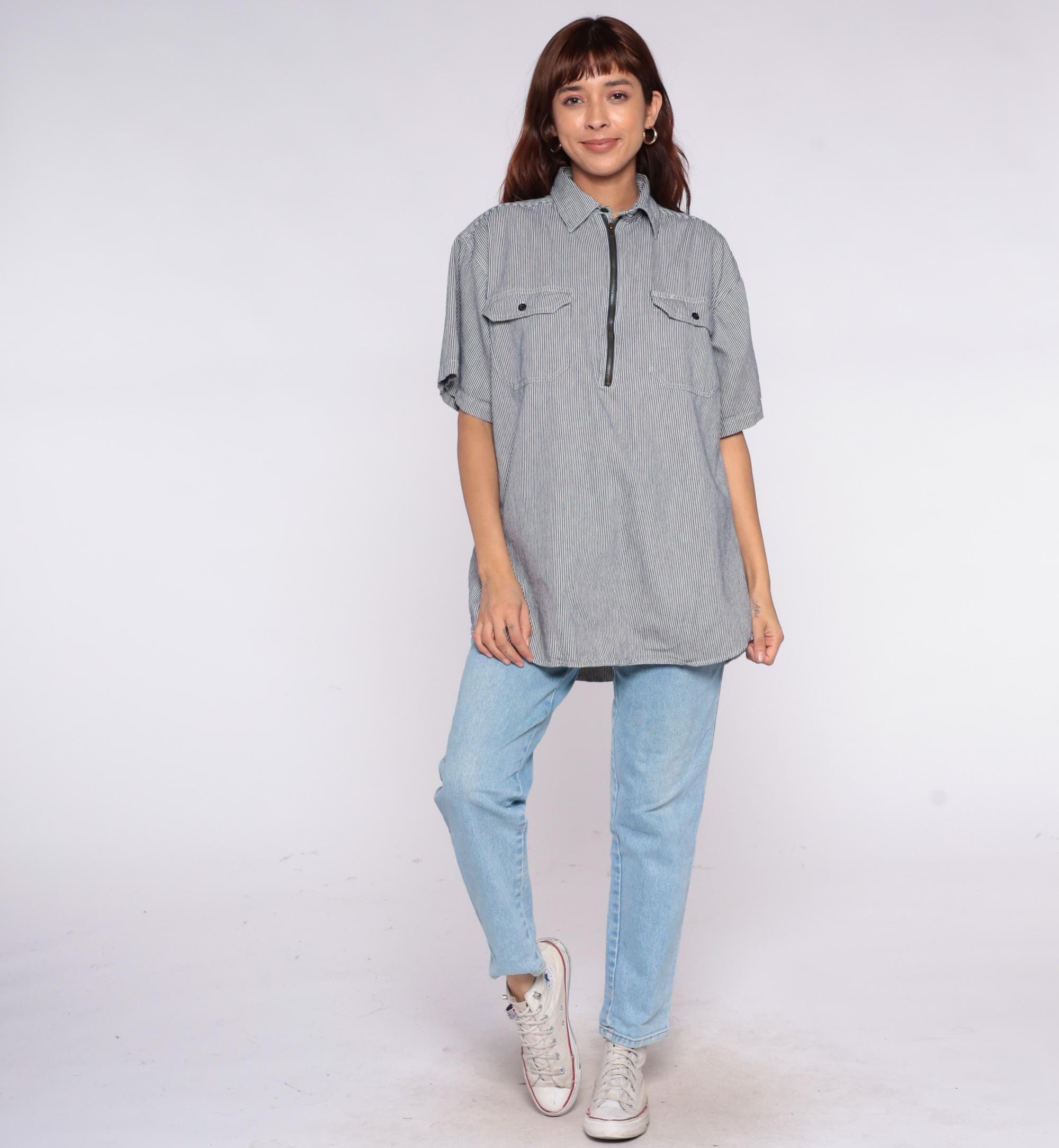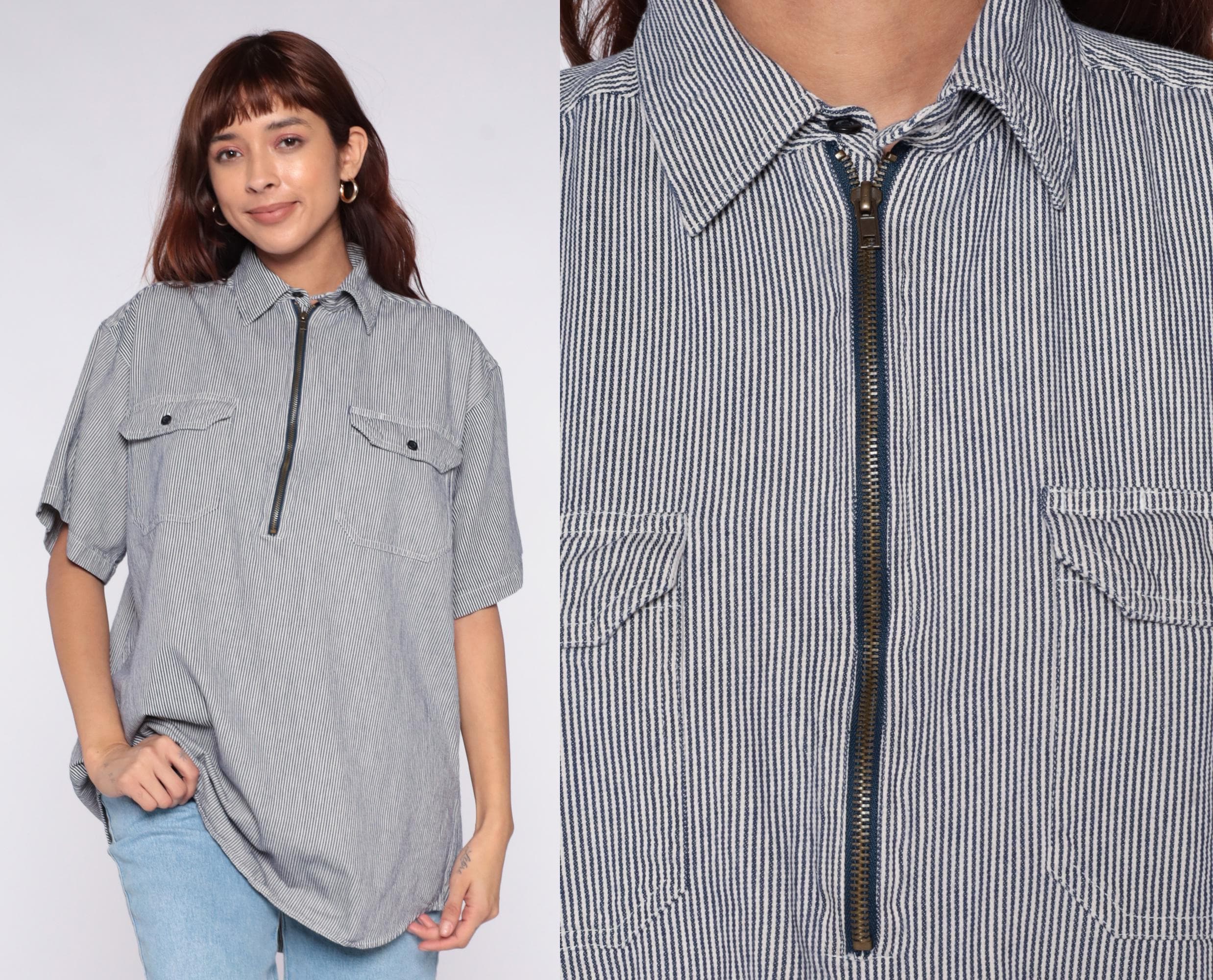 90s black and white striped shirt with half-zip front closure and metal zipper extending from collar. Collared neckline, two chest pockets with button flaps, short sleeves with boxy oversized cut.