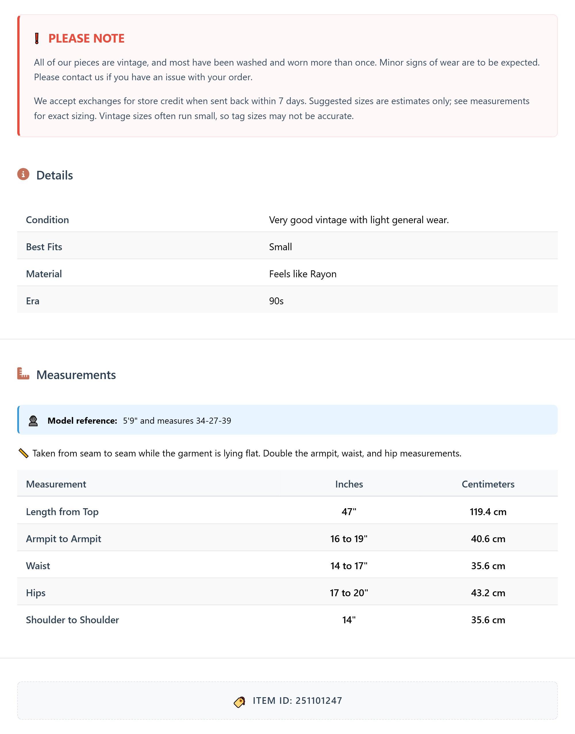 All of our pieces are vintage, and most have been washed and worn more than once. Minor signs of wear are to be expected. Please contact us if you have an issue with your order. We accept exchanges for store credit when sent back within 7 days.