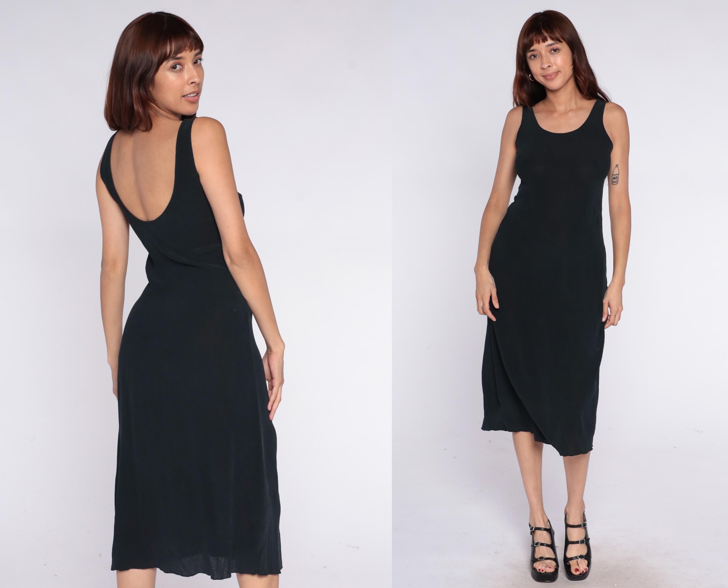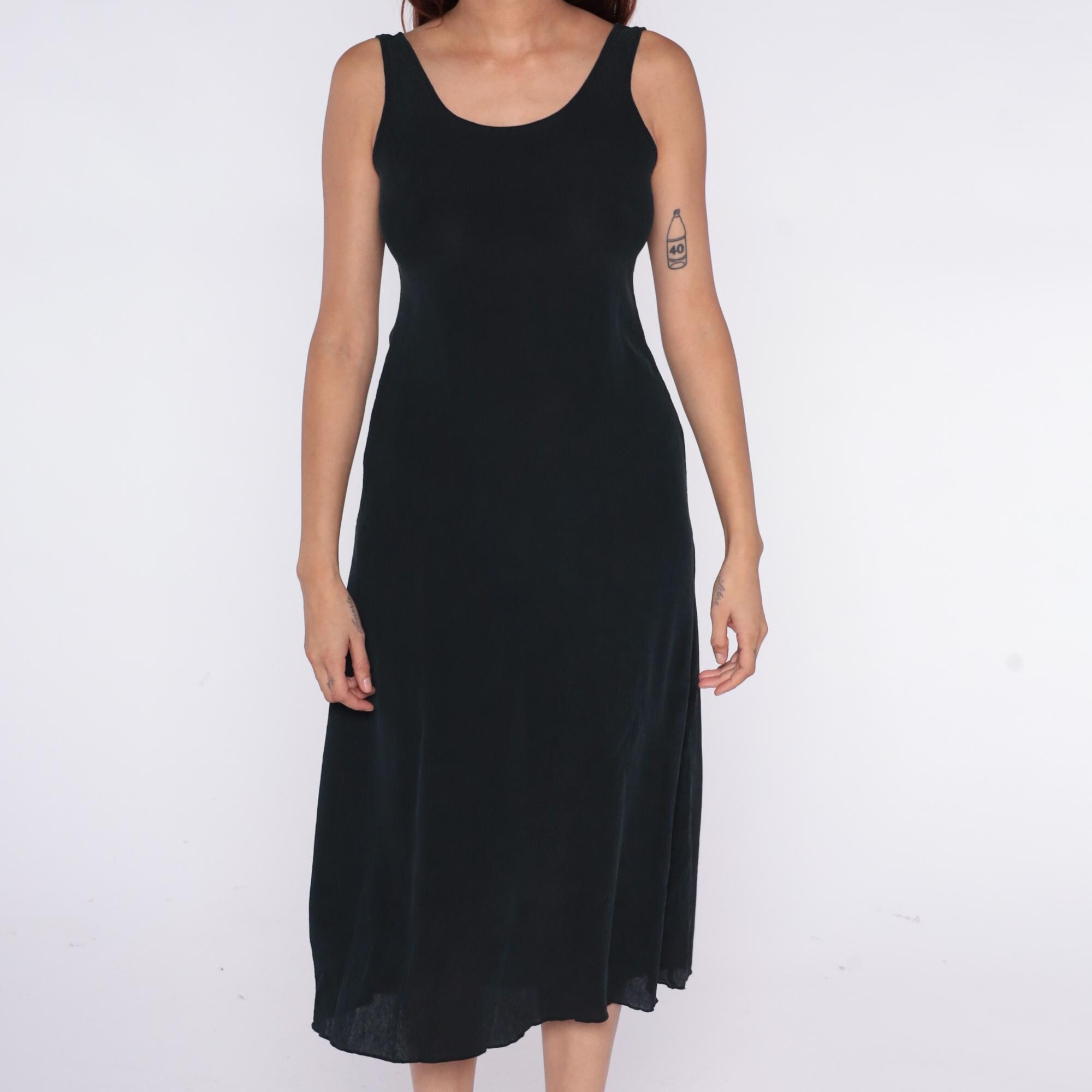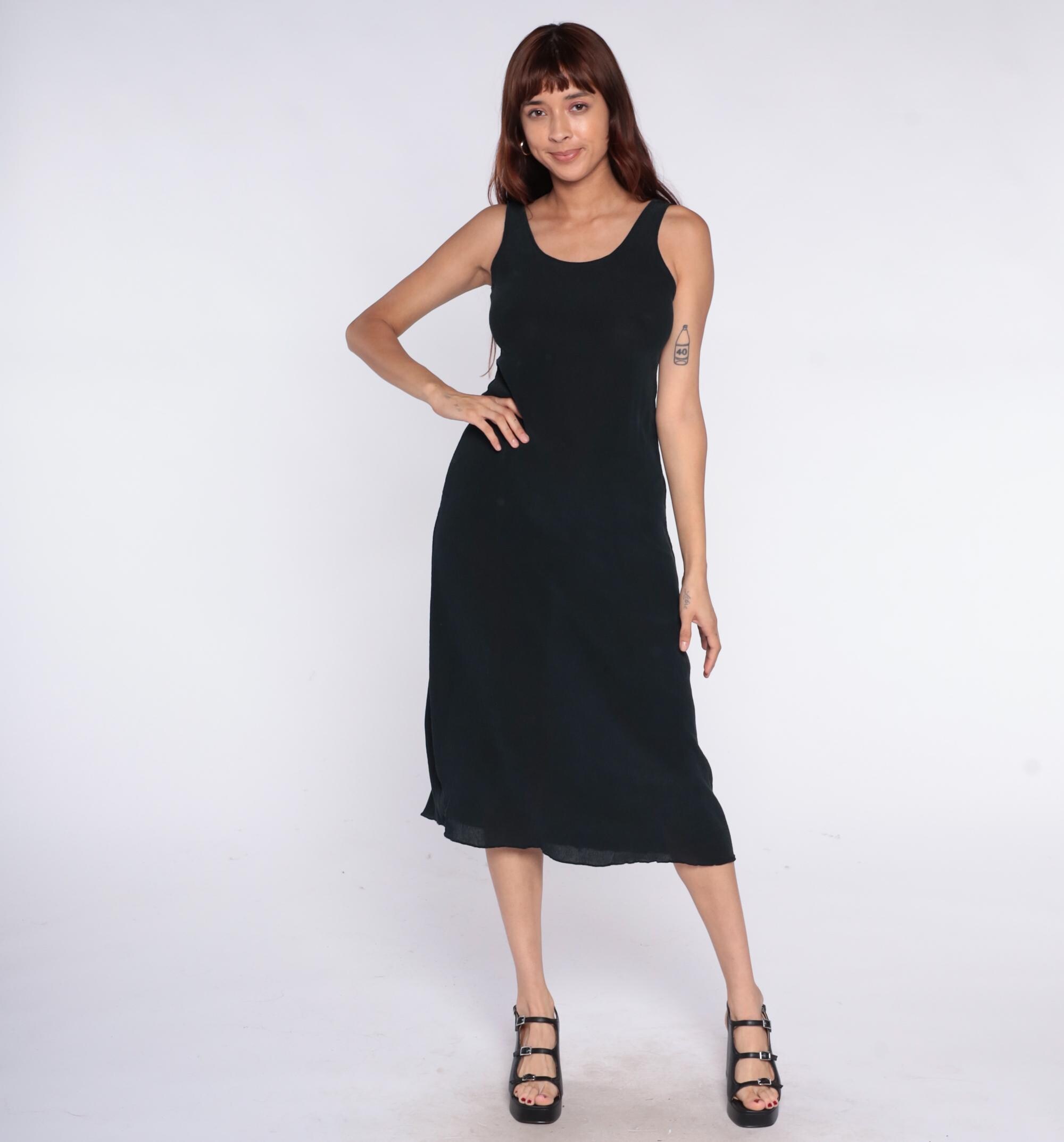90s black midi dress with scoop neckline and racerback tank straps. Simple column silhouette with straight hem.