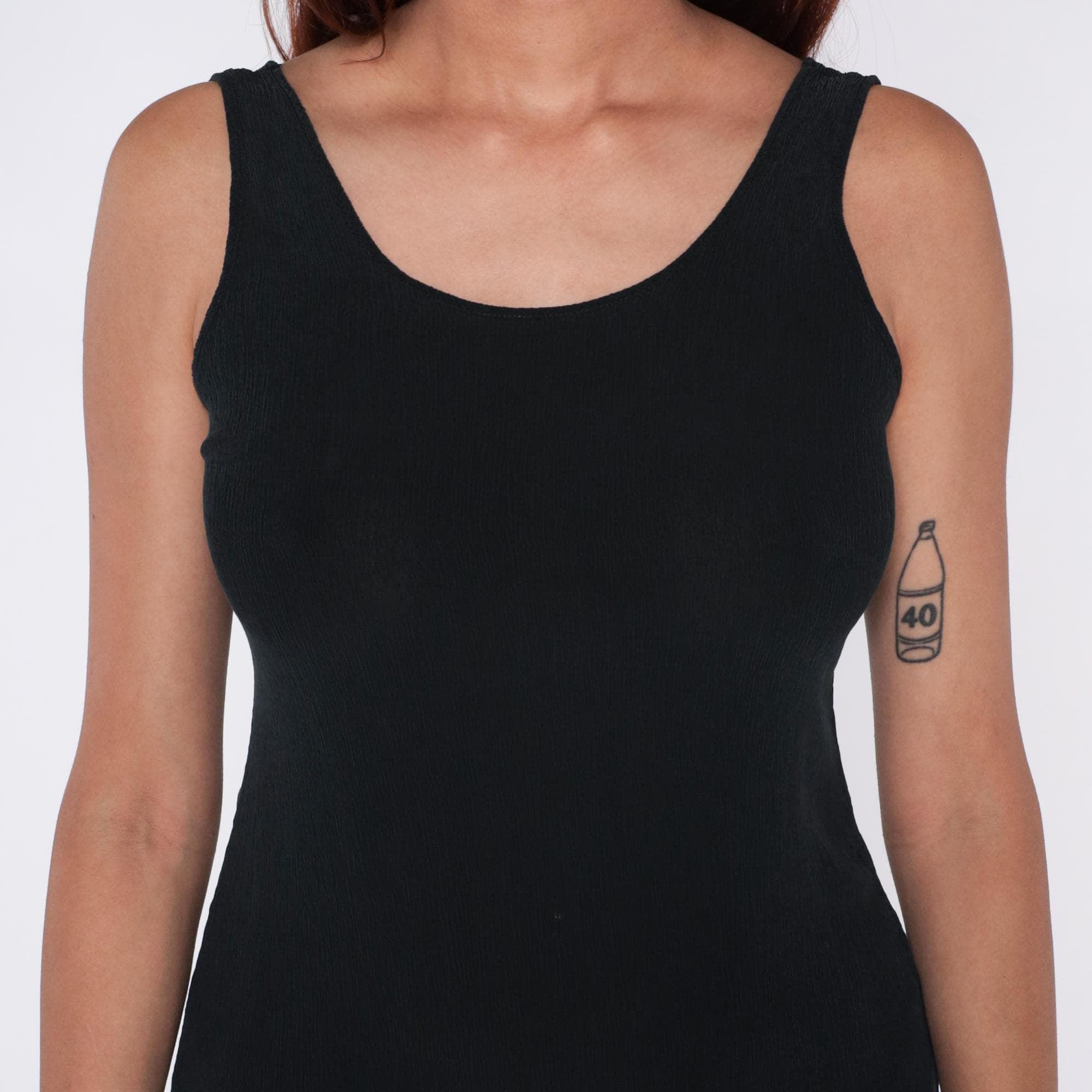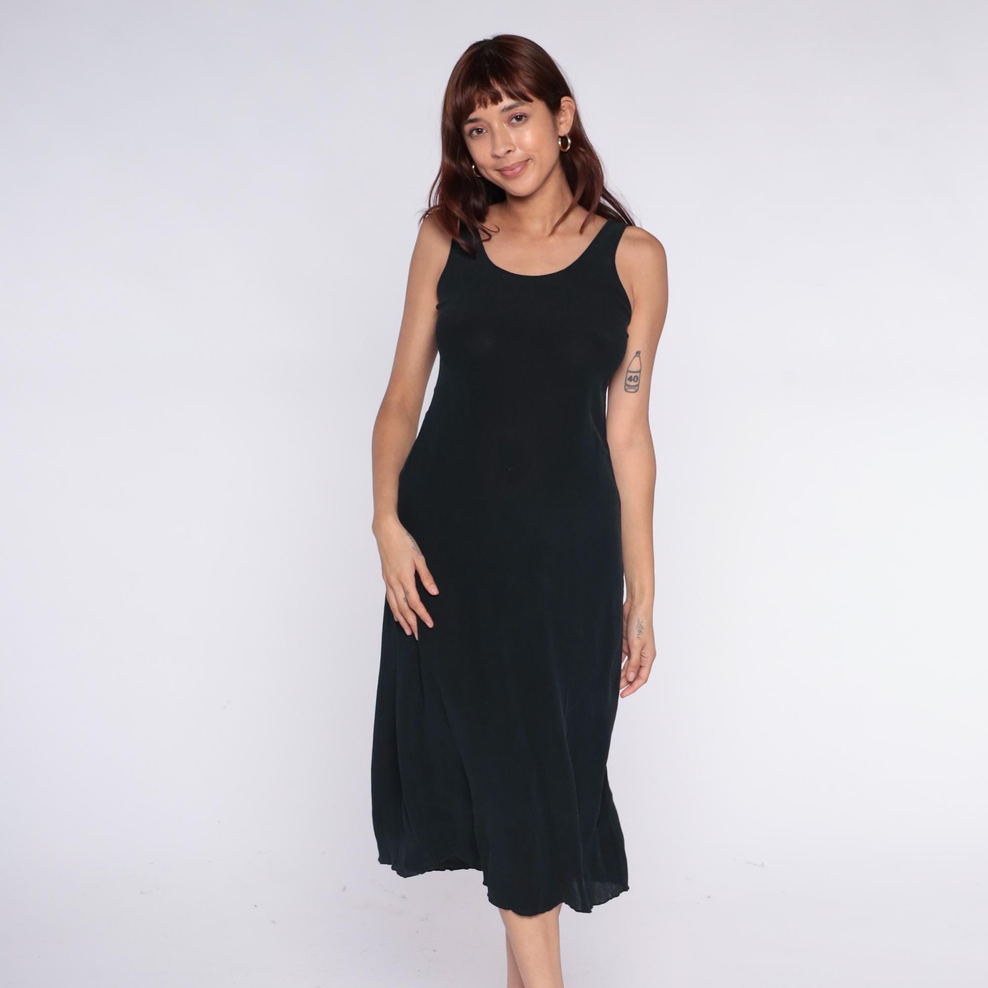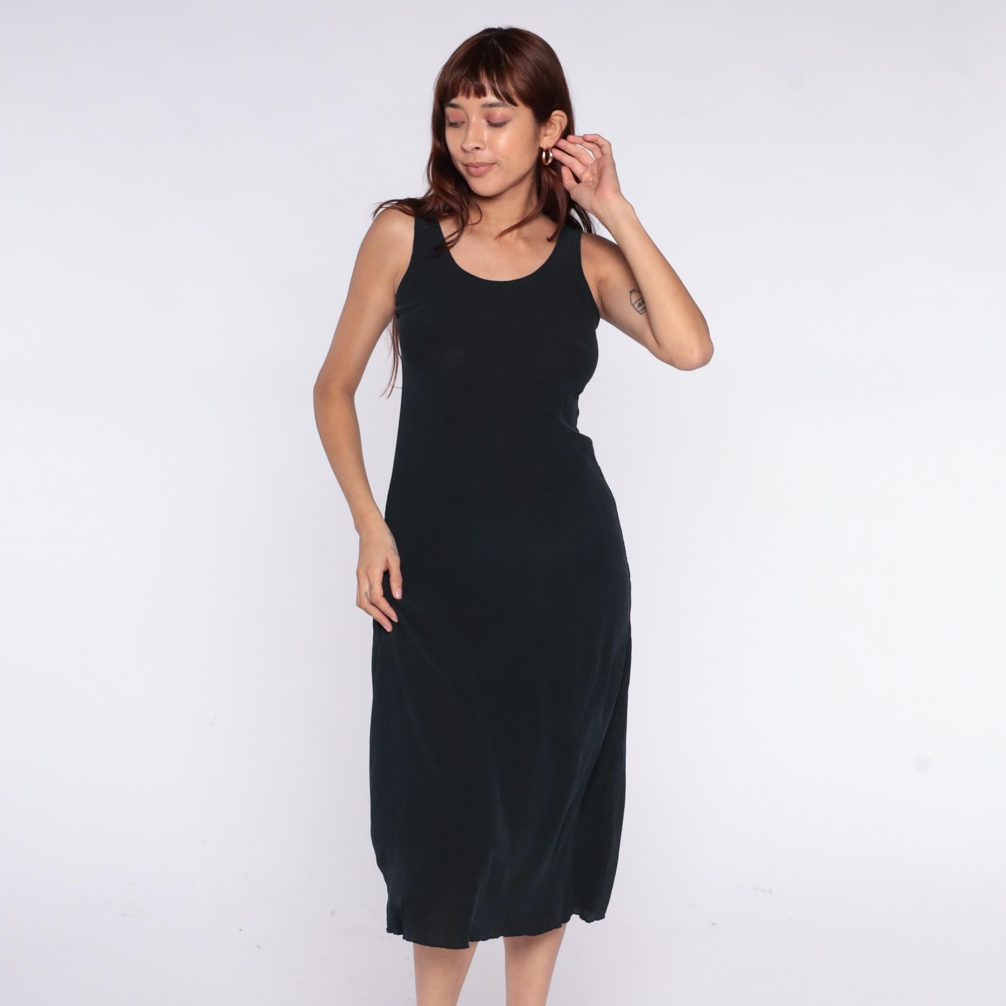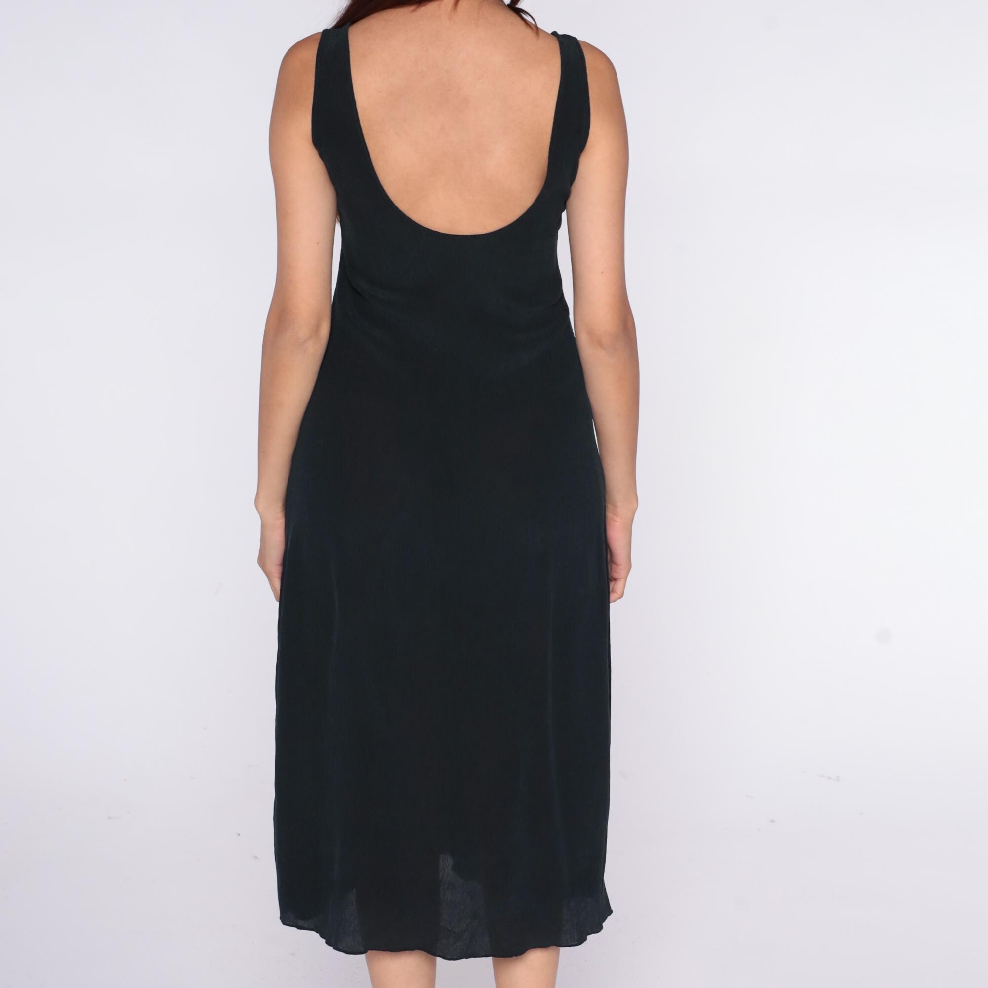 90s black midi dress with scoop neckline and racerback tank straps. Simple column silhouette with straight hem.