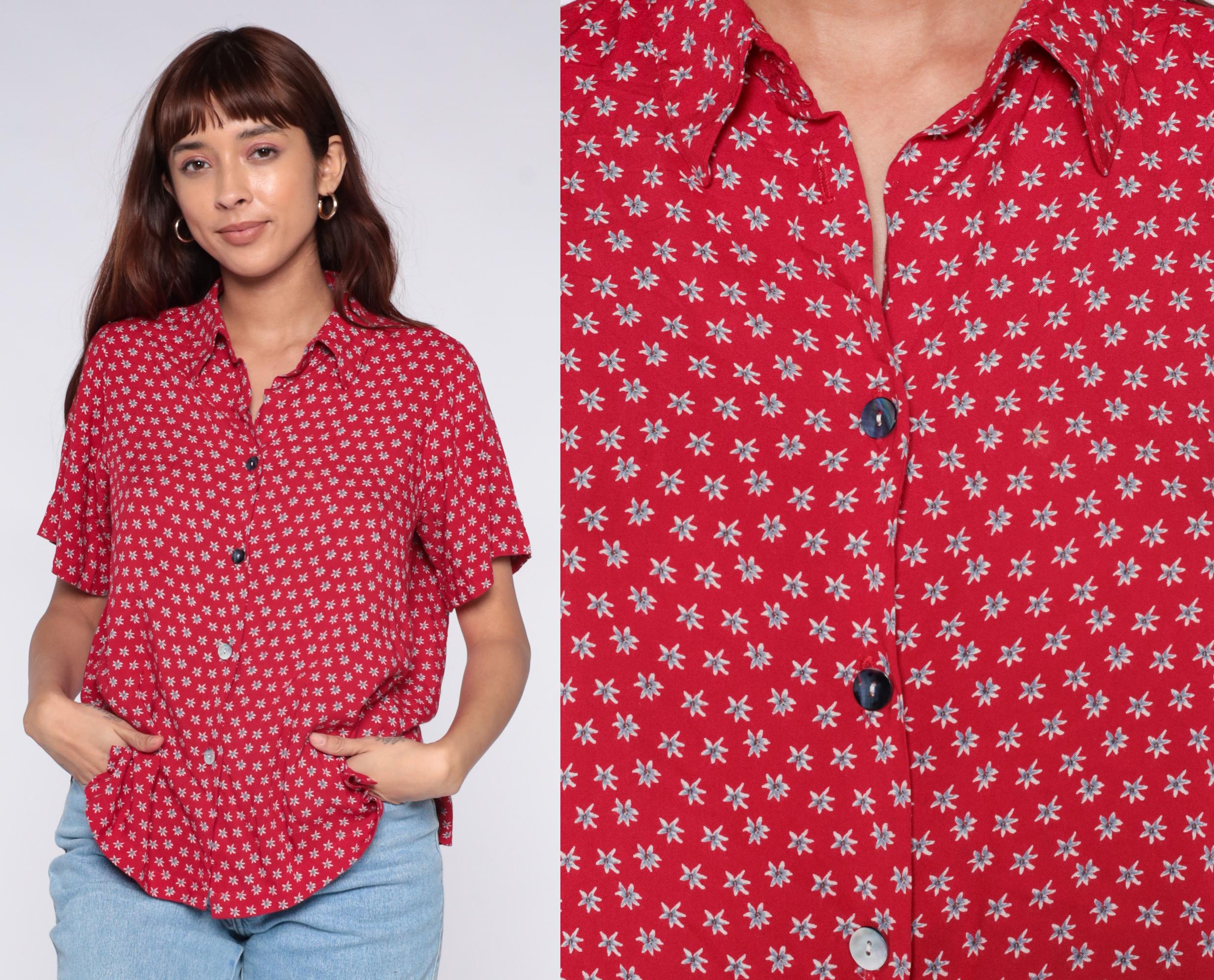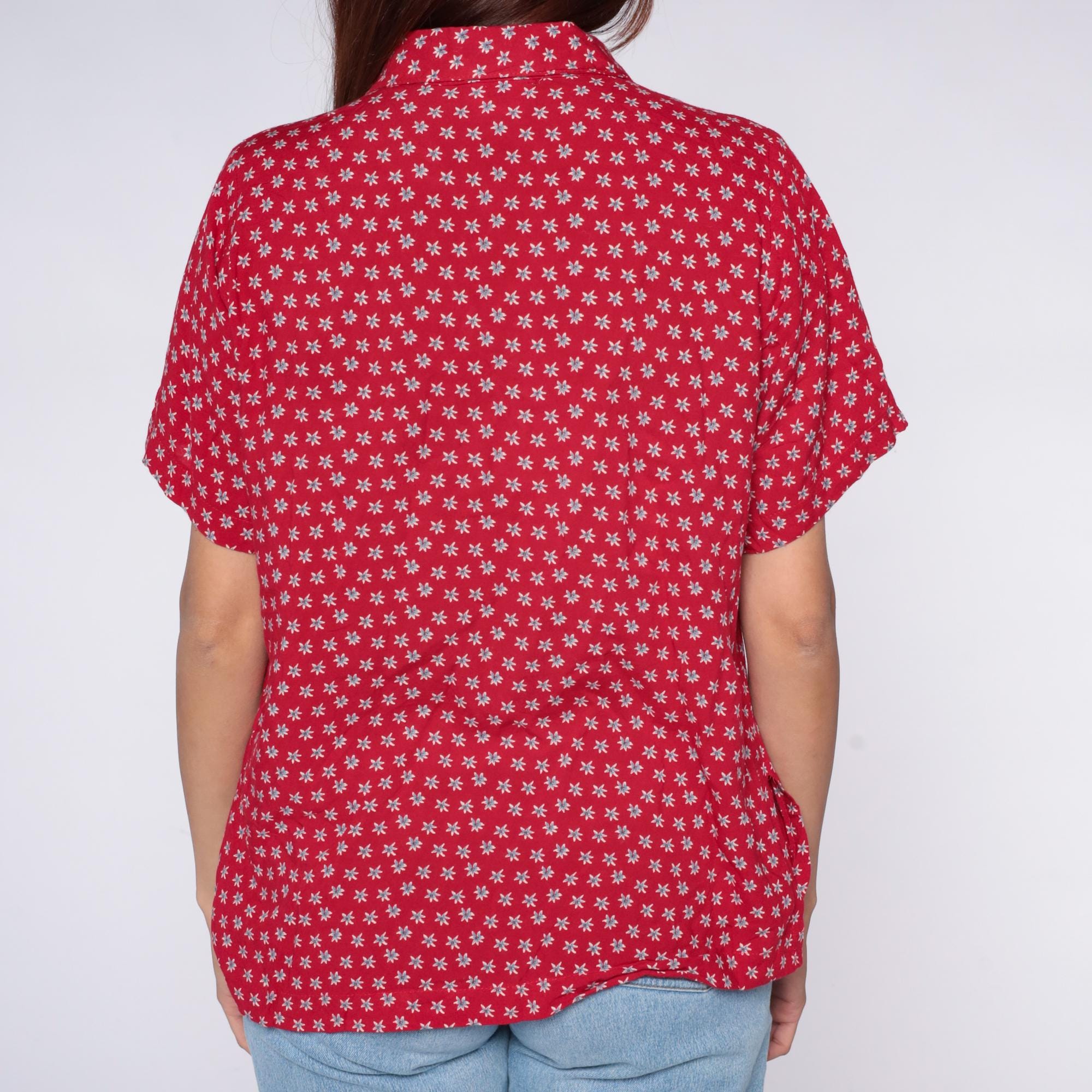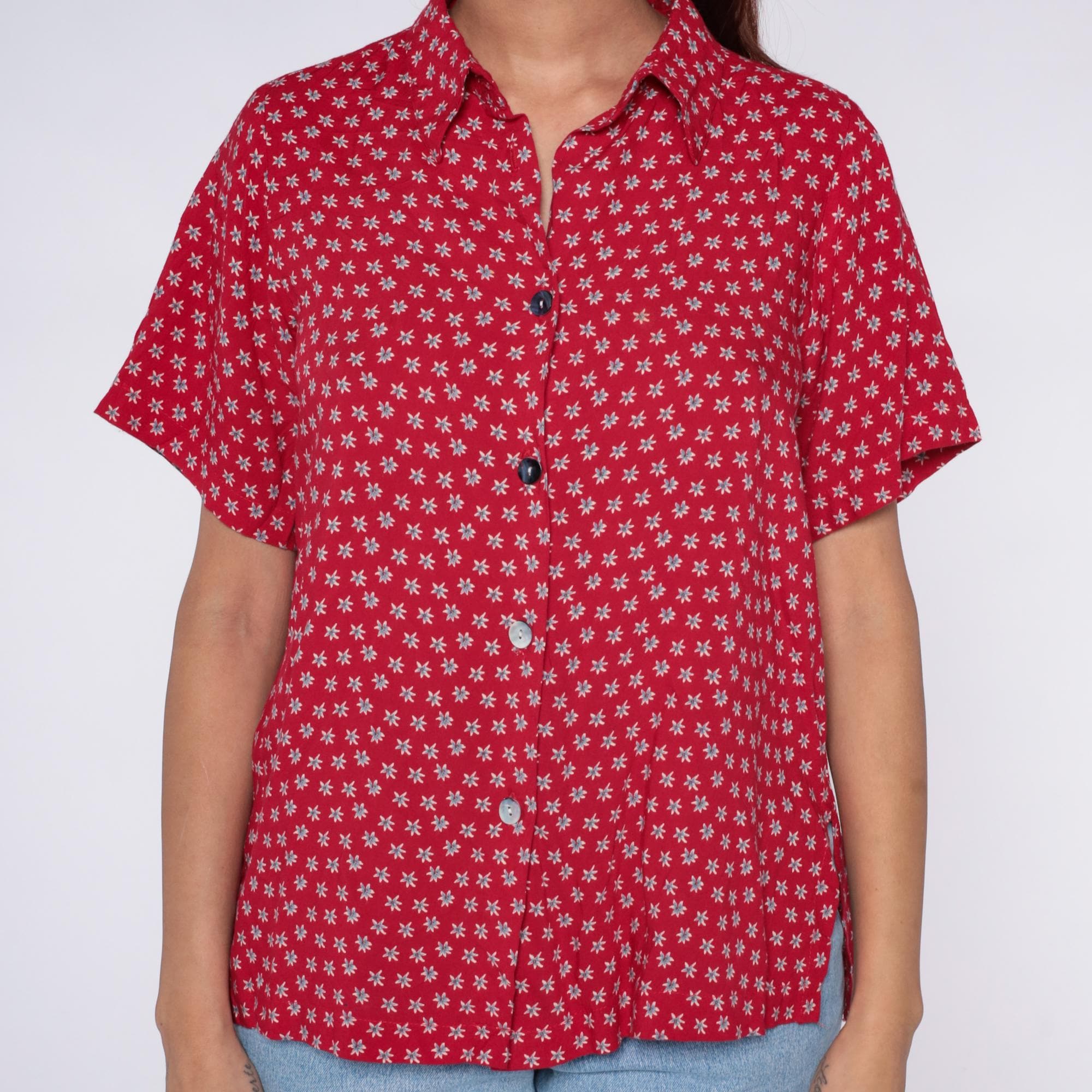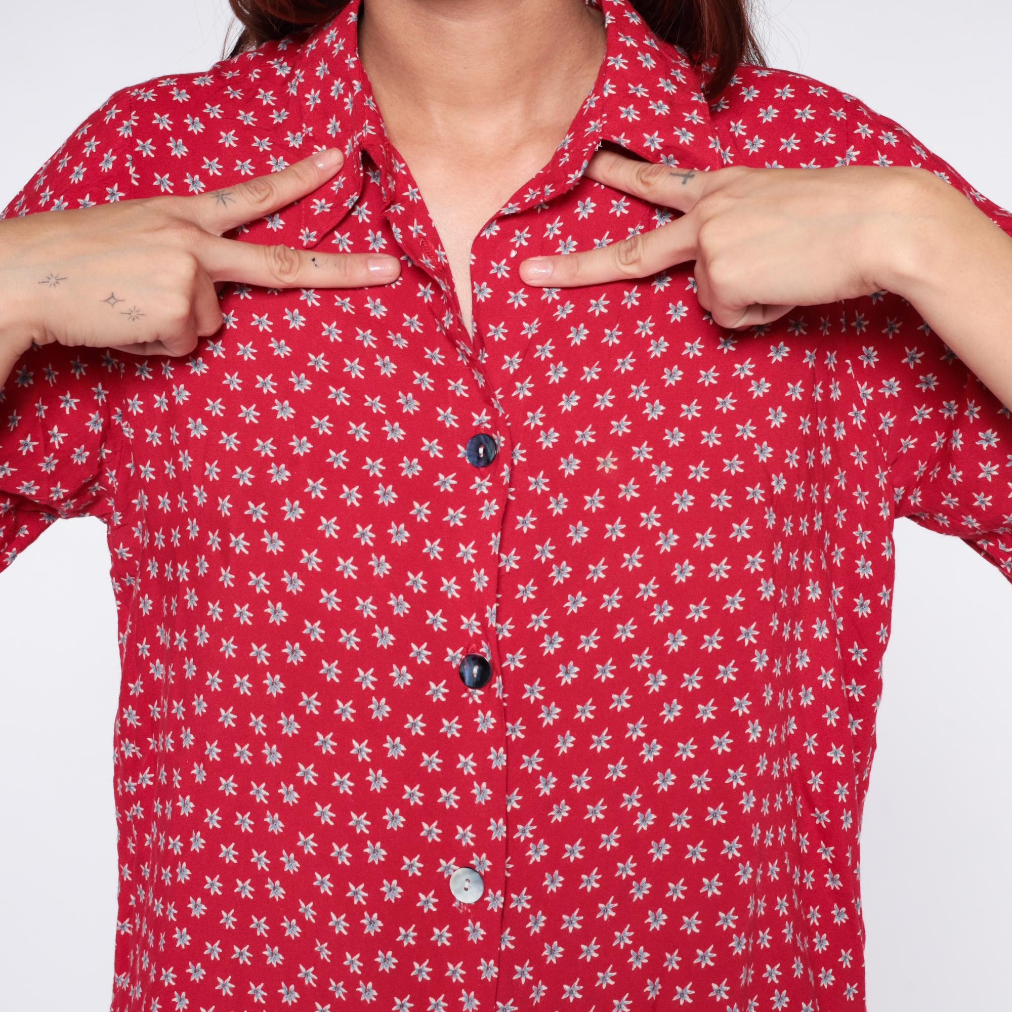 90s red button-up shirt from Clio Petites with white ditsy floral print across the fabric. Collared neckline, short sleeves, and full button front closure.