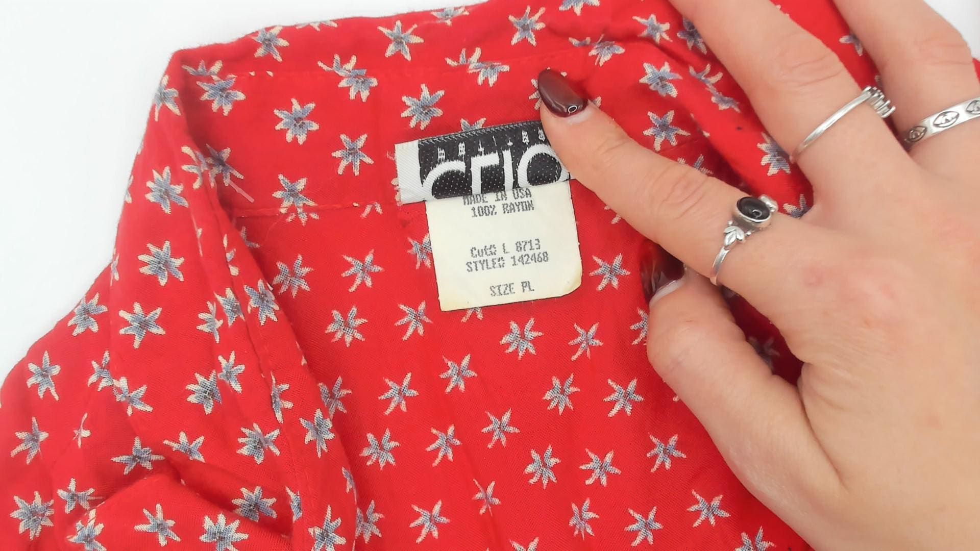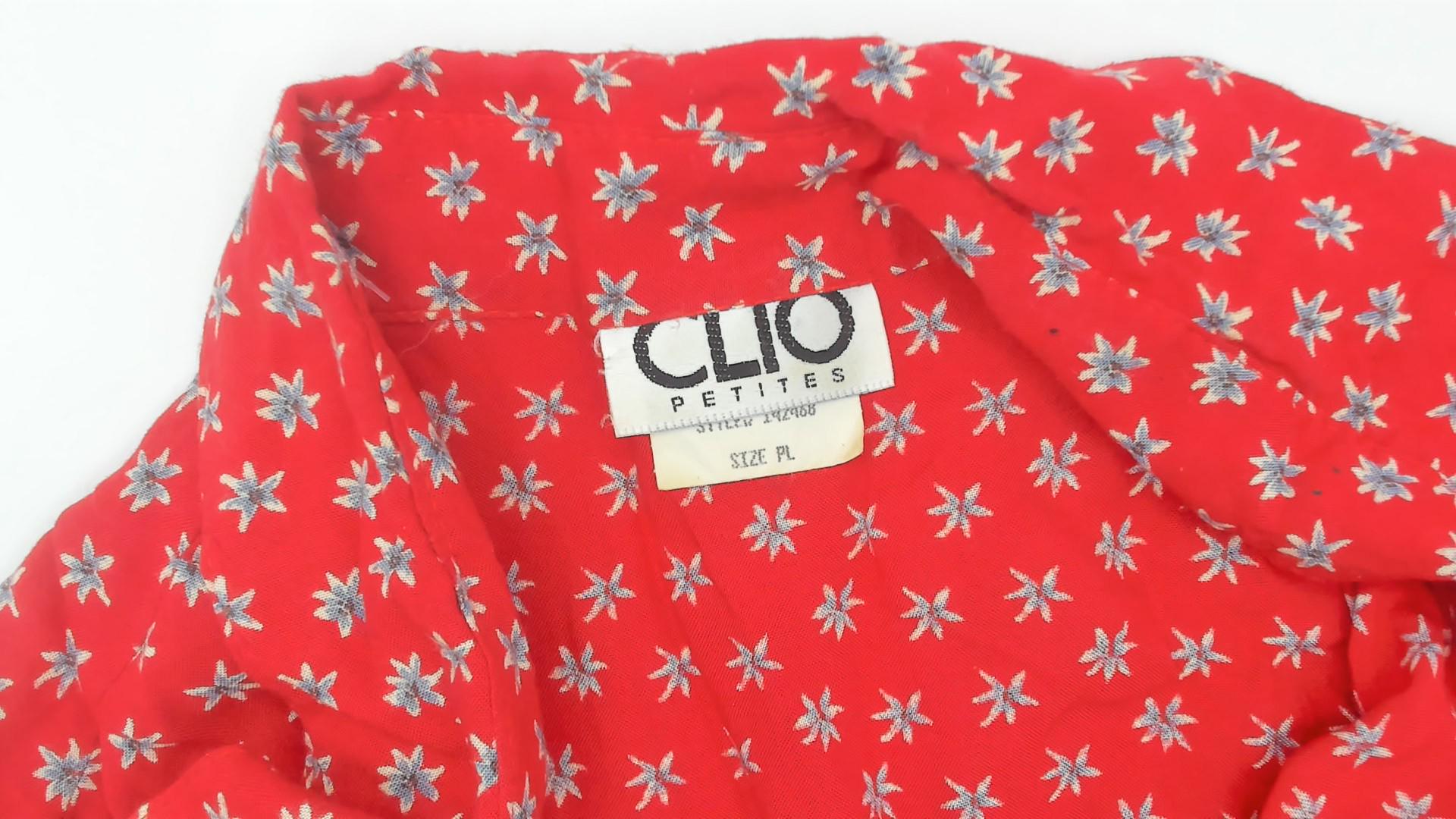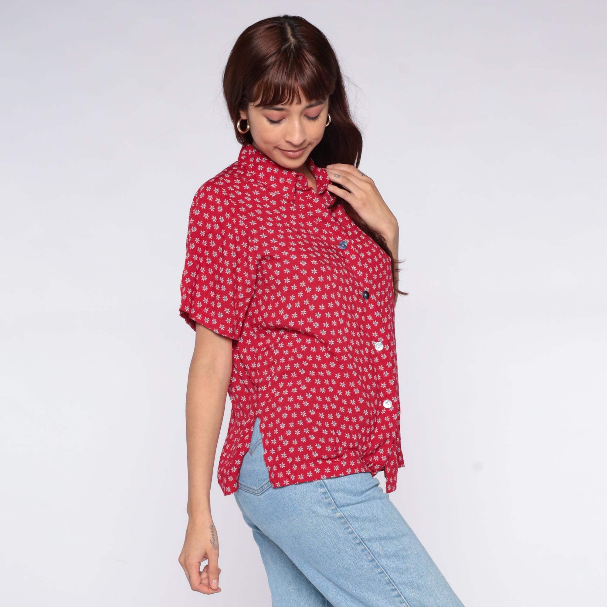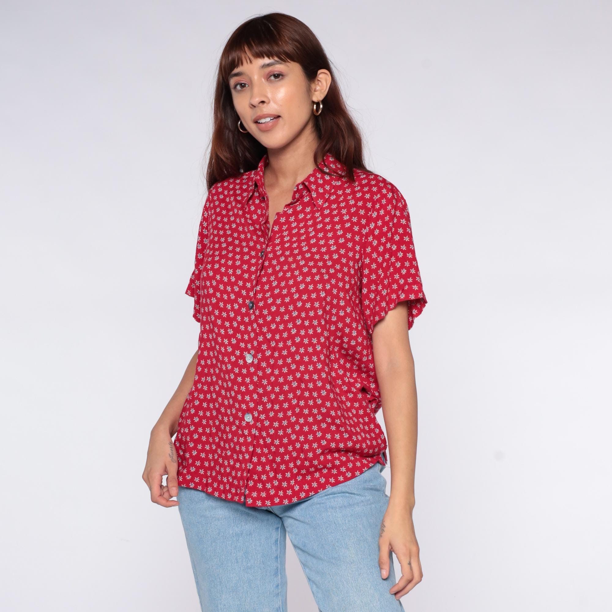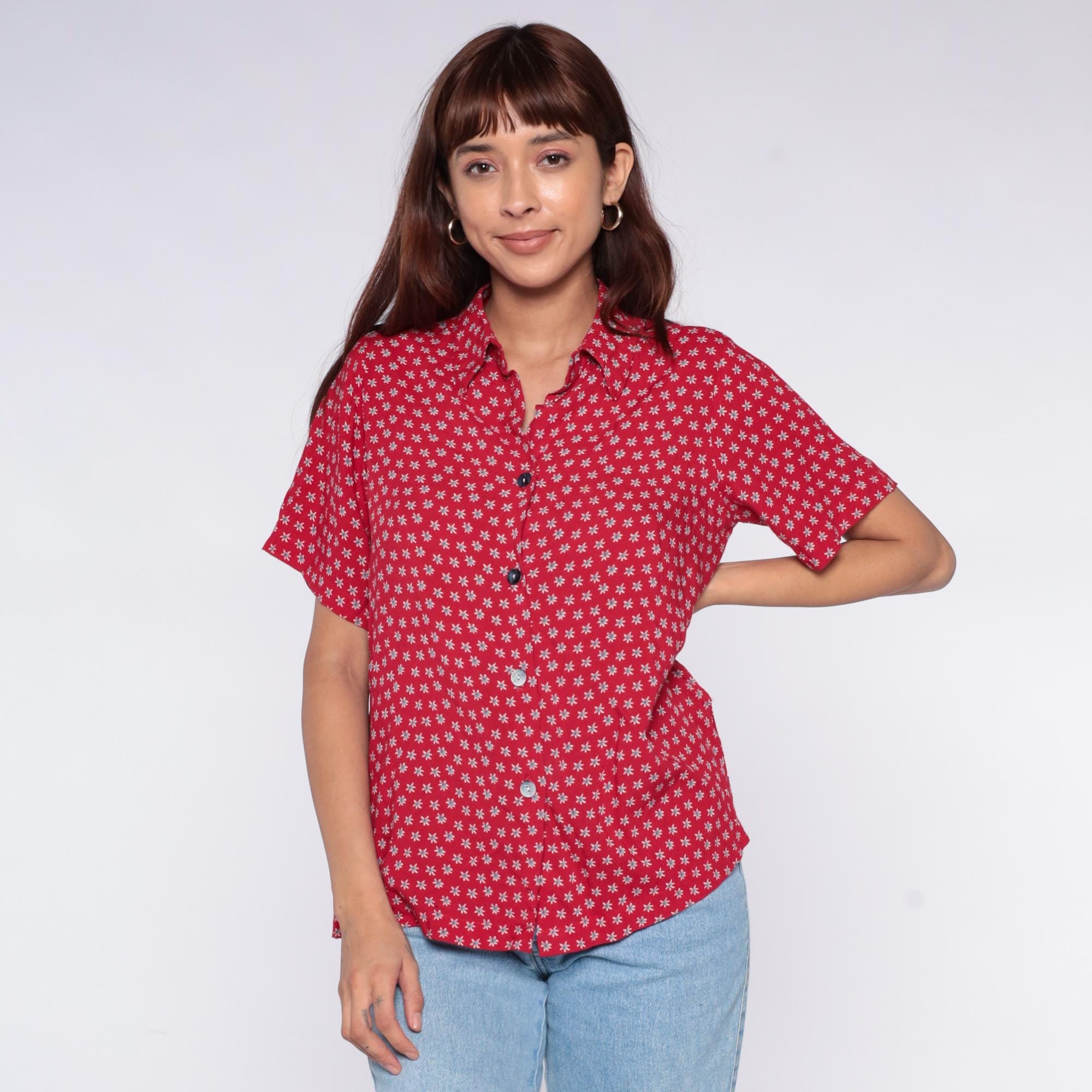 90s red button-up shirt from Clio Petites with white ditsy floral print across the fabric. Collared neckline, short sleeves, and full button front closure.