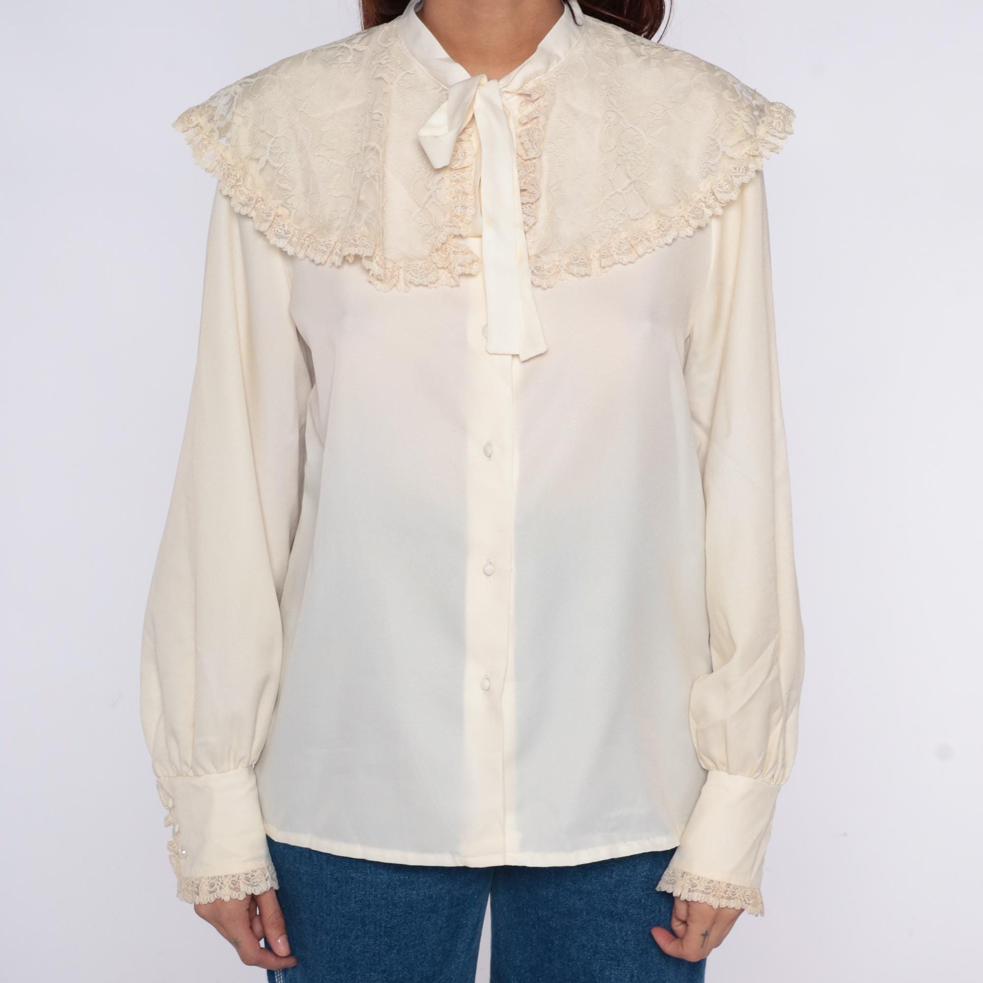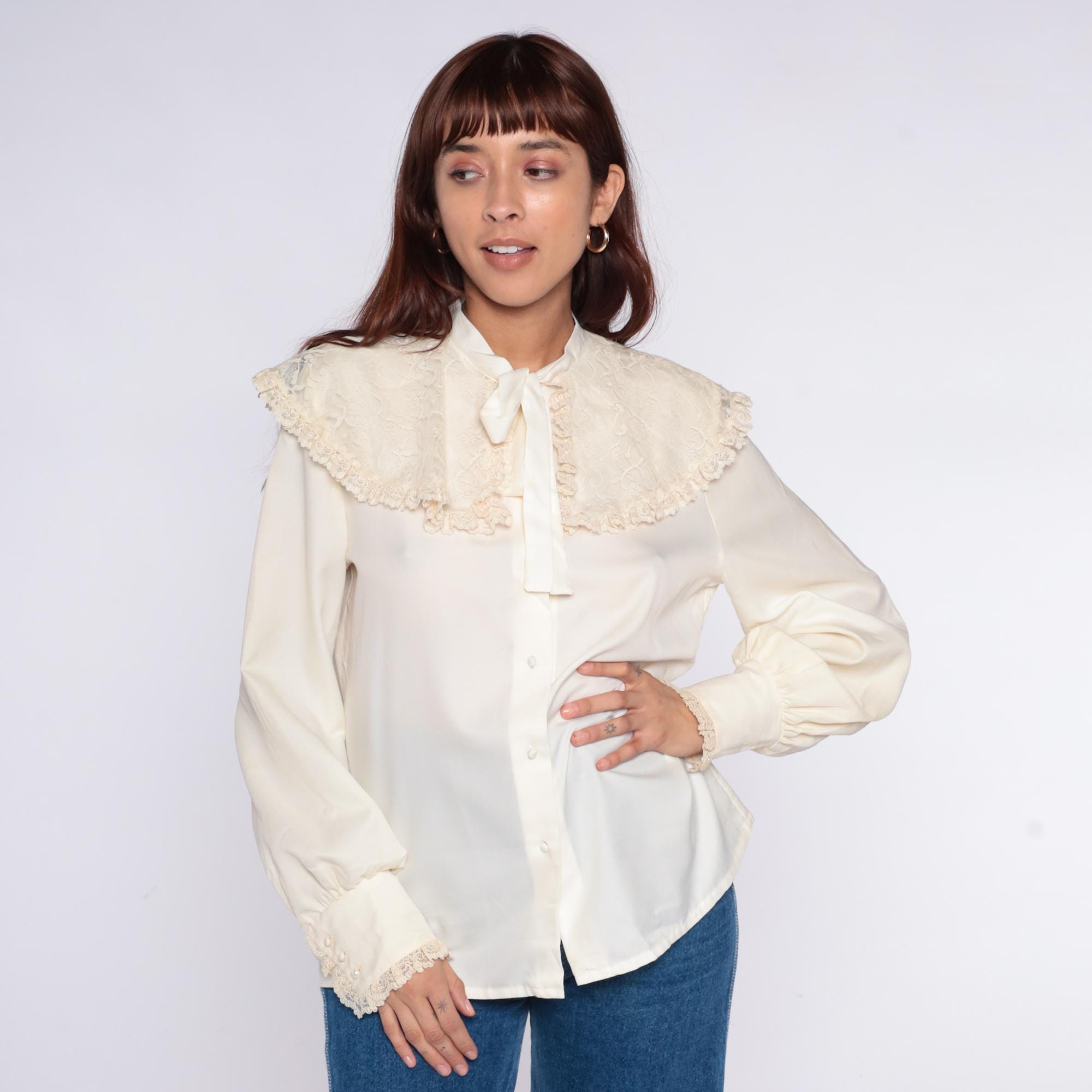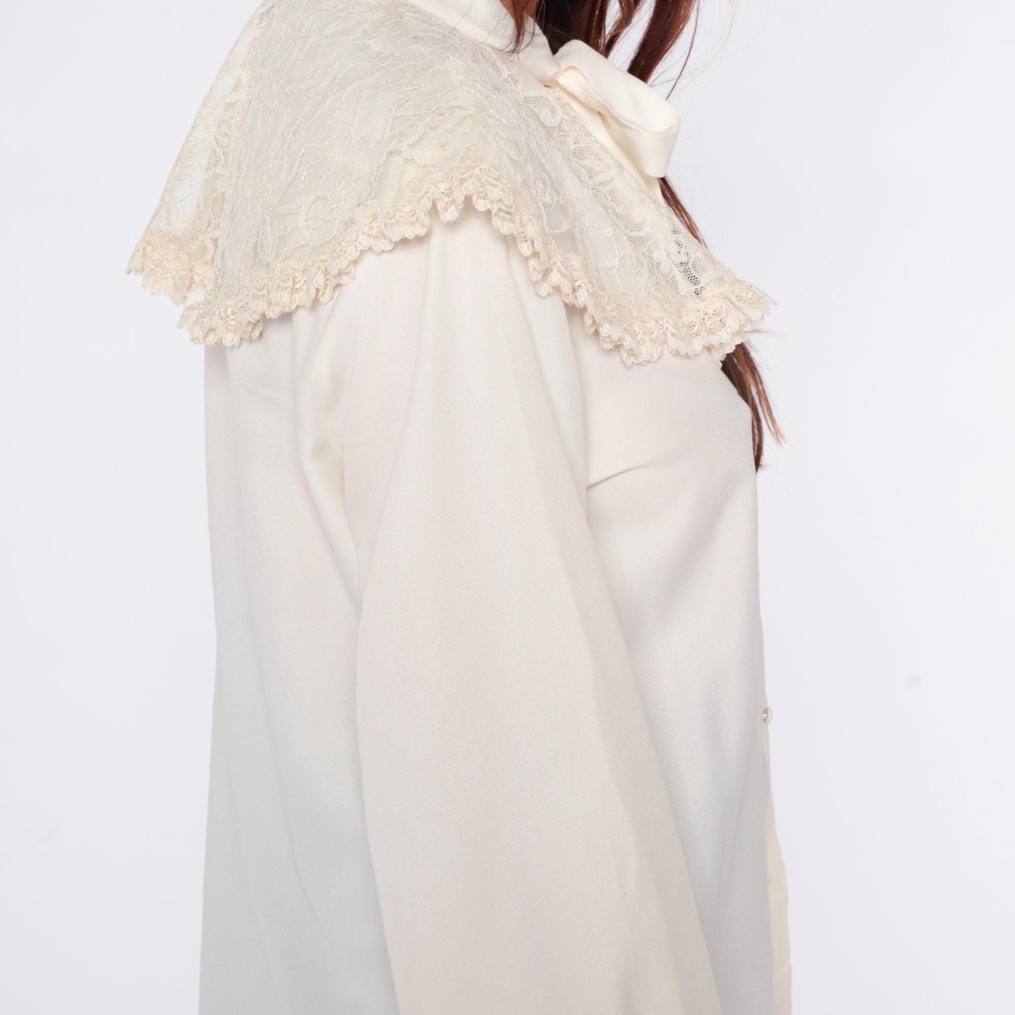 70s cream blouse from Elles Belles with wide lace collar, pussy bow tie at neckline, and button front closure. Long sleeves with lace cuffs matching the collar trim.