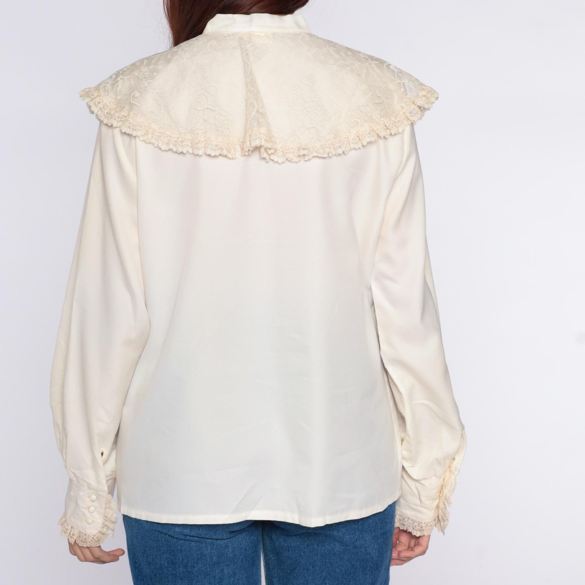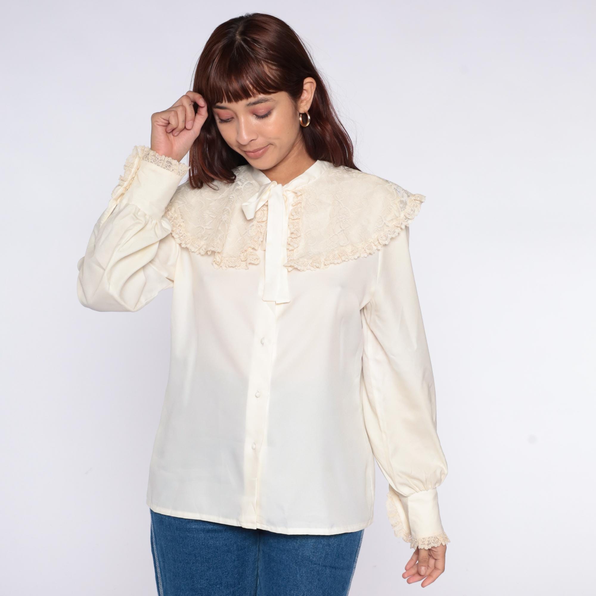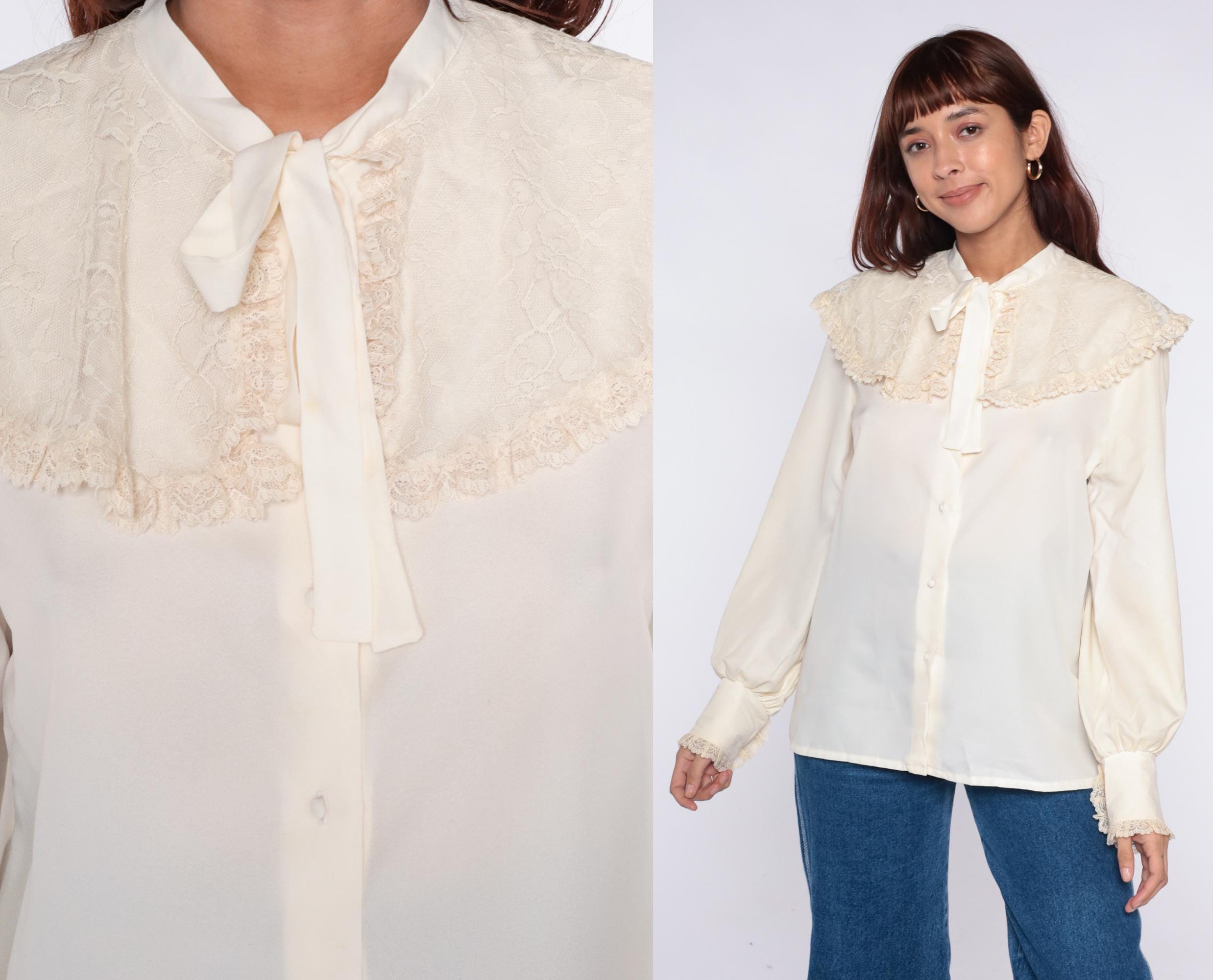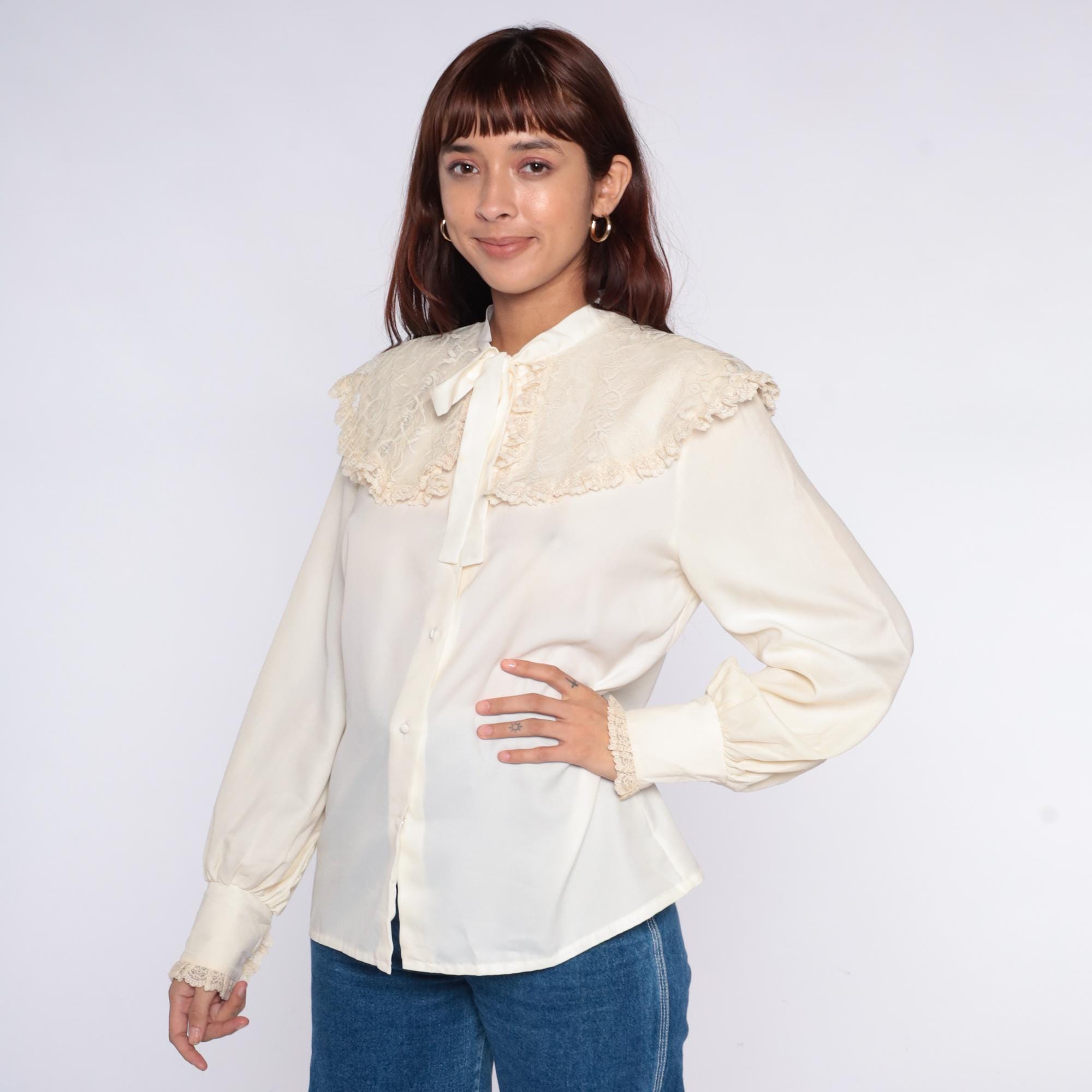 70s cream blouse from Elles Belles with wide lace collar, pussy bow tie at neckline, and button front closure. Long sleeves with lace cuffs matching the collar trim.