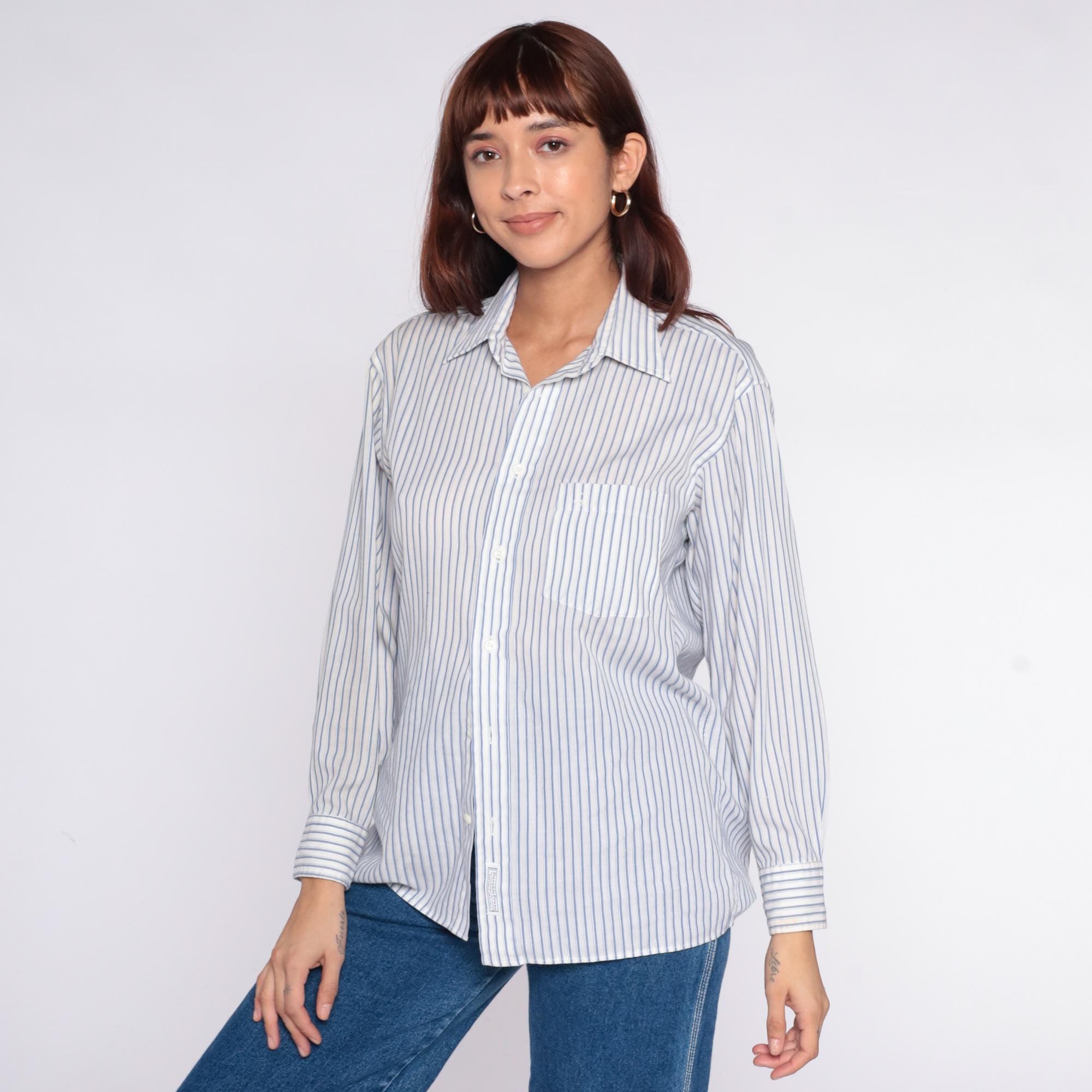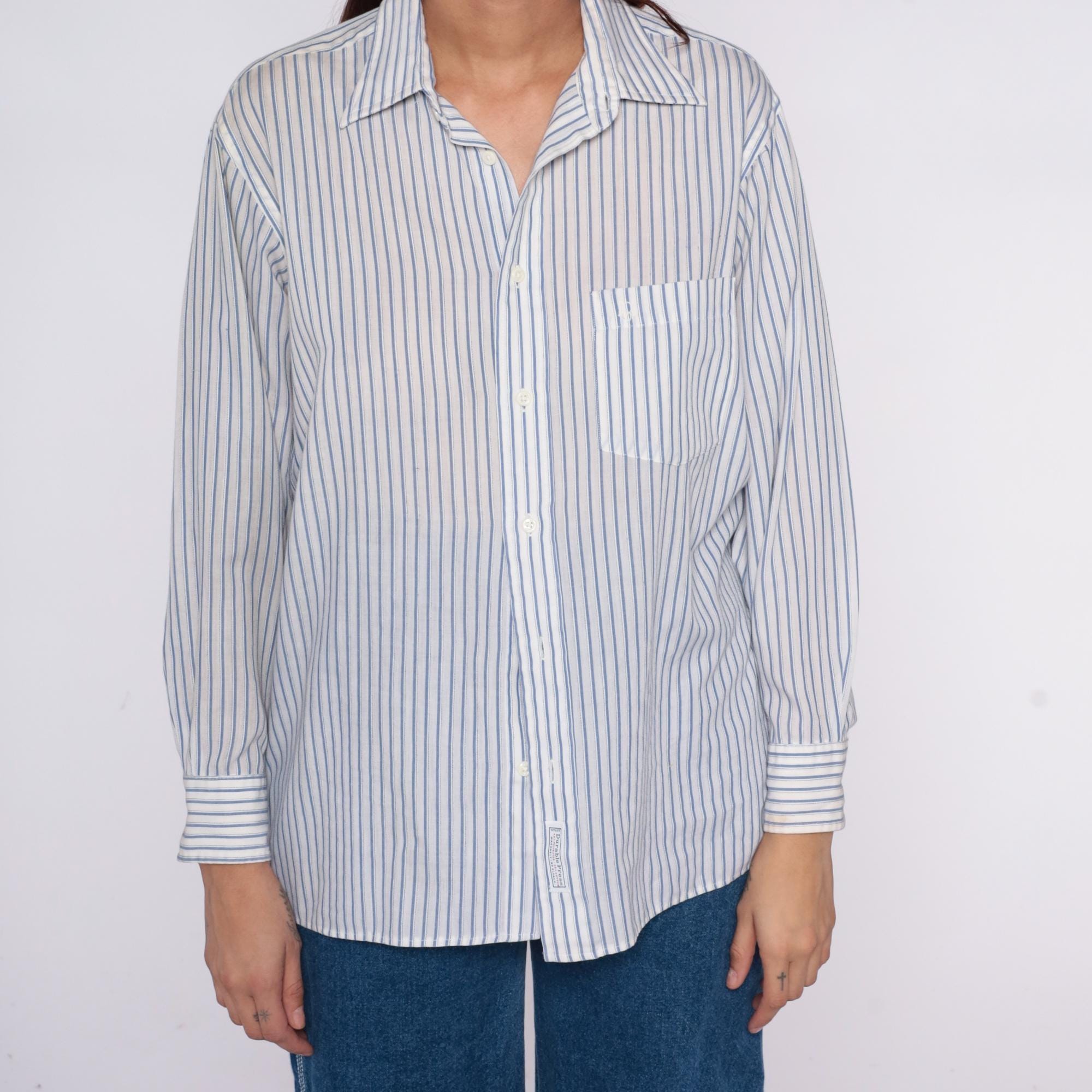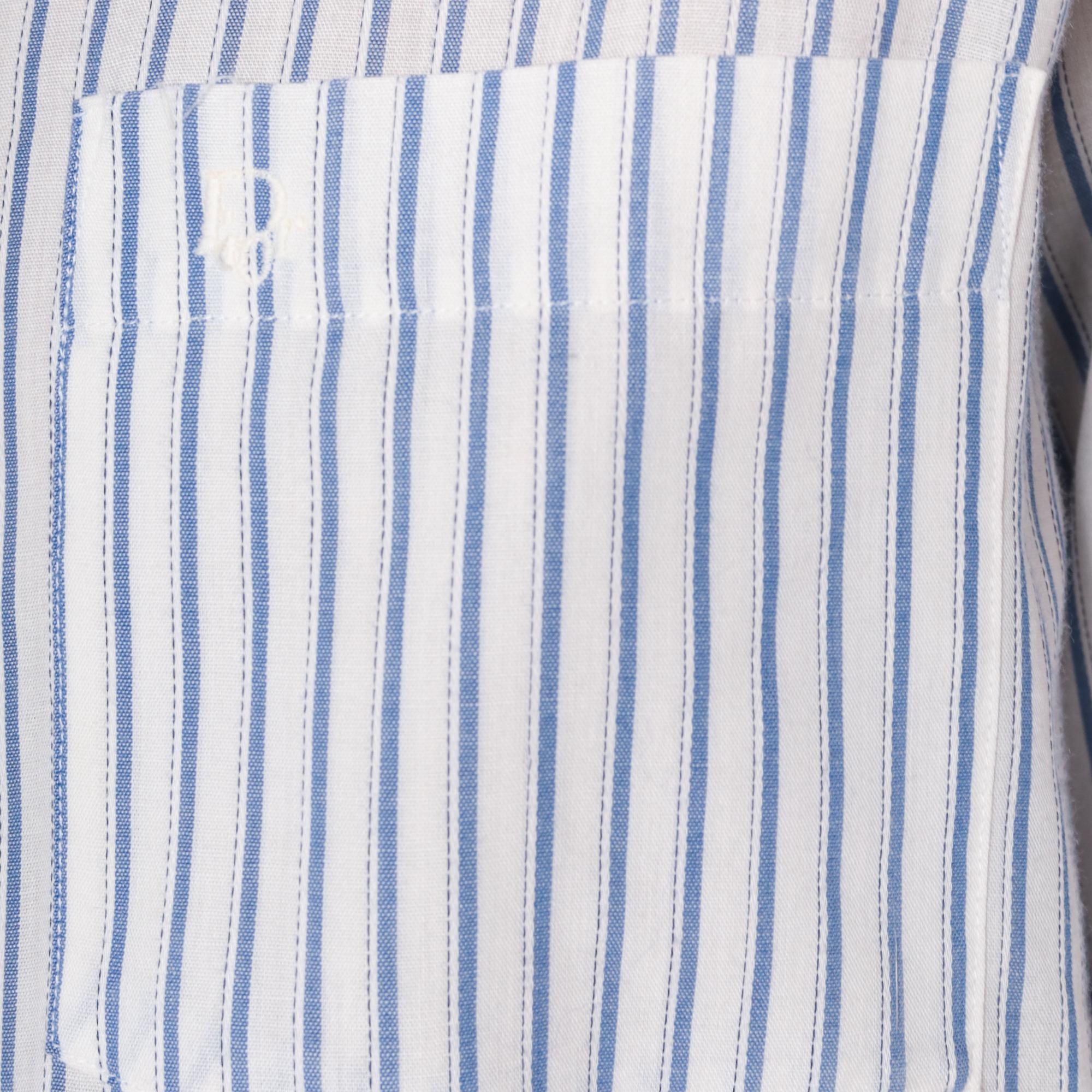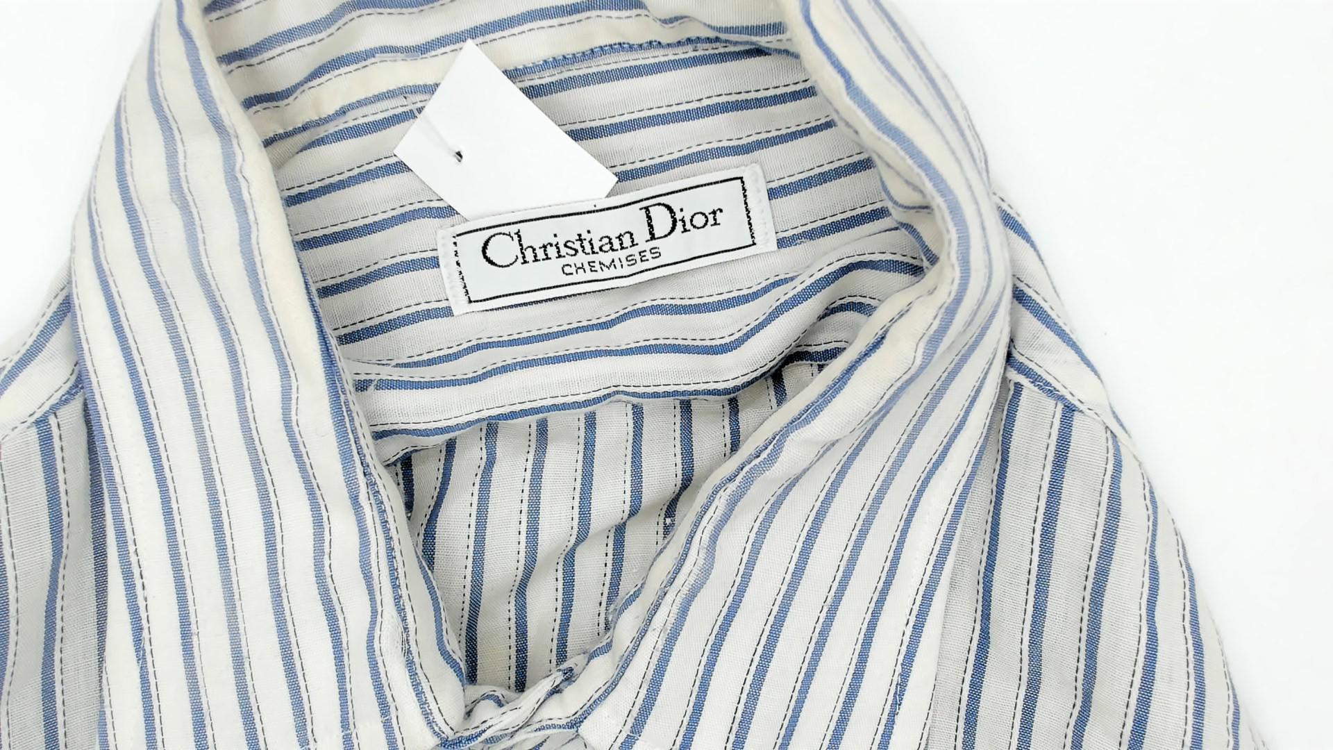 90s blue and white vertical striped button-down shirt from Christian Dior. Long sleeves with button cuffs, pointed collar, and single chest pocket. Full button front closure.
