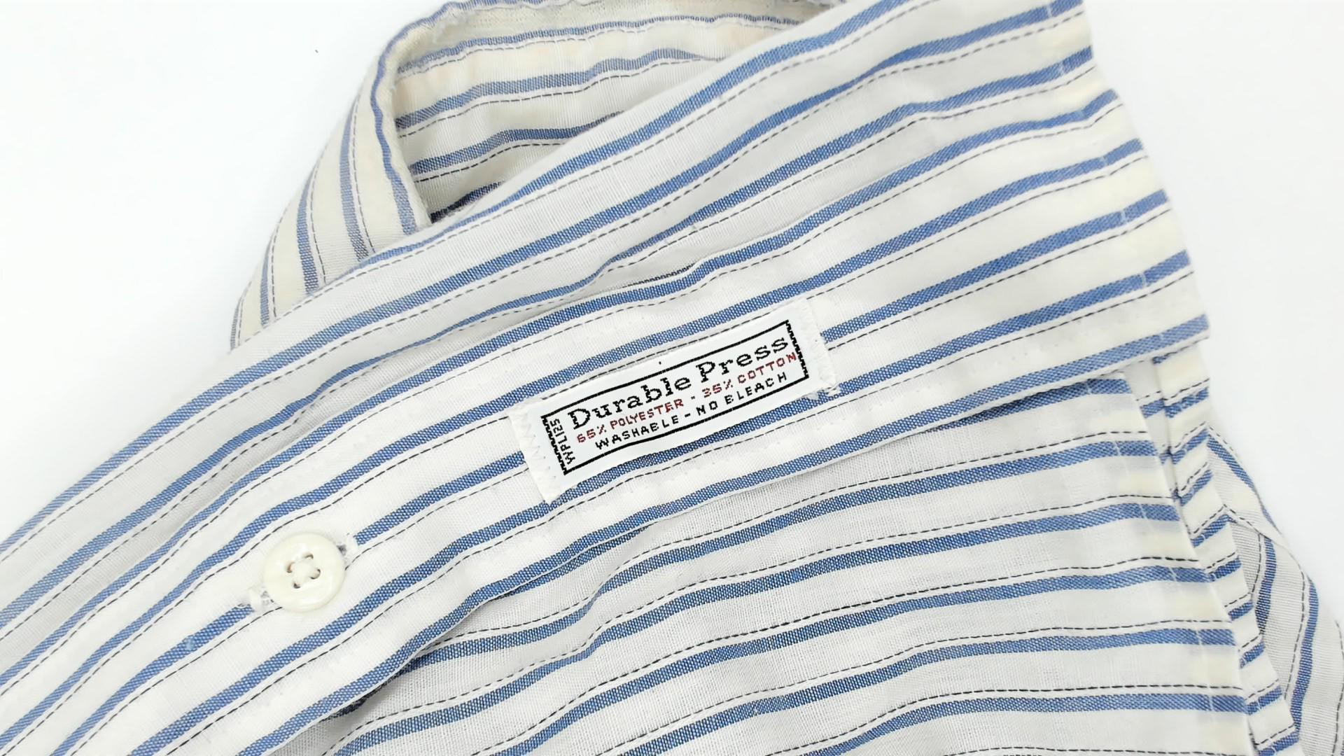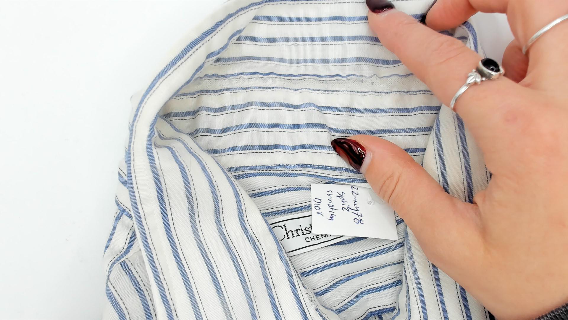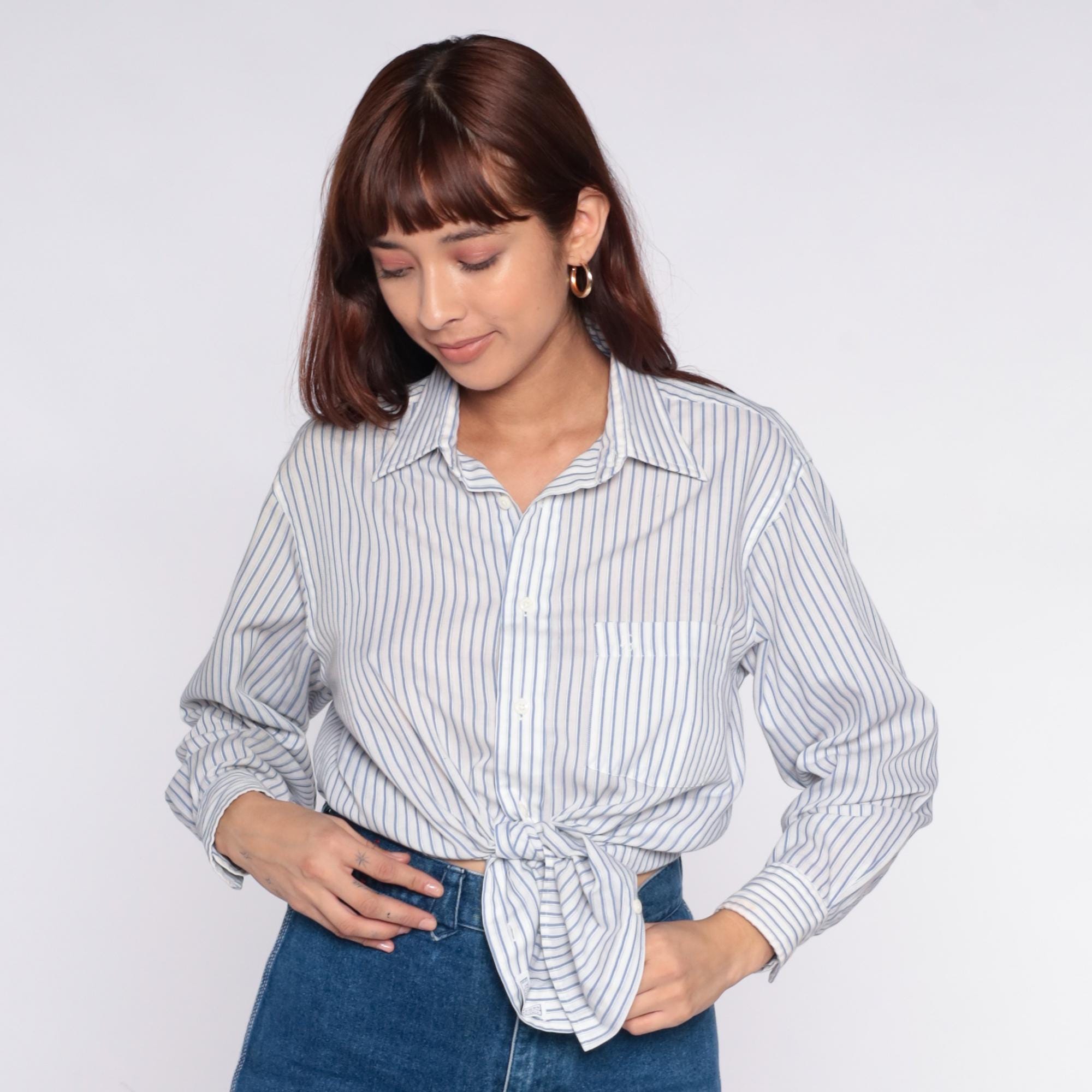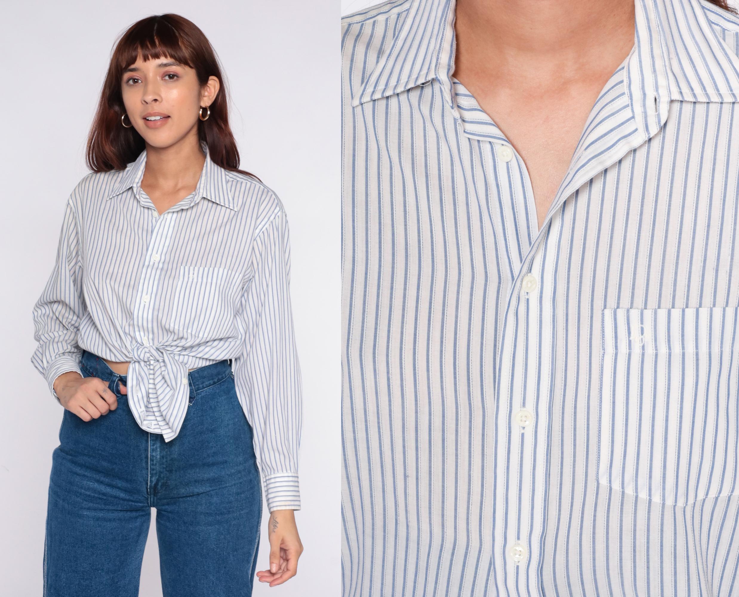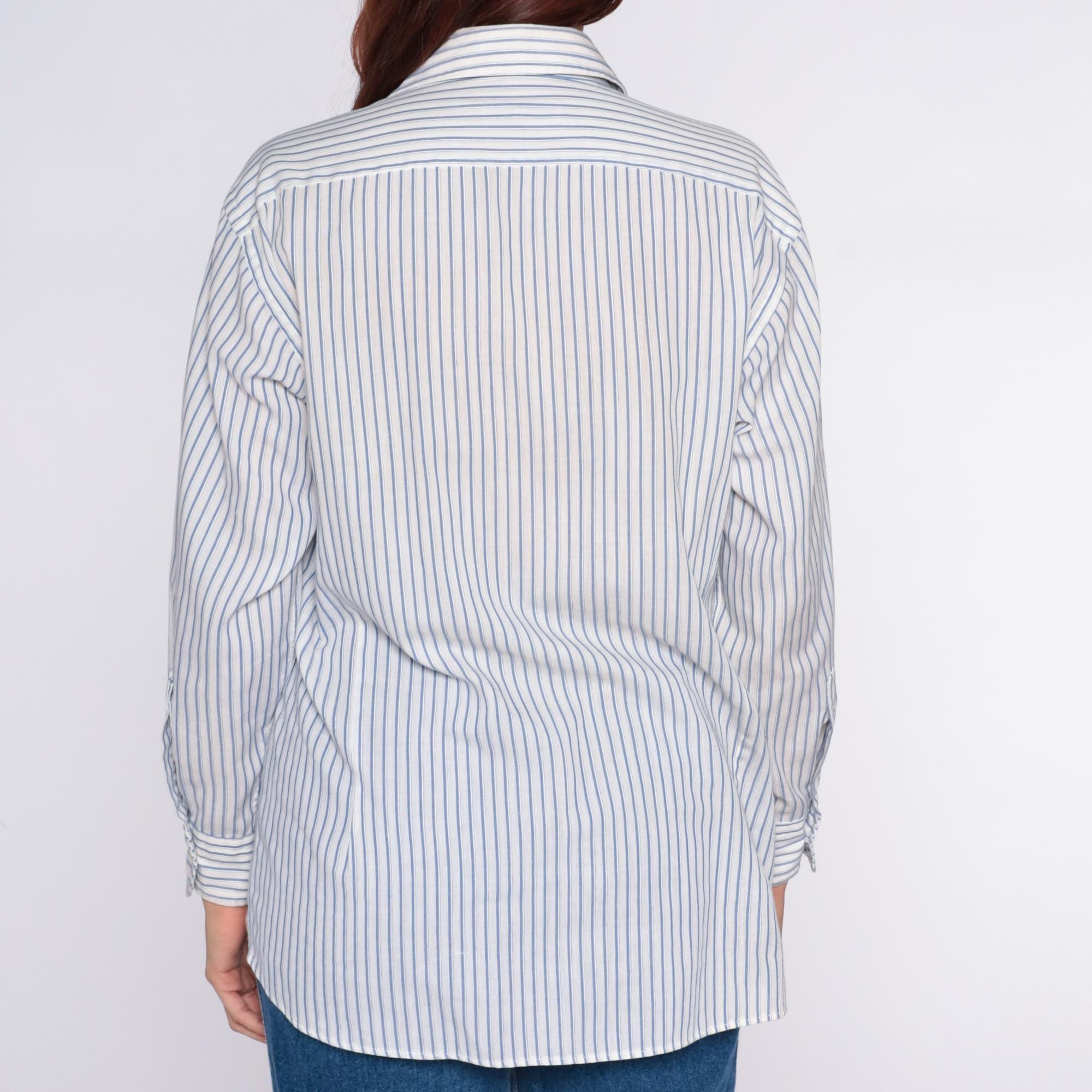 90s blue and white vertical striped button-down shirt from Christian Dior. Long sleeves with button cuffs, pointed collar, and single chest pocket. Full button front closure.