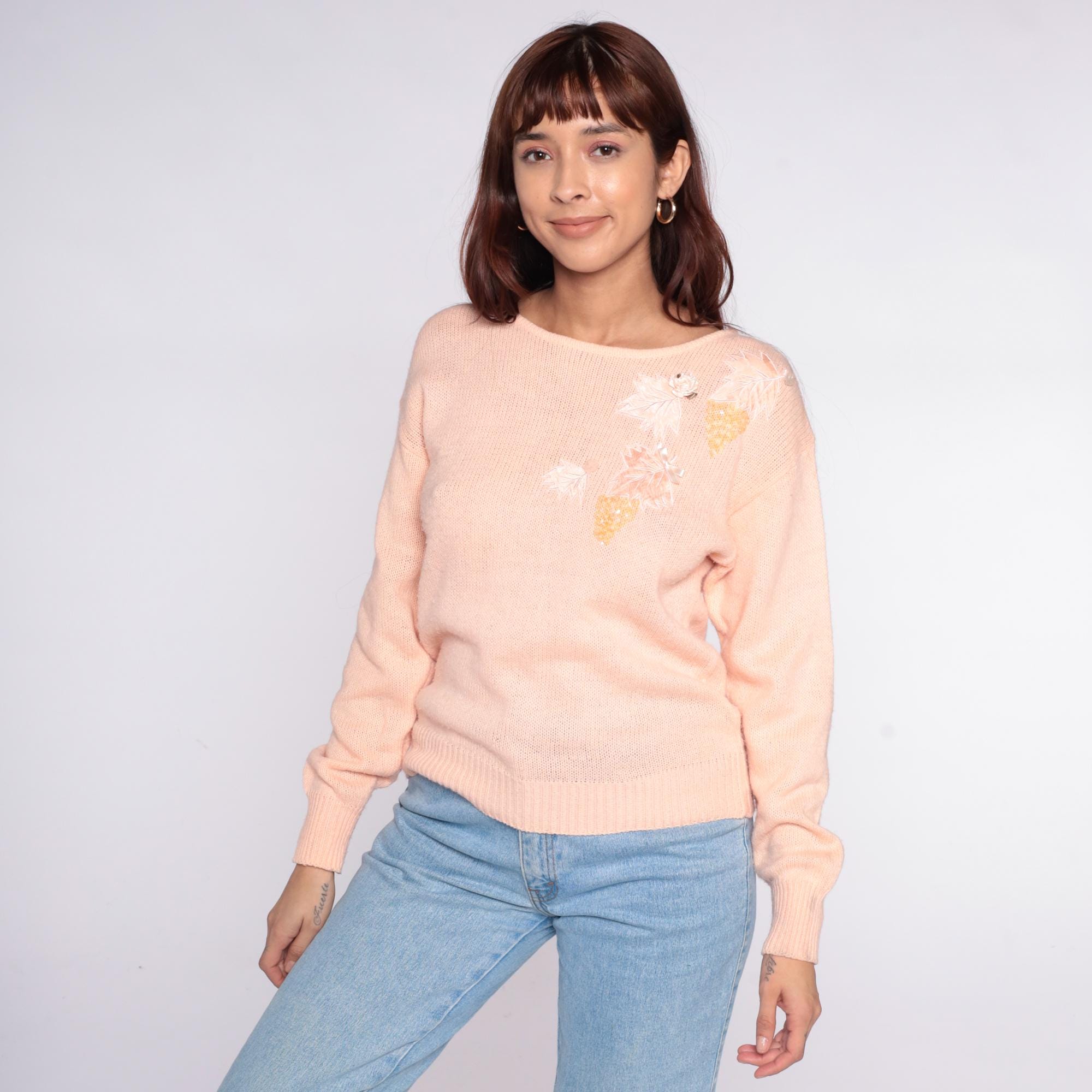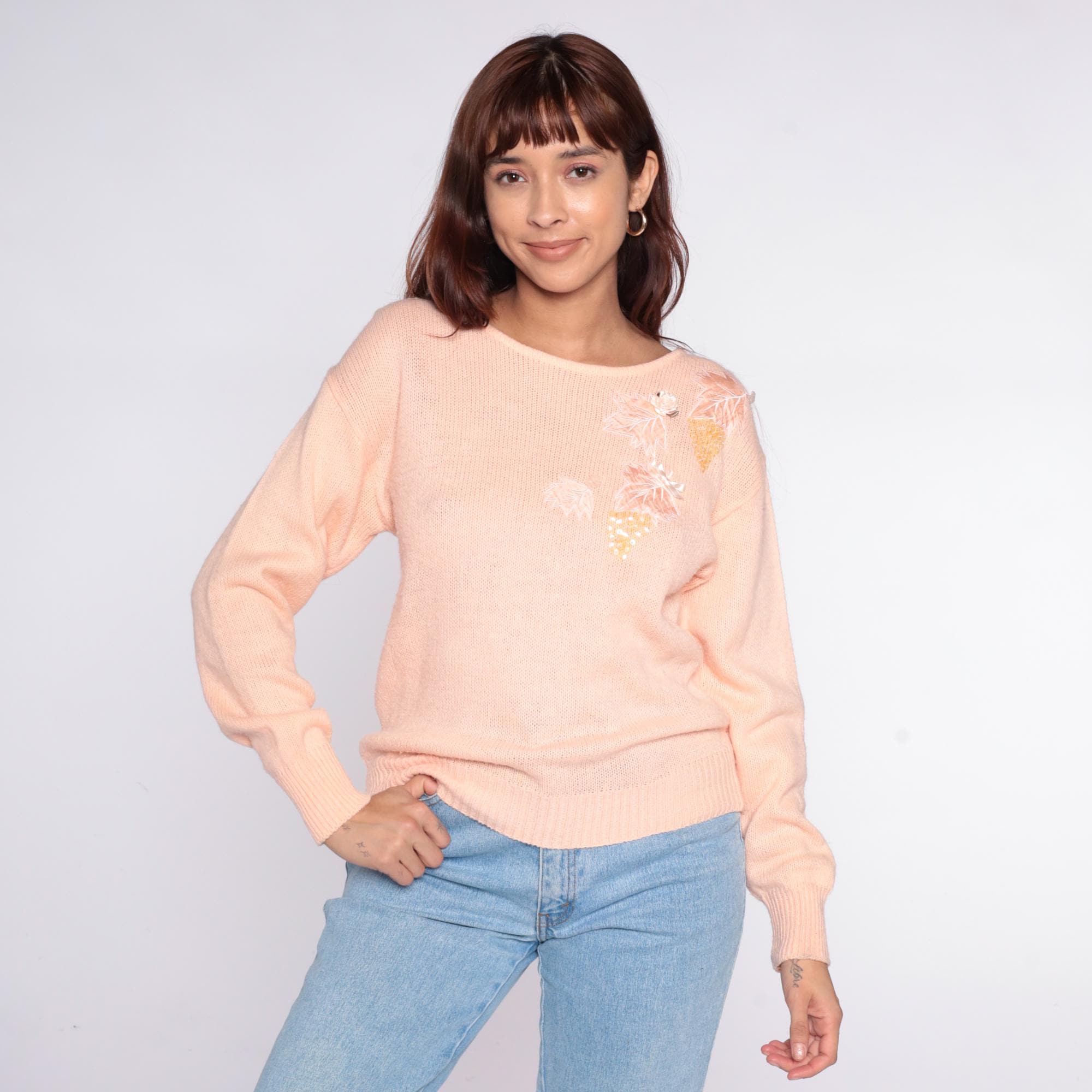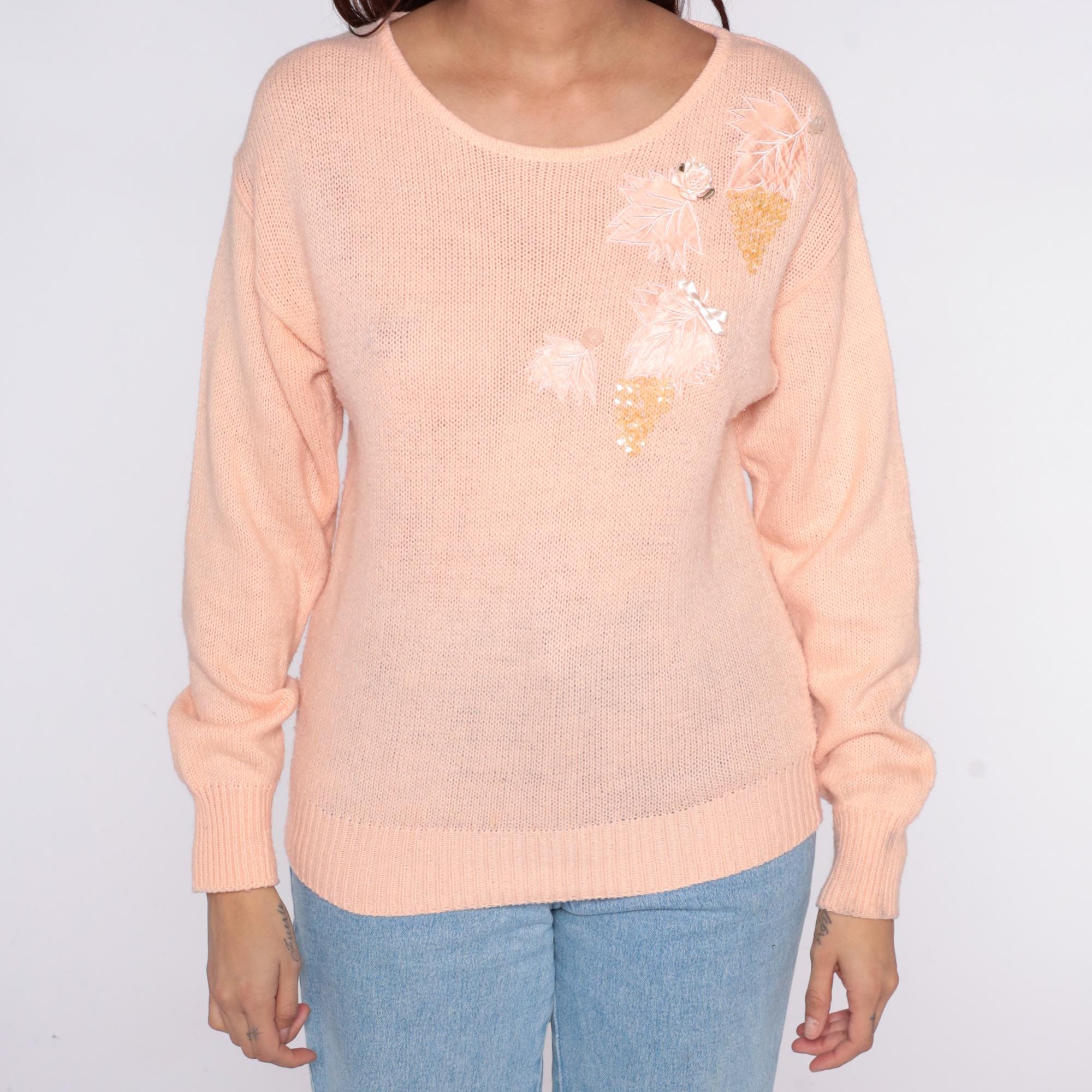 80s peach knit sweater from Sheridan Square with white feather and gold sequin appliqué on the upper chest. Round scoop neckline, long sleeves with ribbed cuffs, ribbed hem.