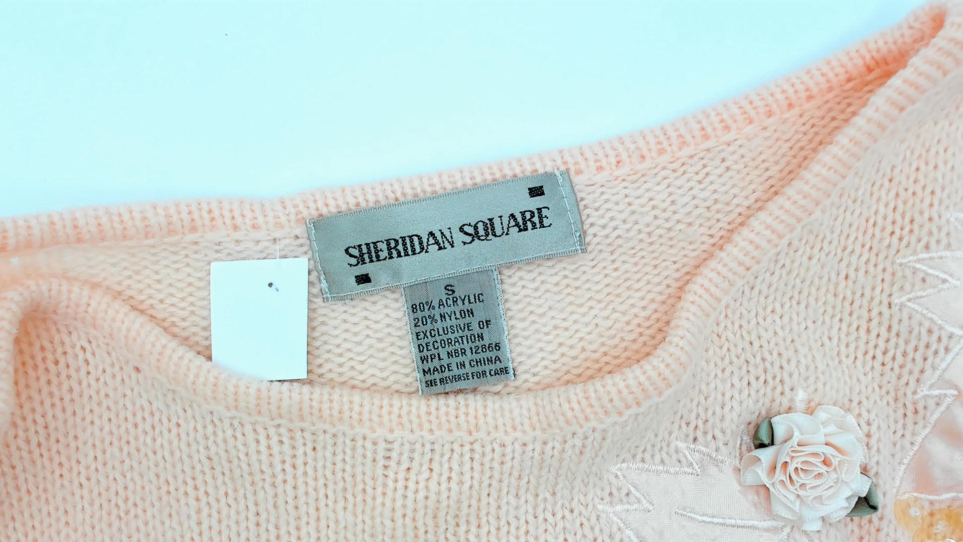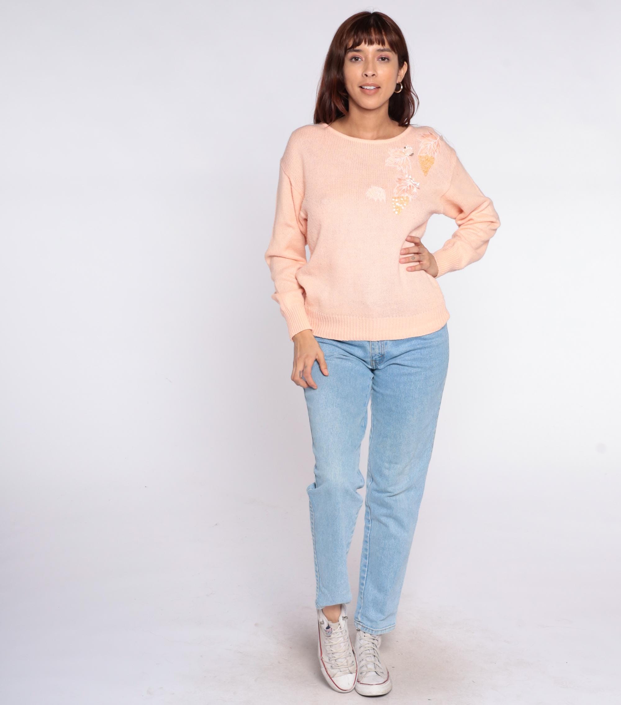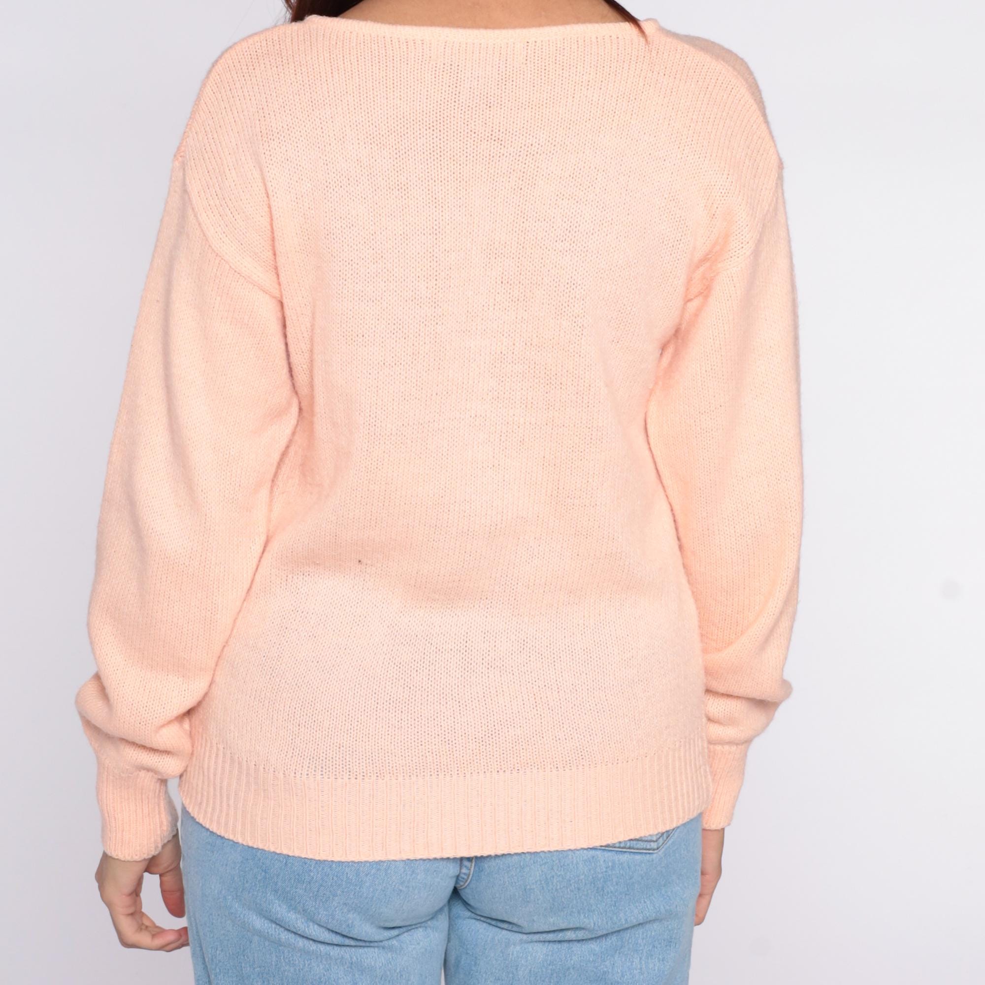 80s peach knit sweater from Sheridan Square with white feather and gold sequin appliqué on the upper chest. Round scoop neckline, long sleeves with ribbed cuffs, ribbed hem.