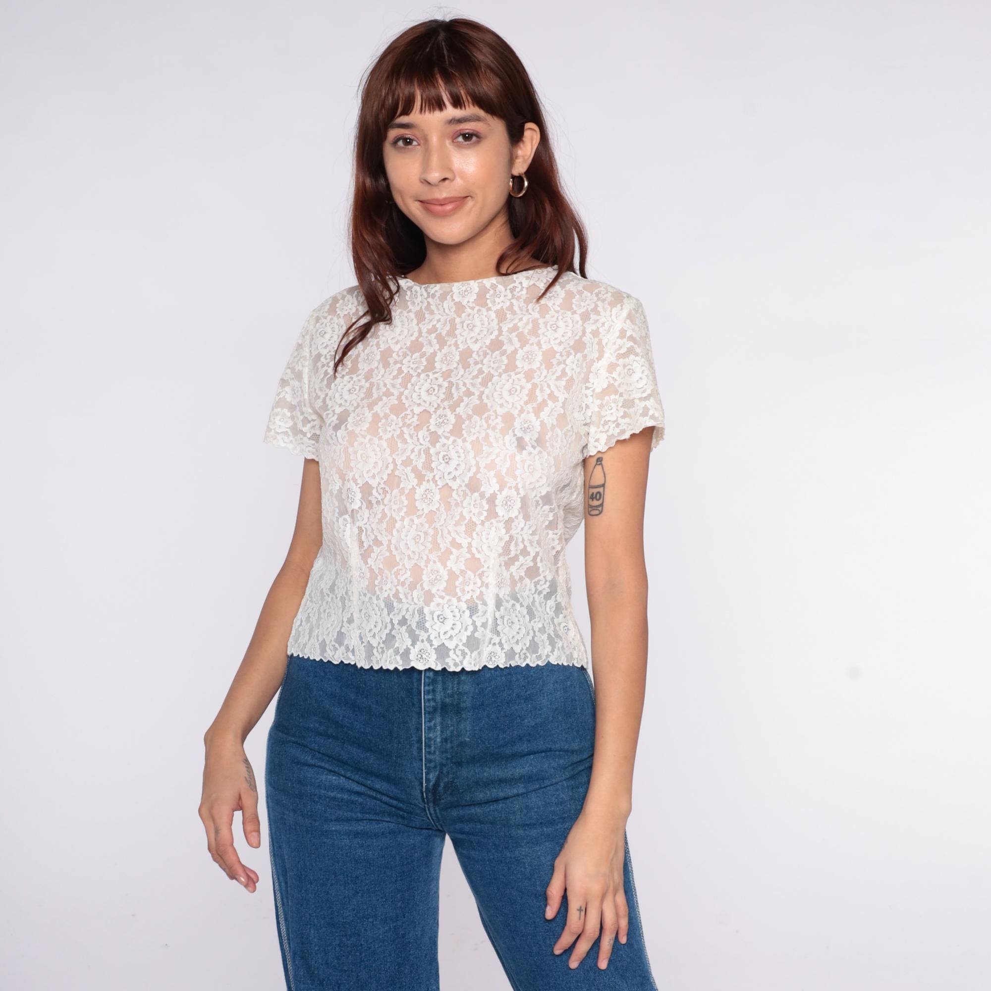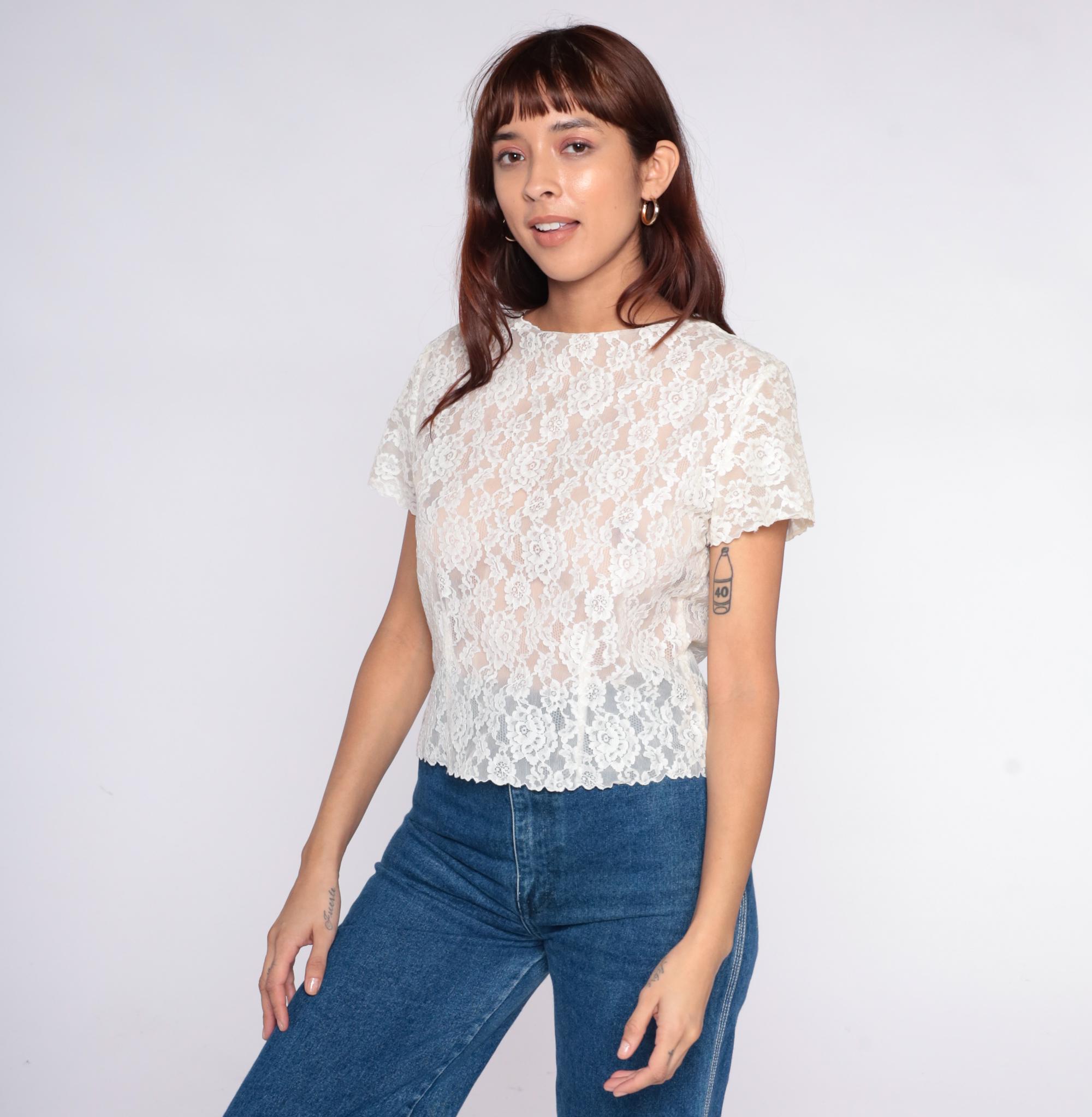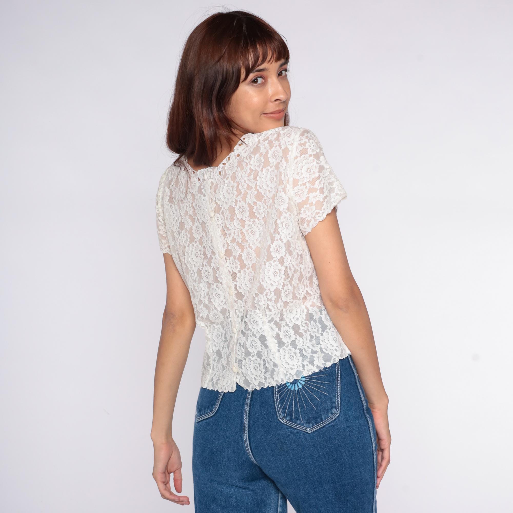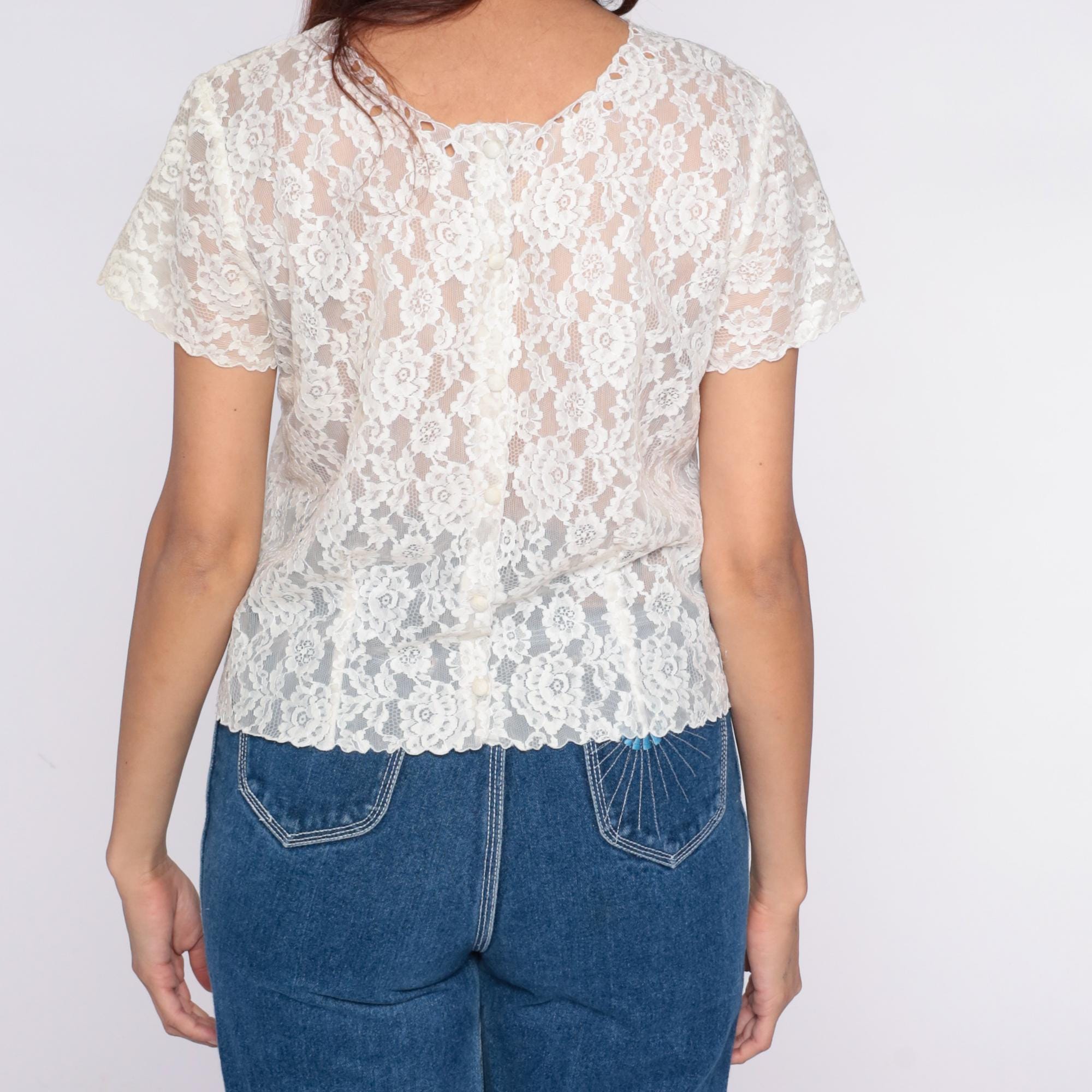 70s white lace blouse with all-over floral lace pattern and scalloped trim at sleeves and hem. Short sleeves, semi-sheer construction, rounded neckline.
