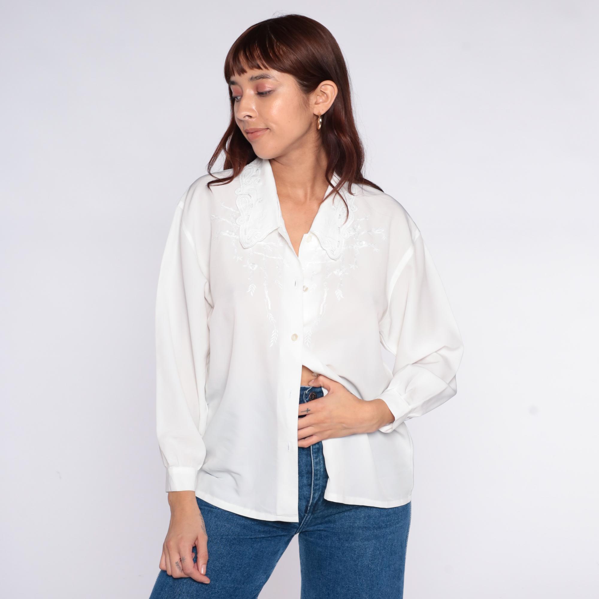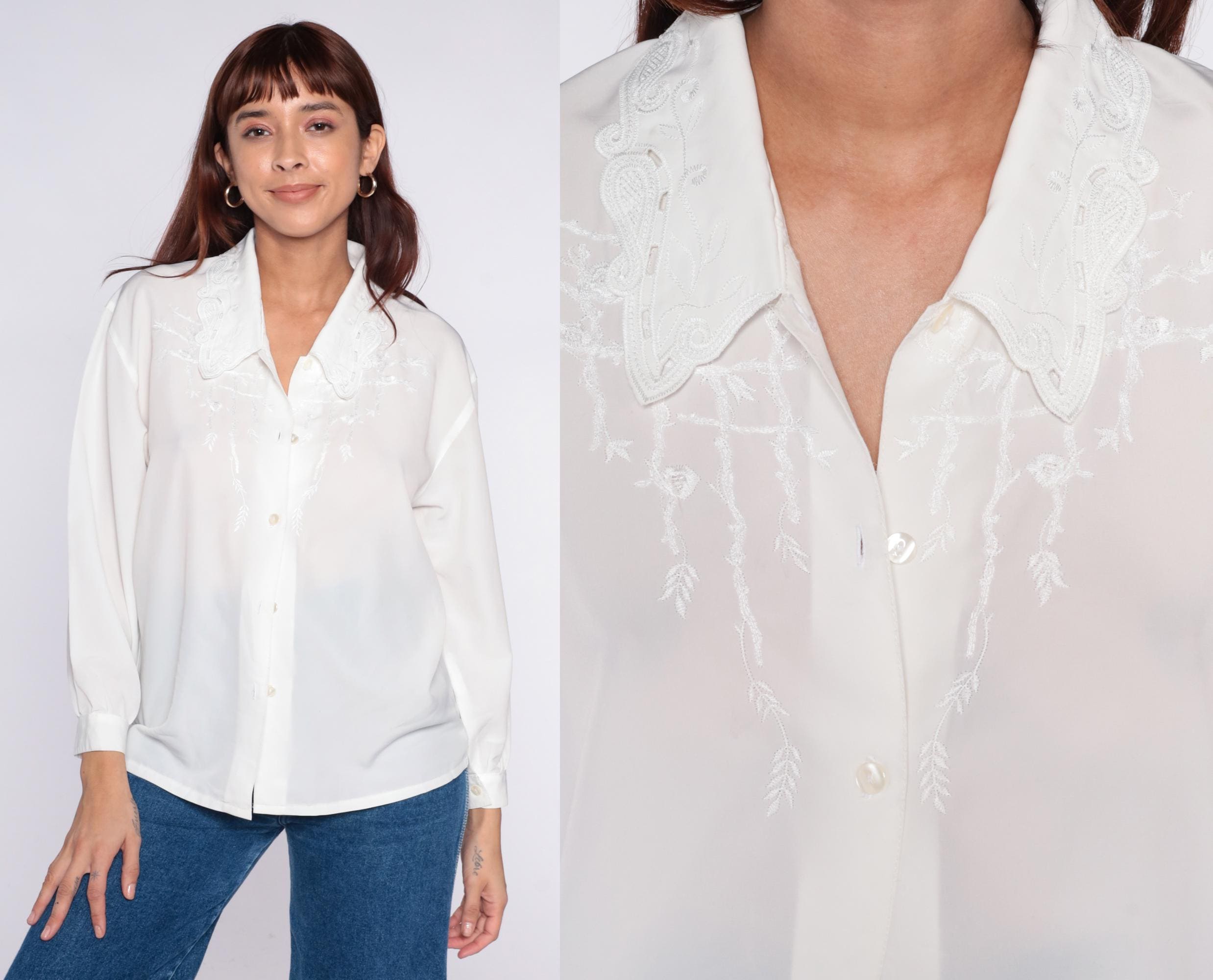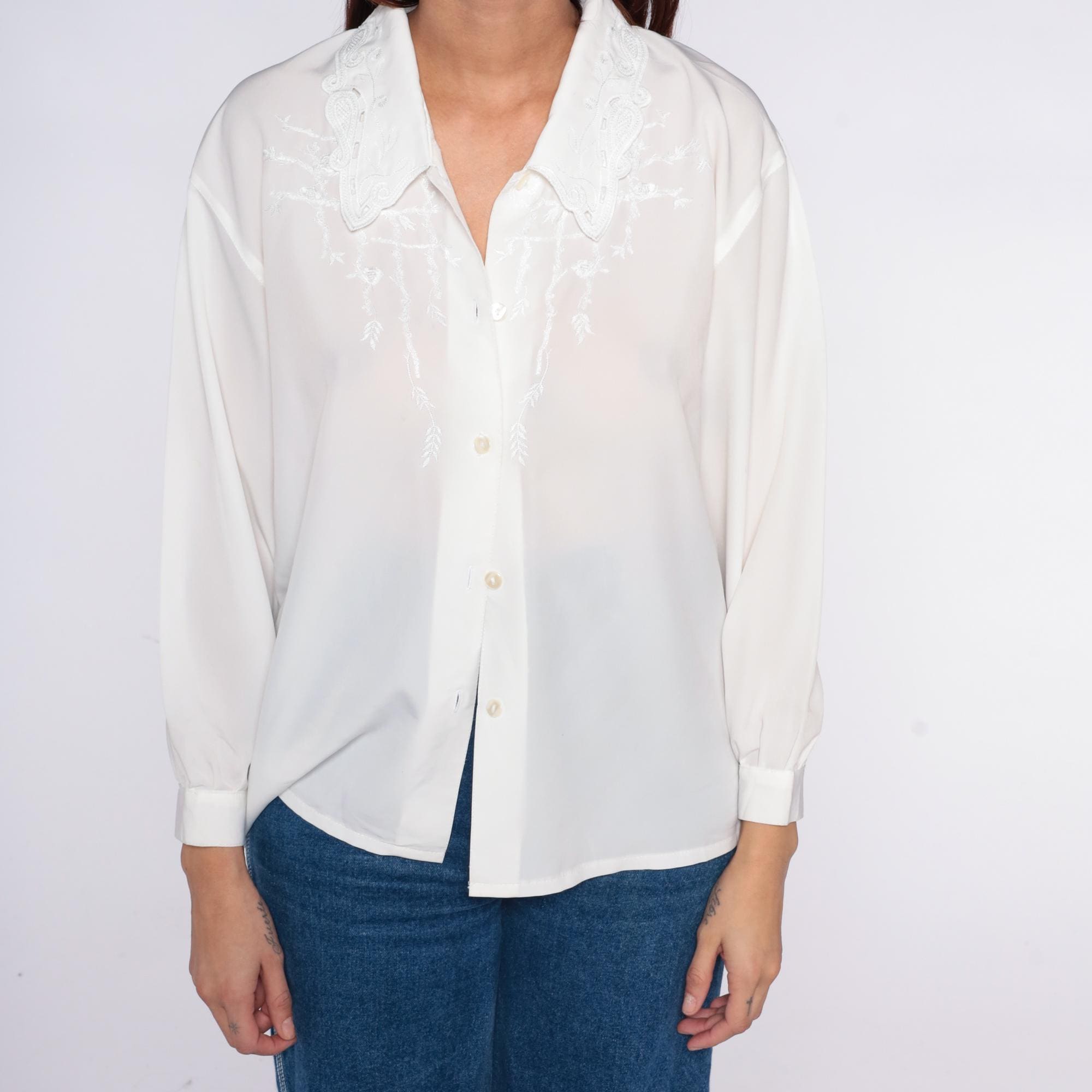 90s oat white blouse with embroidered collar featuring white-on-white decorative stitching in a paisley-inspired pattern. Button front closure, long sleeves with button cuffs, semi-sheer fabric throughout.