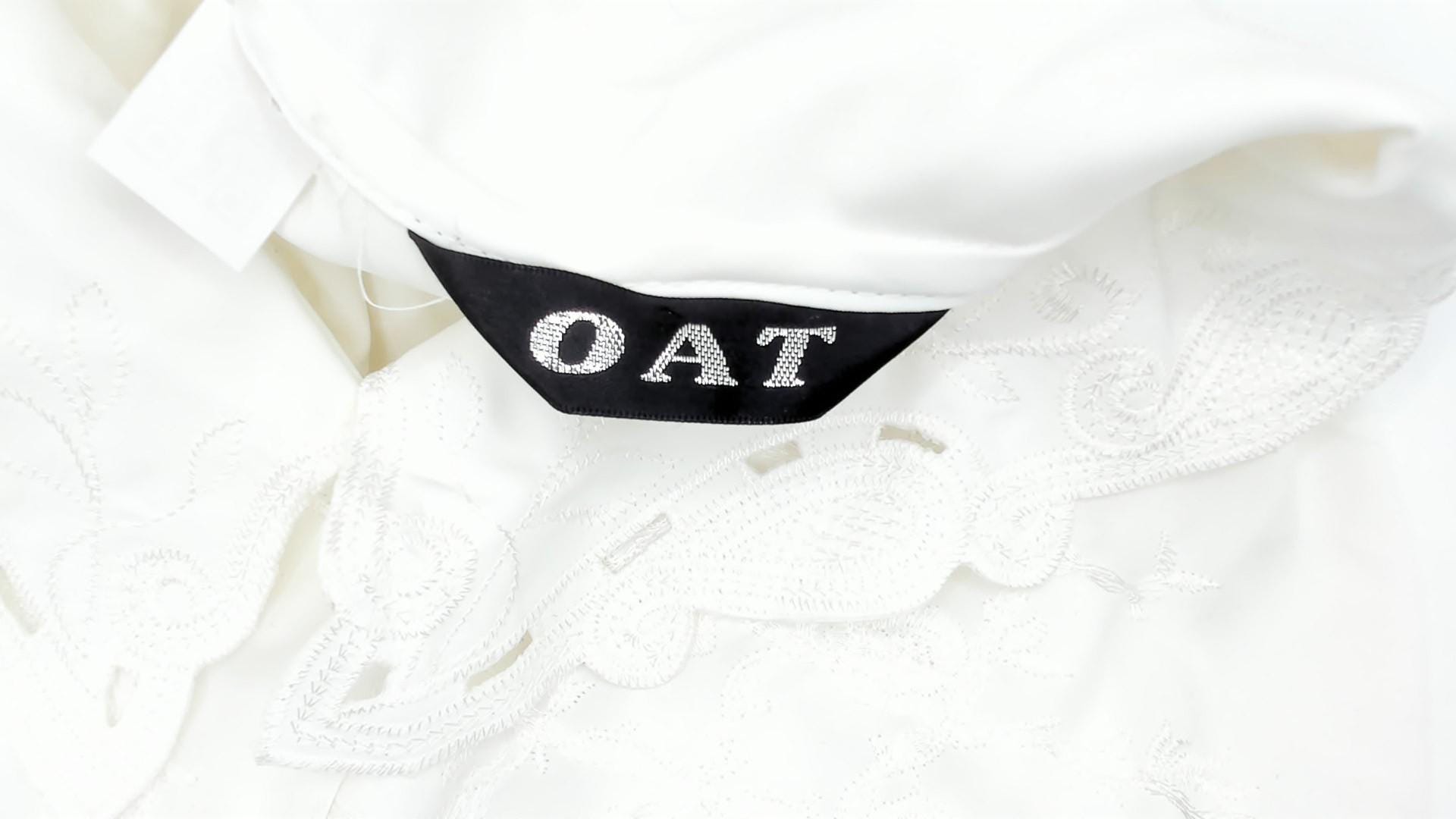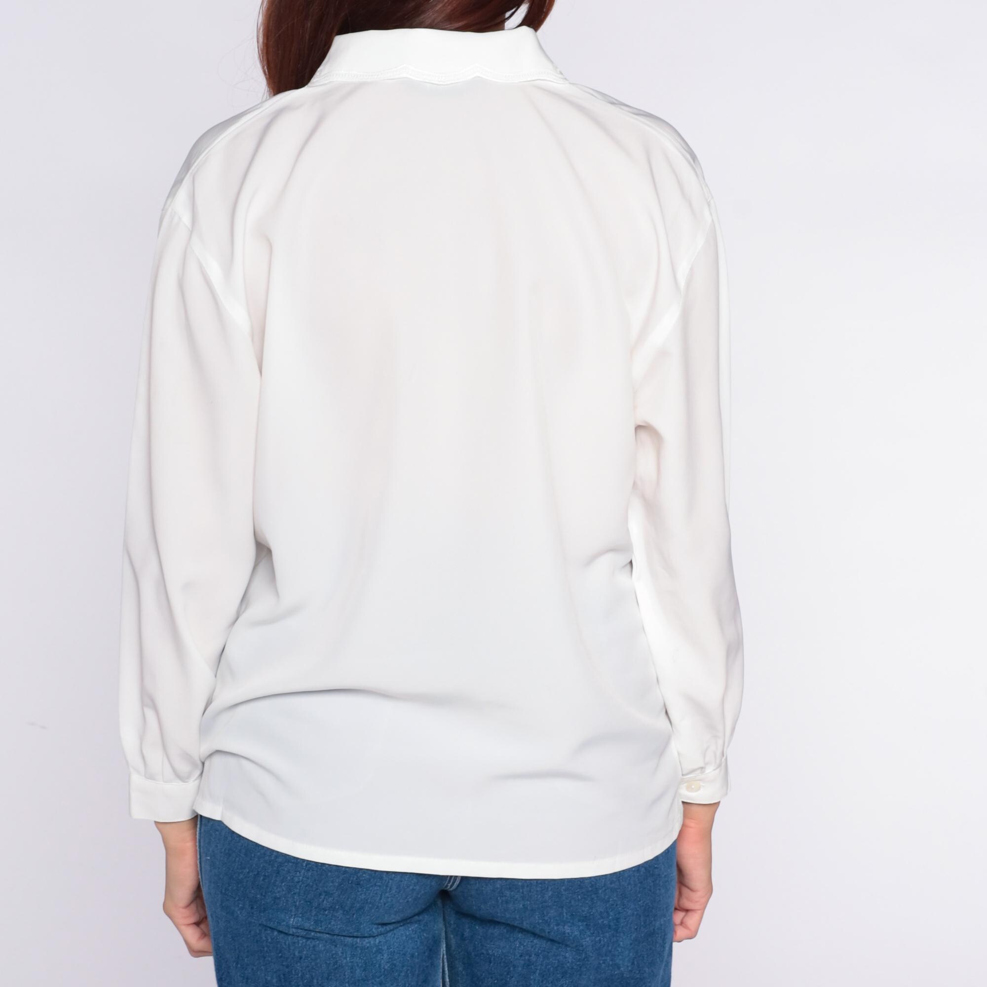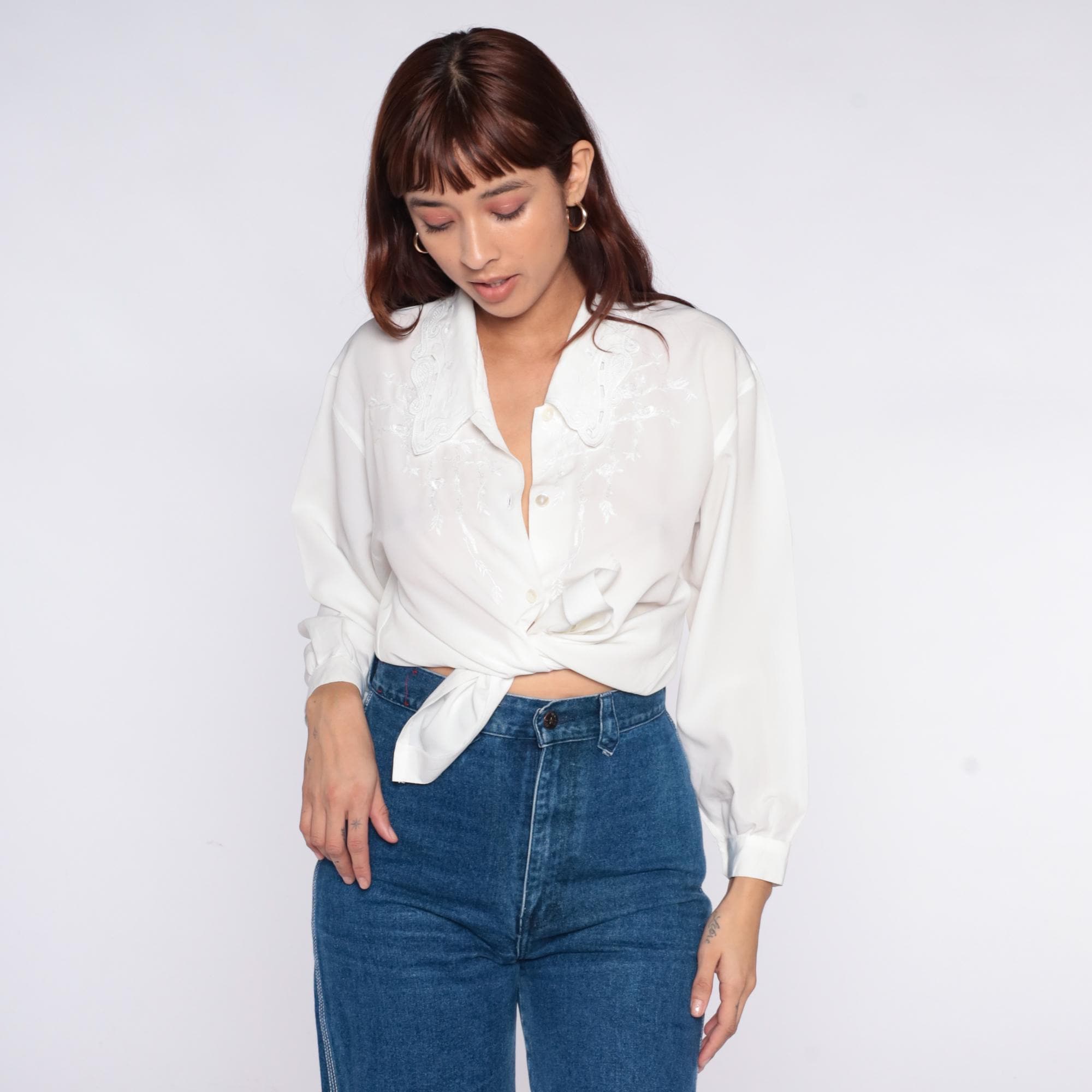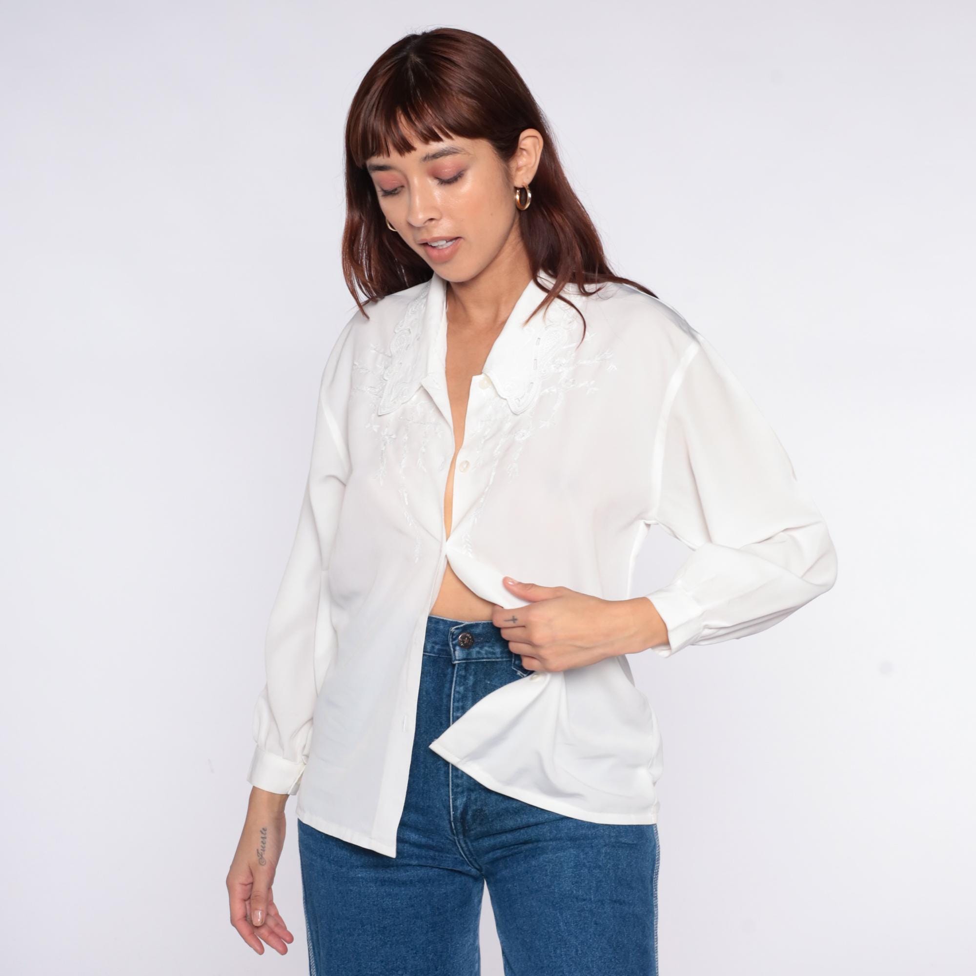 90s oat white blouse with embroidered collar featuring white-on-white decorative stitching in a paisley-inspired pattern. Button front closure, long sleeves with button cuffs, semi-sheer fabric throughout.