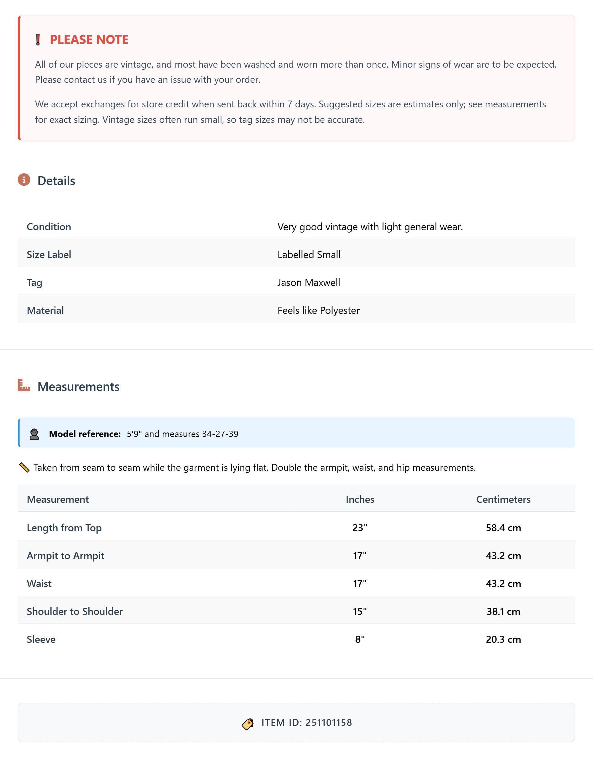 Suggested sizes are estimates only; see measurements for exact sizing. Vintage sizes often run small, so tag sizes may not be accurate.