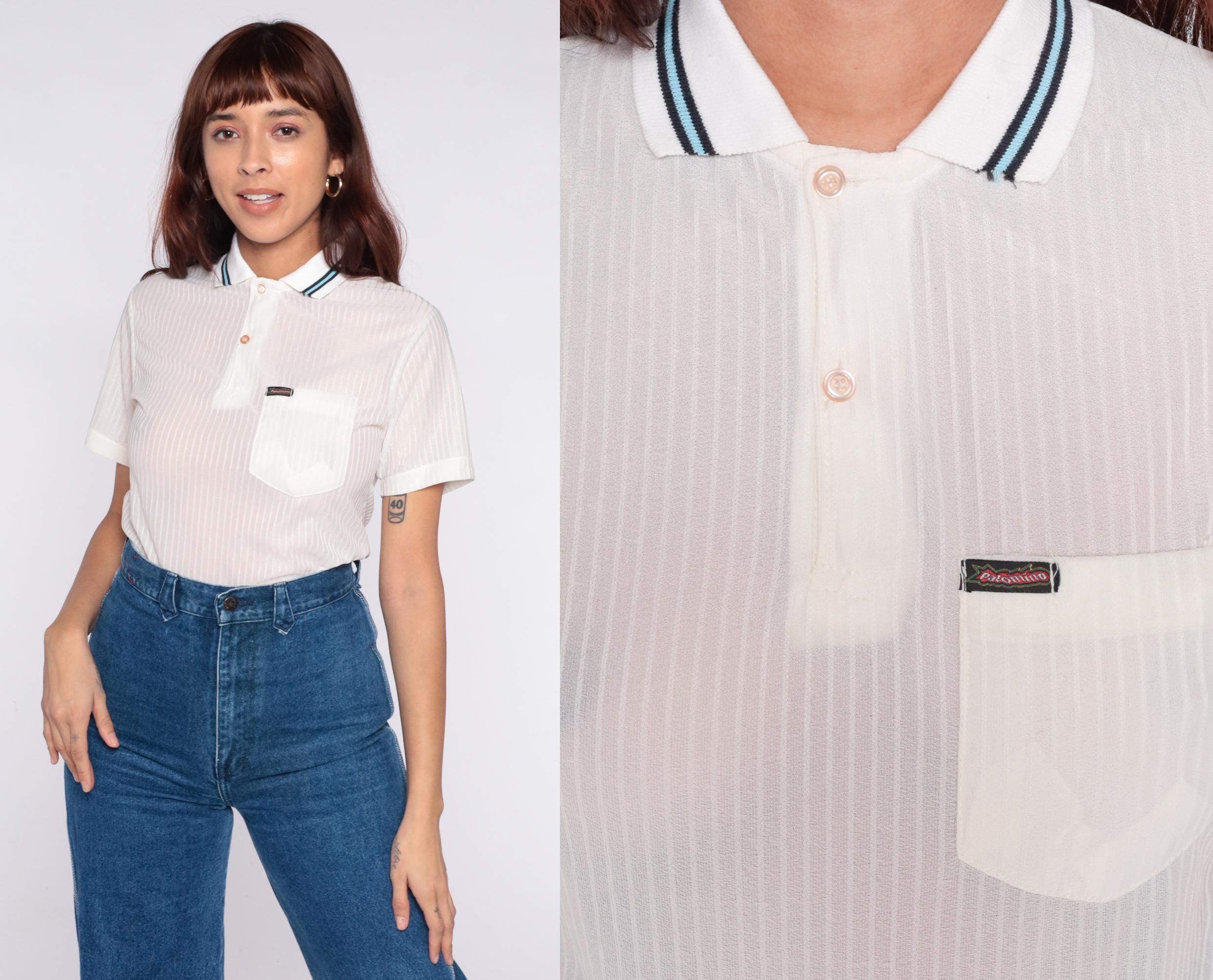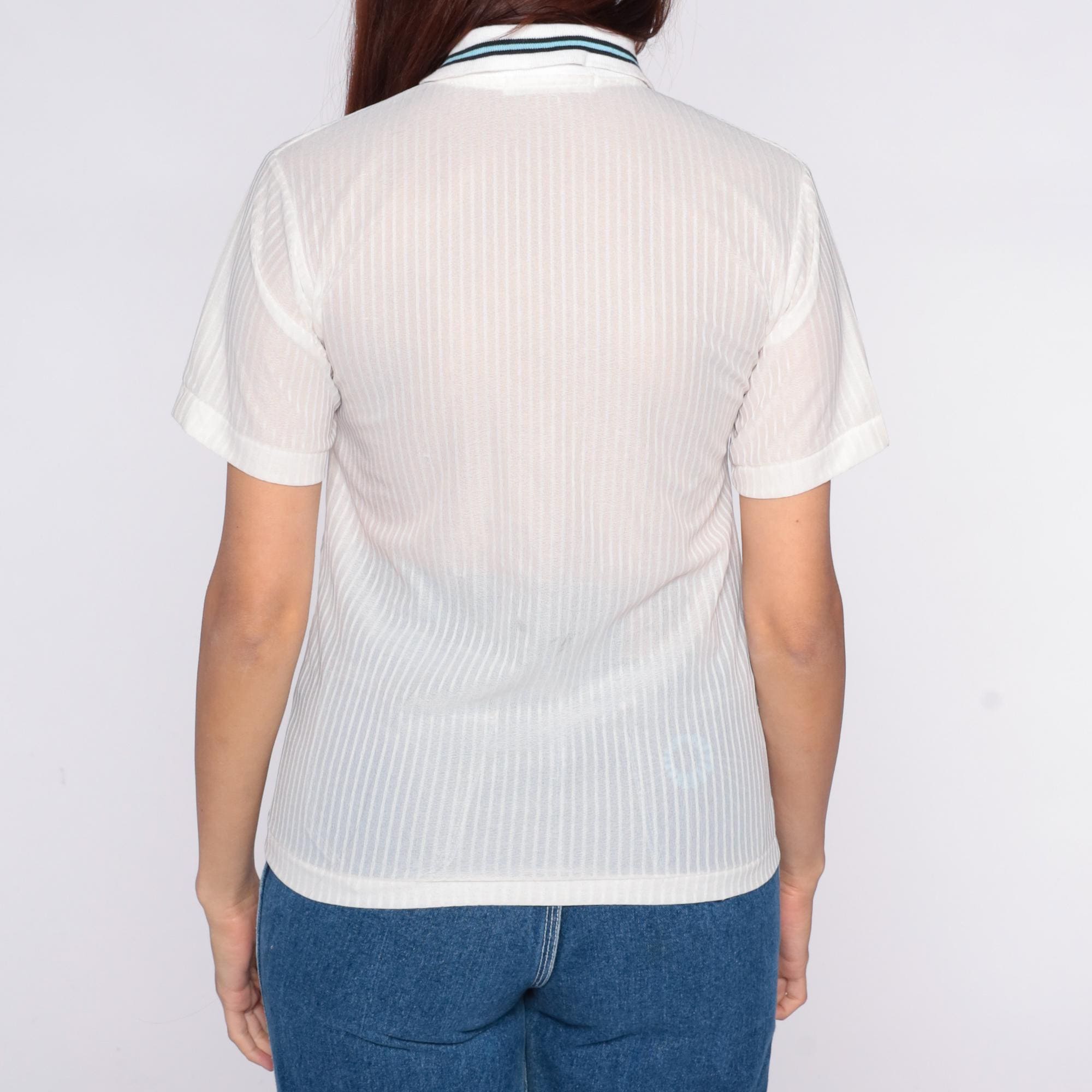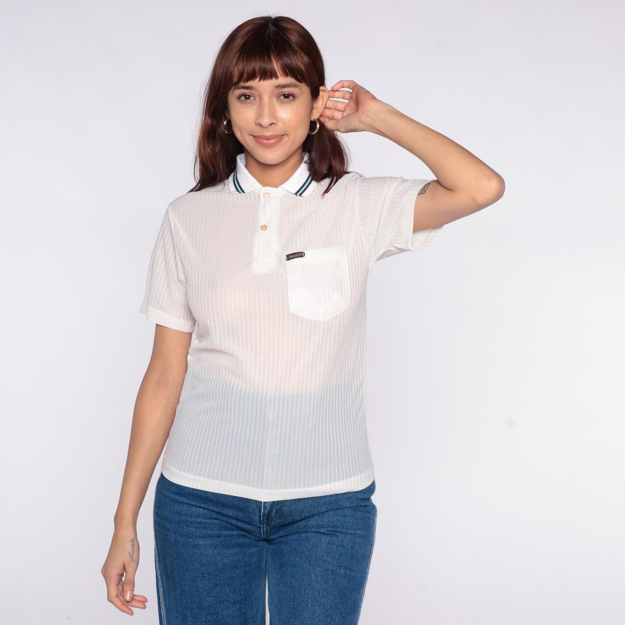 90s white ribbed polo shirt from Jason Maxwell with teal and black striped collar and short sleeves. Button front placket, chest pocket with brand label, semi-sheer vertical ribbed texture throughout.