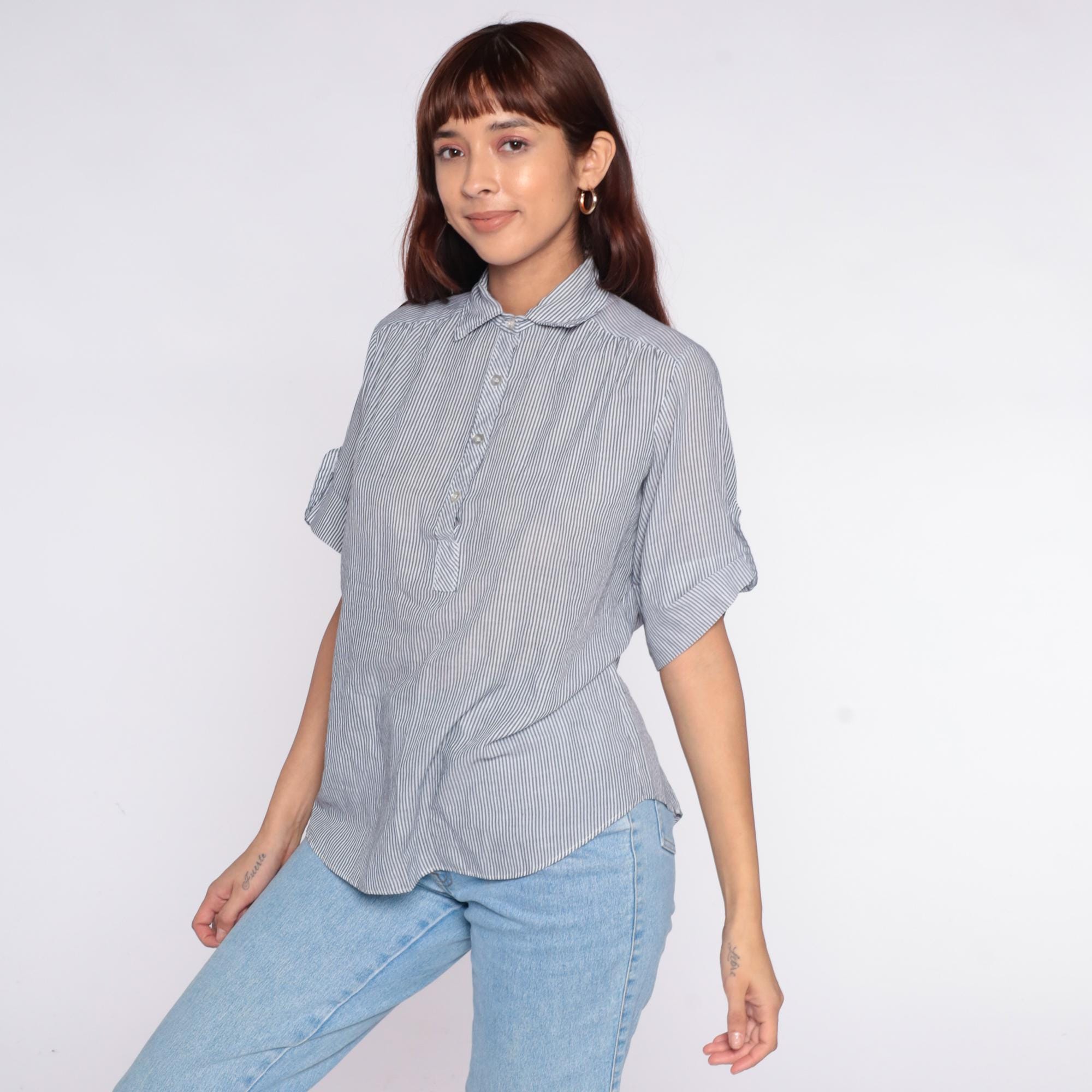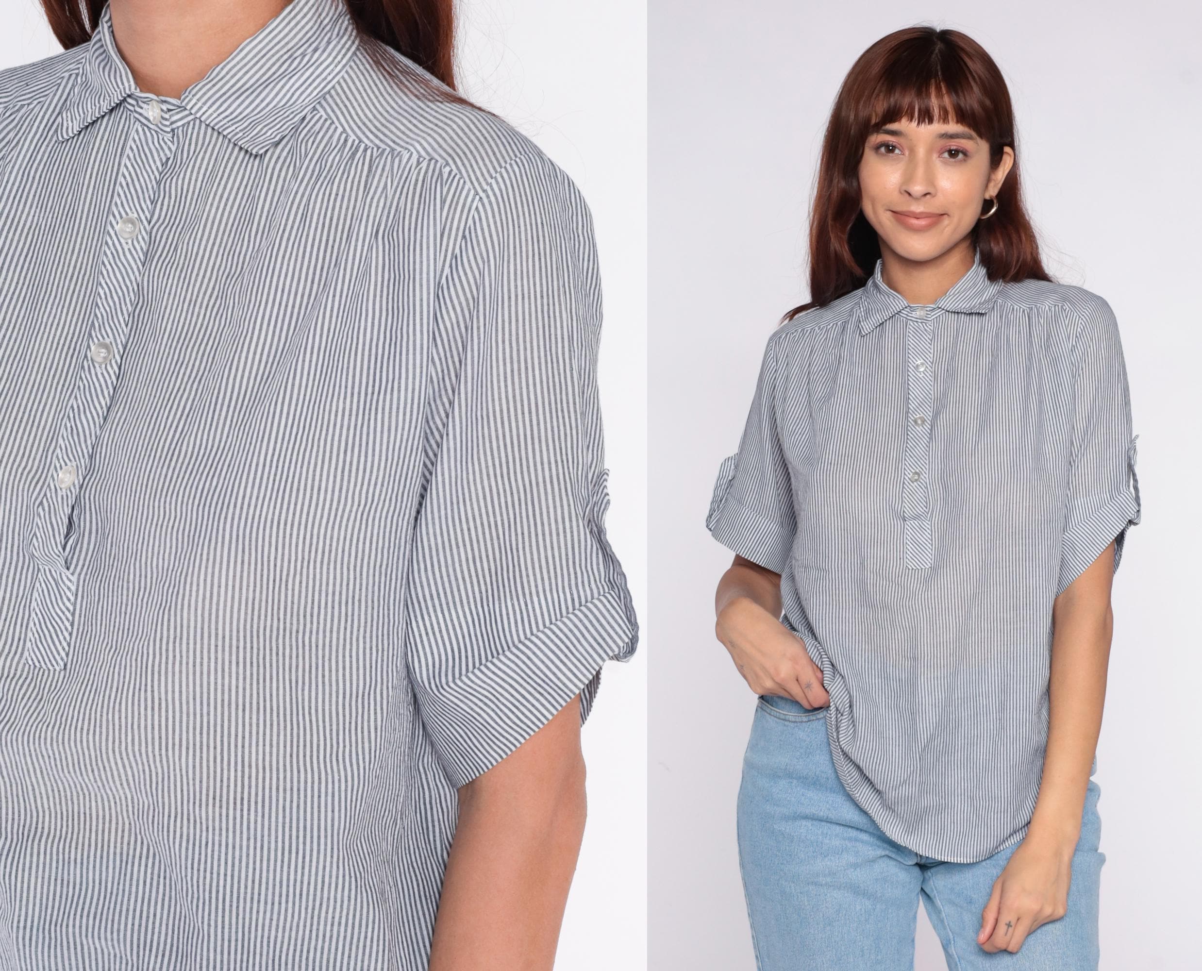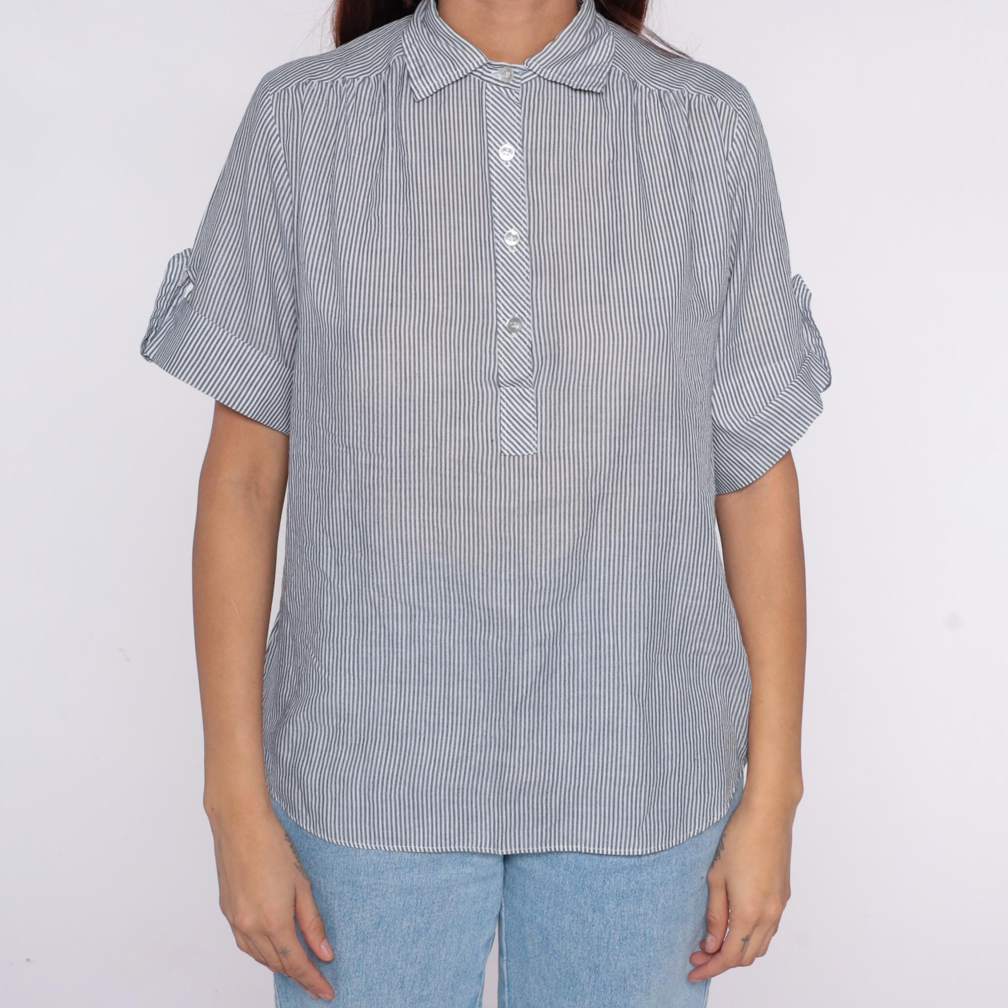 80s blue and white striped shirt from miss fashionality with collared neckline and tie detail at center front. Button front closure, short sleeves with rolled cuffs. Vertical pinstripe pattern throughout.