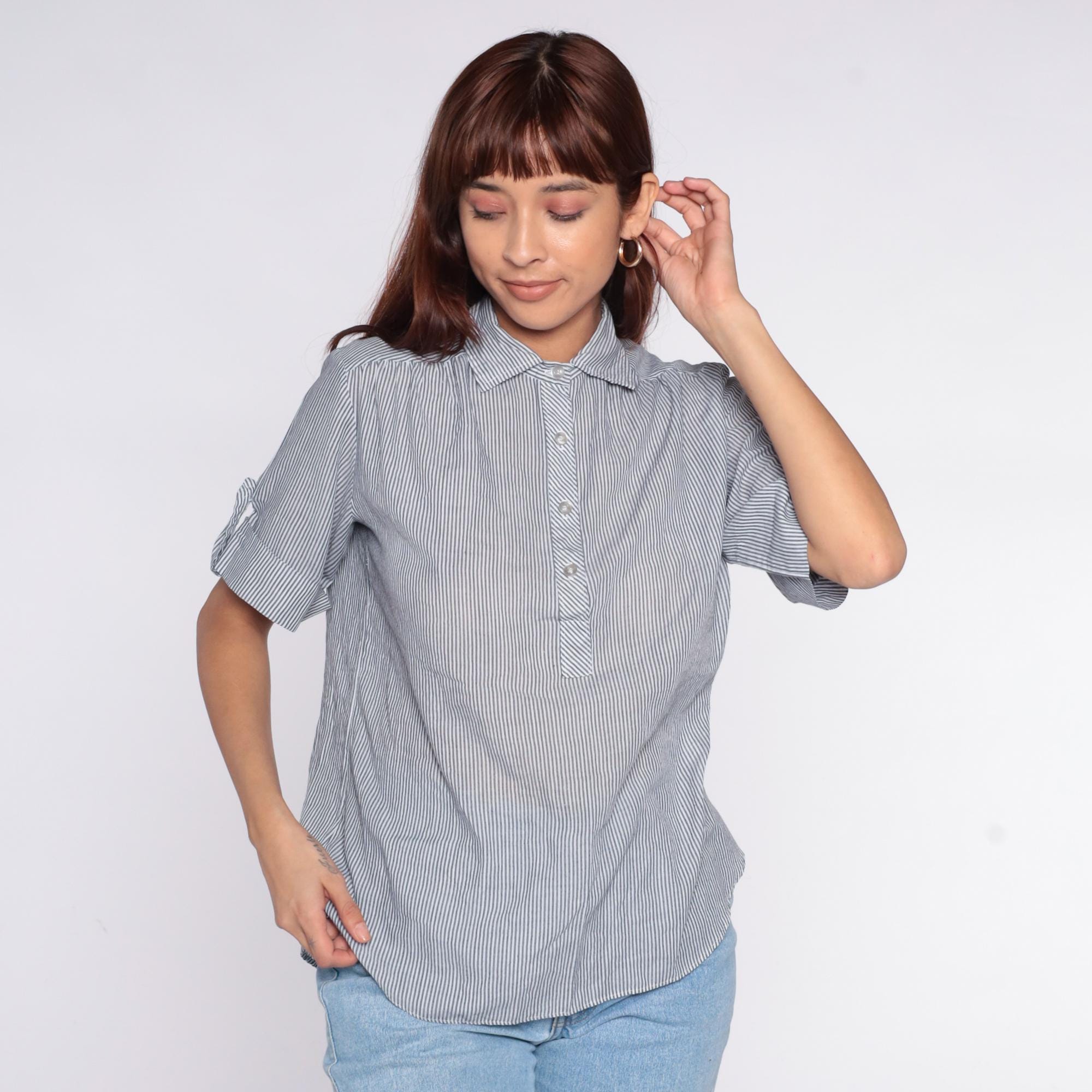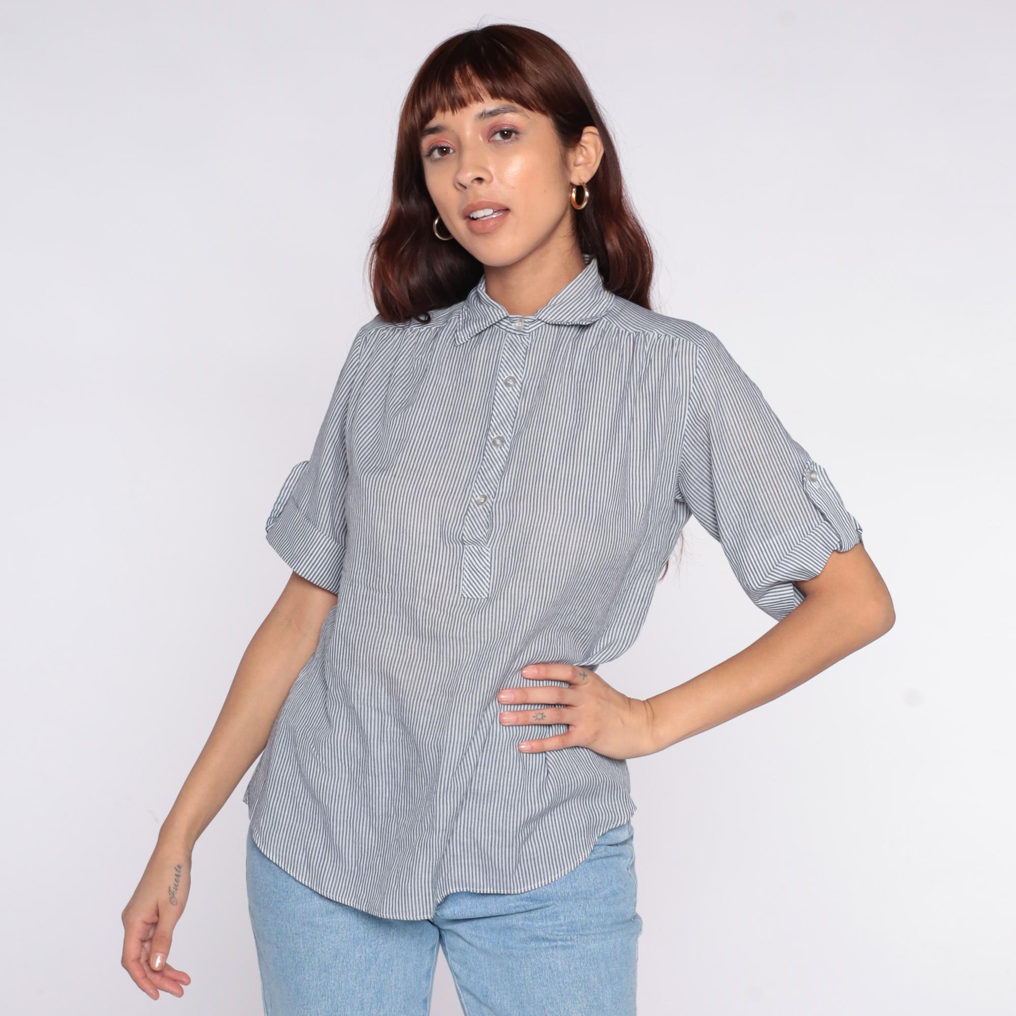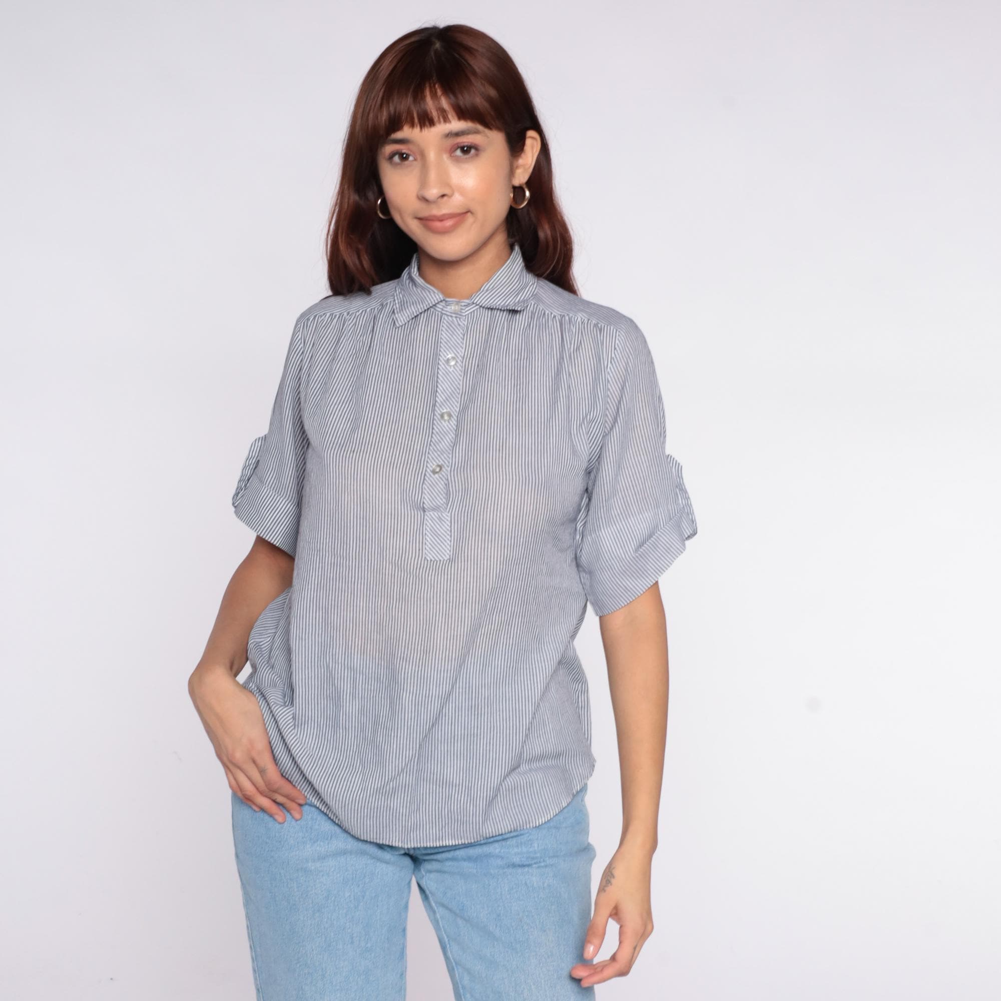 80s blue and white striped shirt from miss fashionality with collared neckline and tie detail at center front. Button front closure, short sleeves with rolled cuffs. Vertical pinstripe pattern throughout.