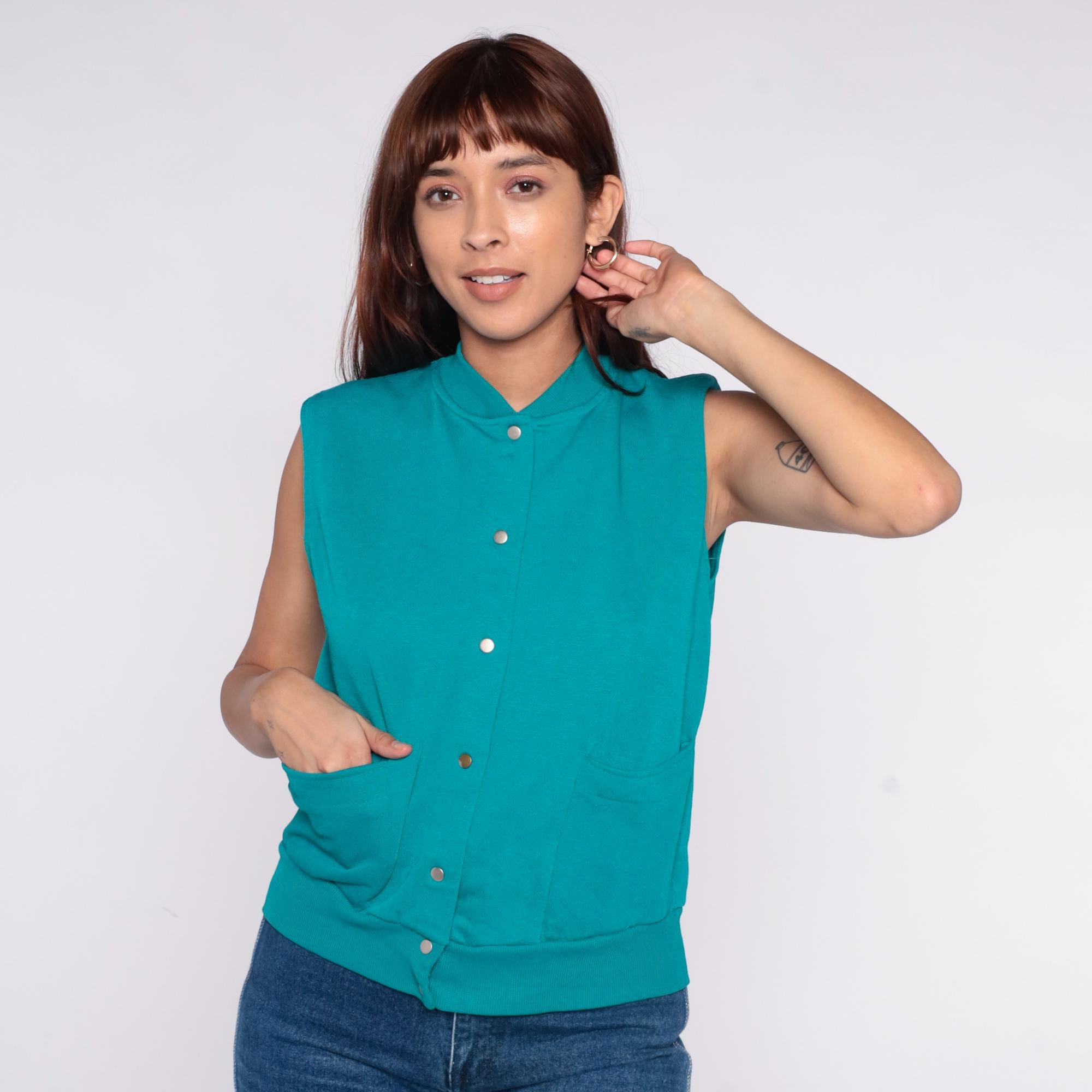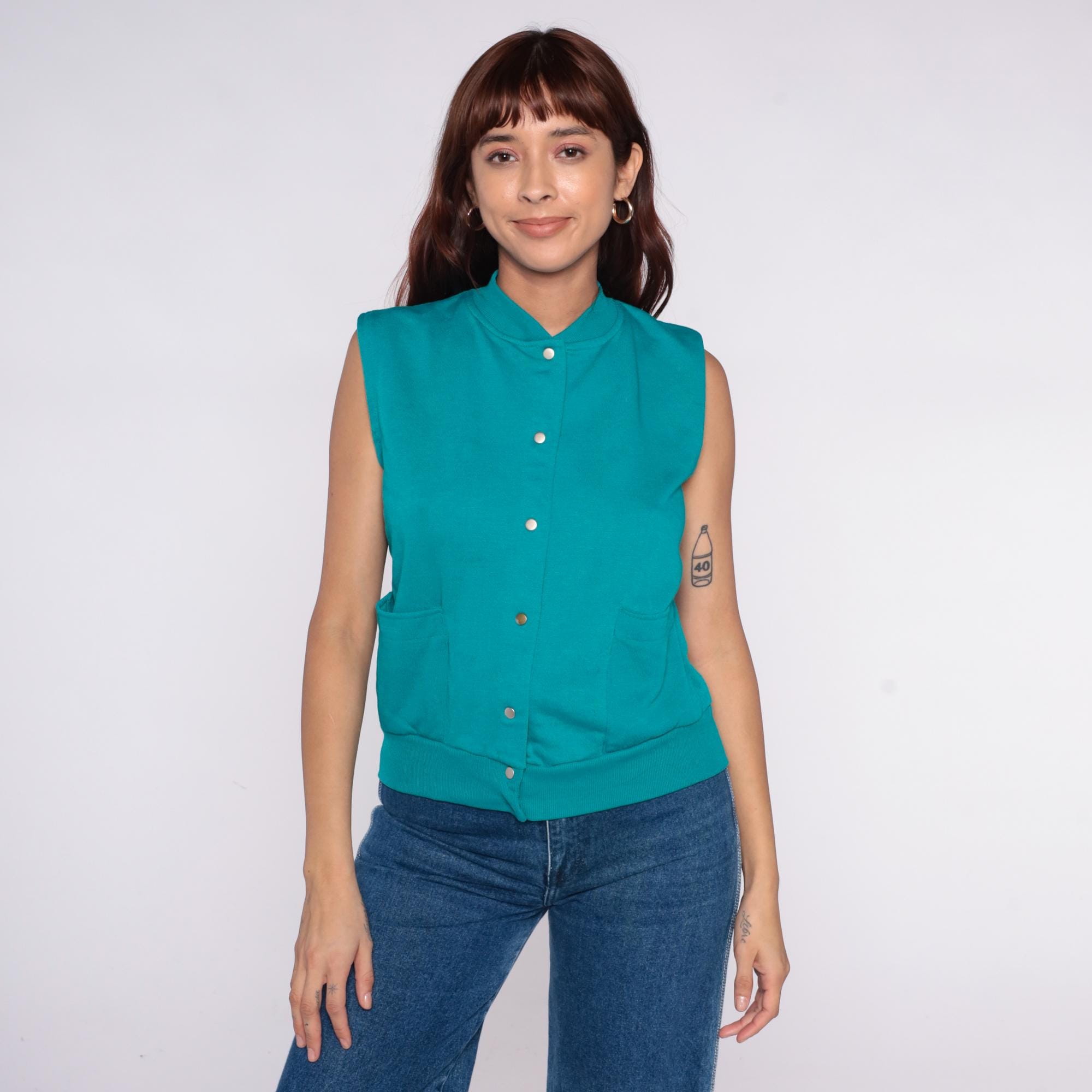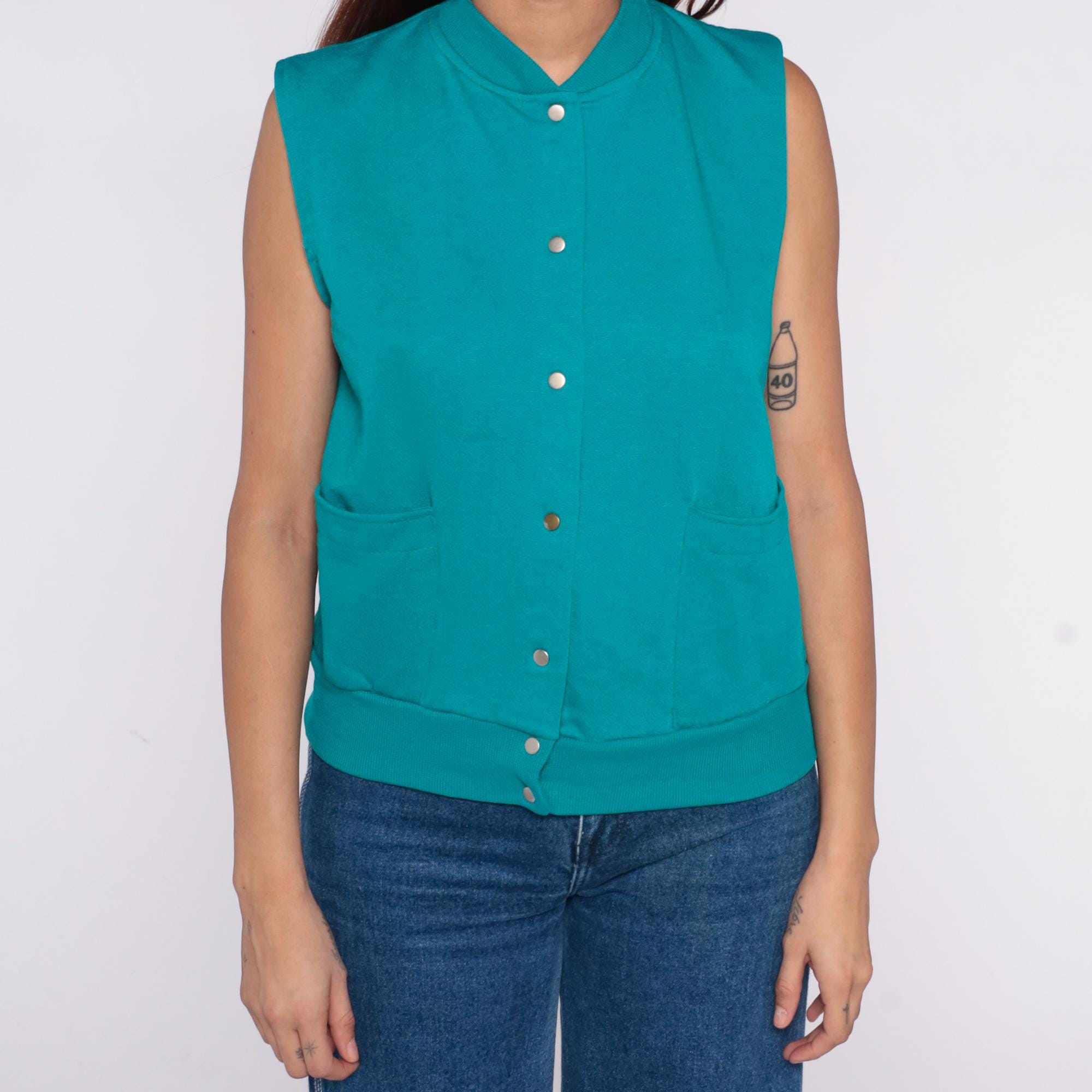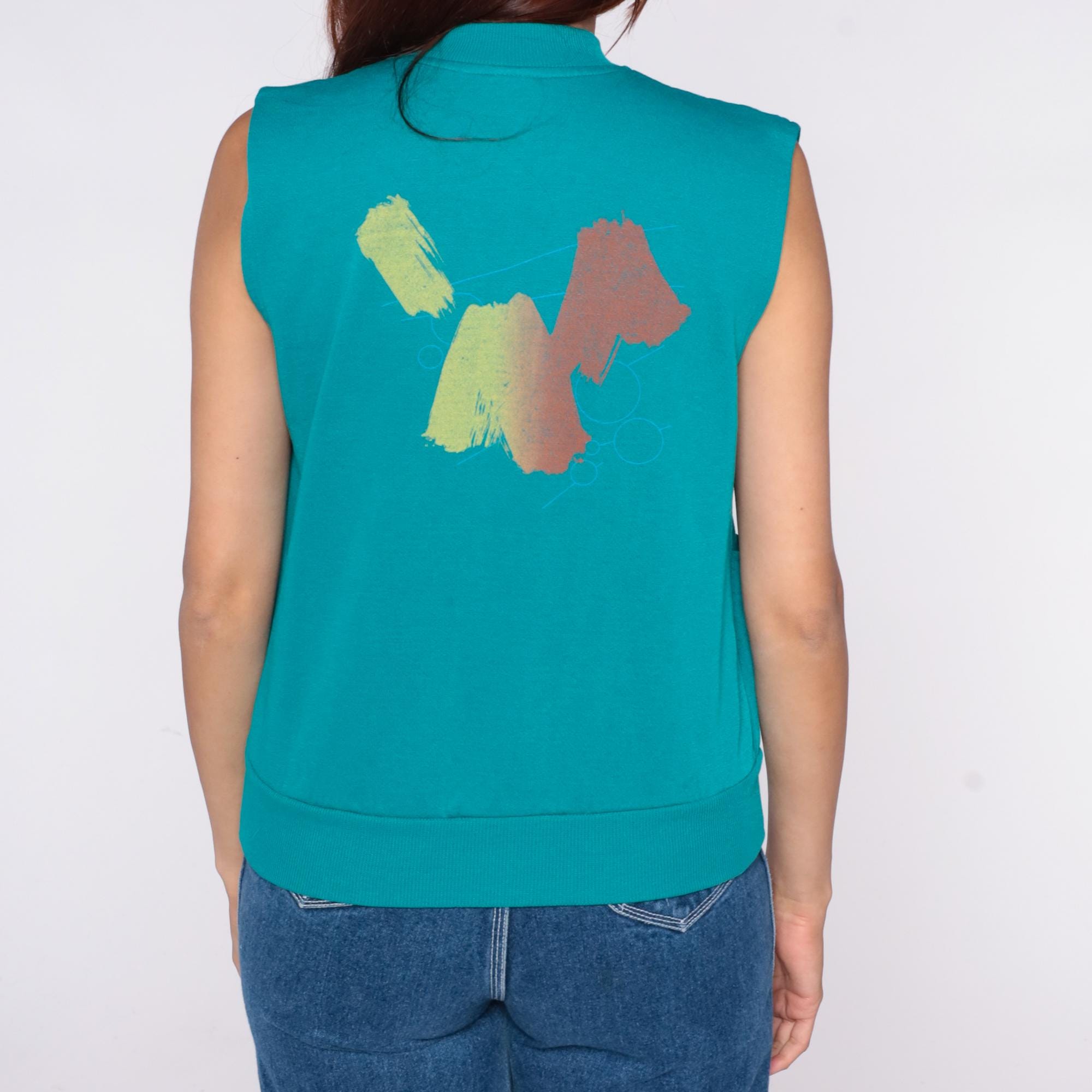 90s teal vest with abstract painted design across the back in yellow, pink, and coral brush strokes. Snap button front closure, notched collar, two patch pockets at hip, ribbed hem.