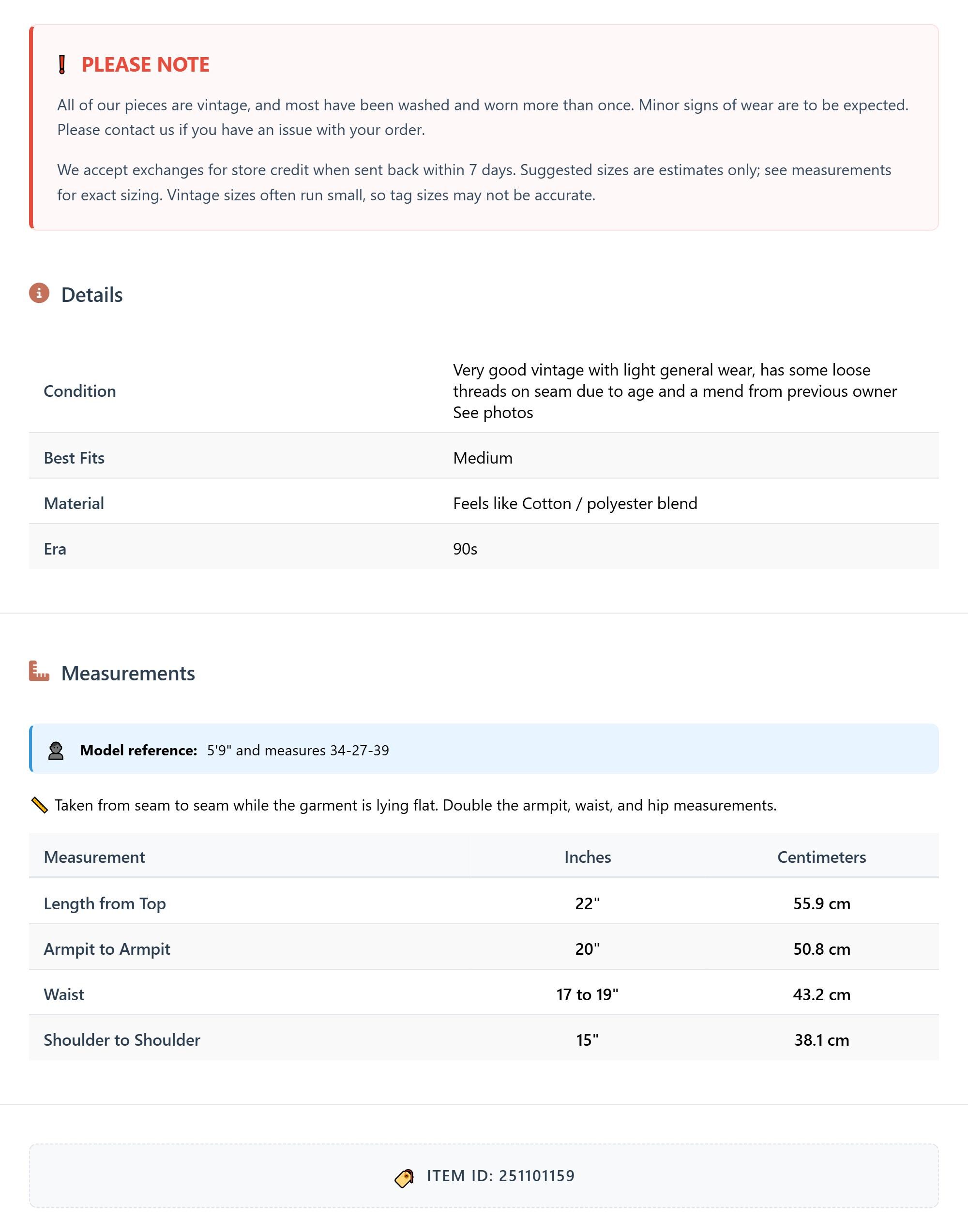 All of our pieces are vintage, and most have been washed and worn more than once. Minor signs of wear are to be expected. Please contact us if you have an issue with your order. We accept exchanges for store credit when sent back within 7 days.