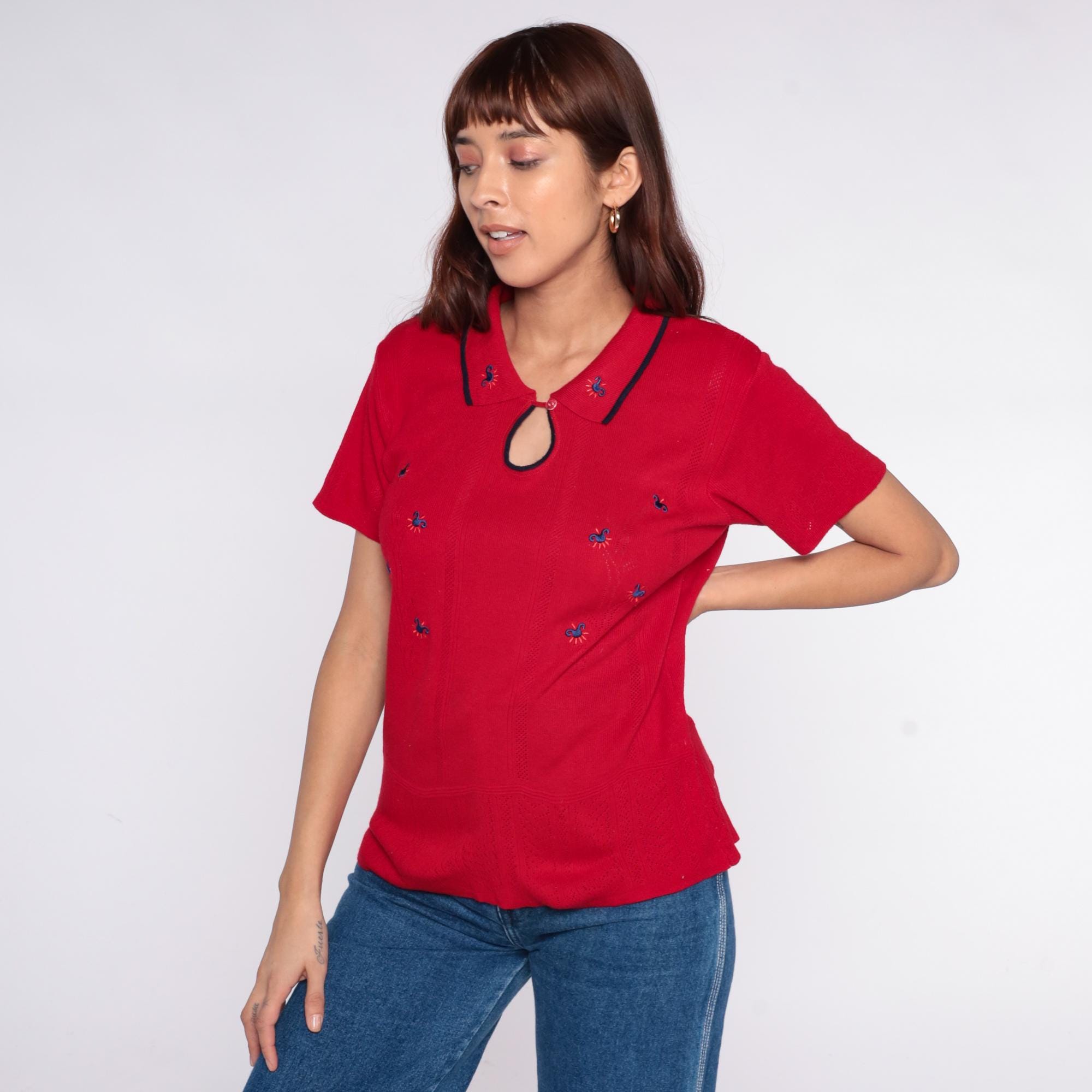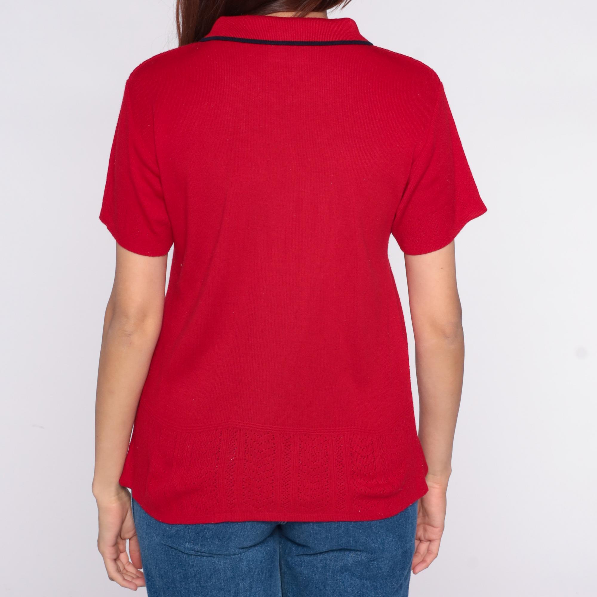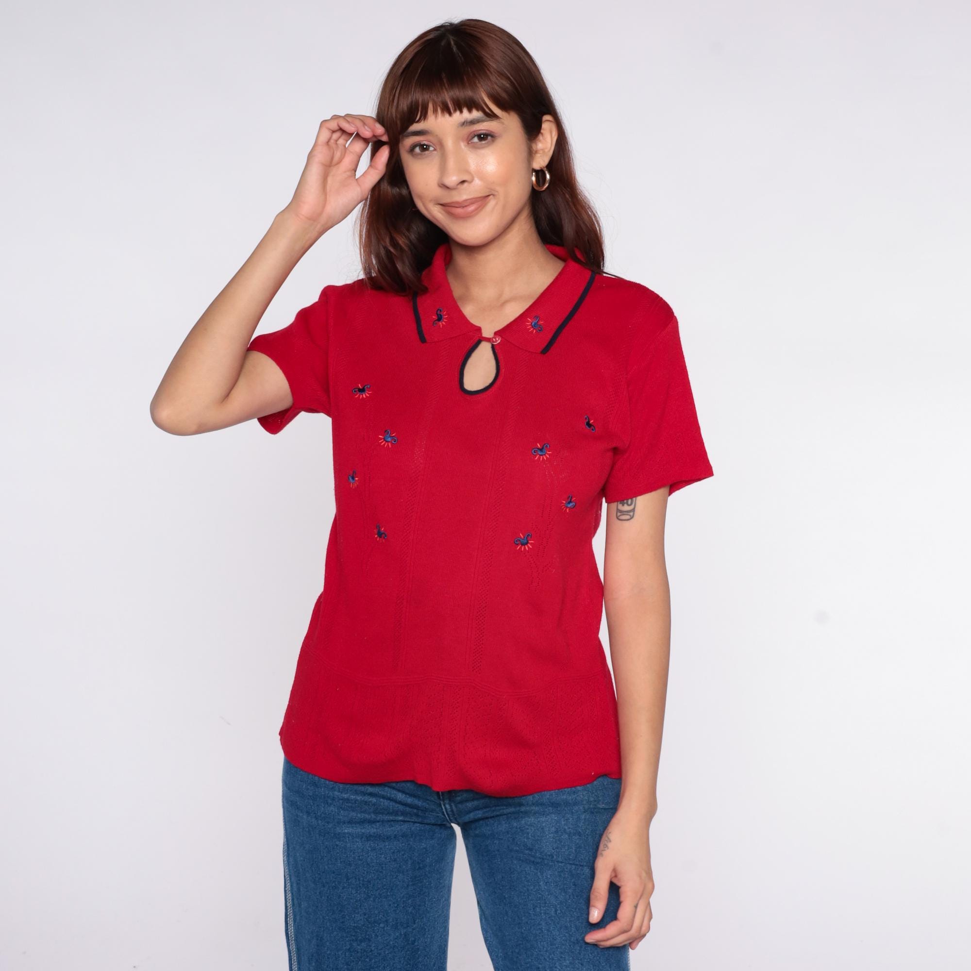 70s red knit polo top from Lady Loana with navy-trimmed collar and keyhole neckline with button closure. Blue embroidered flowers scattered across the front. Short sleeves with ribbed texture throughout.