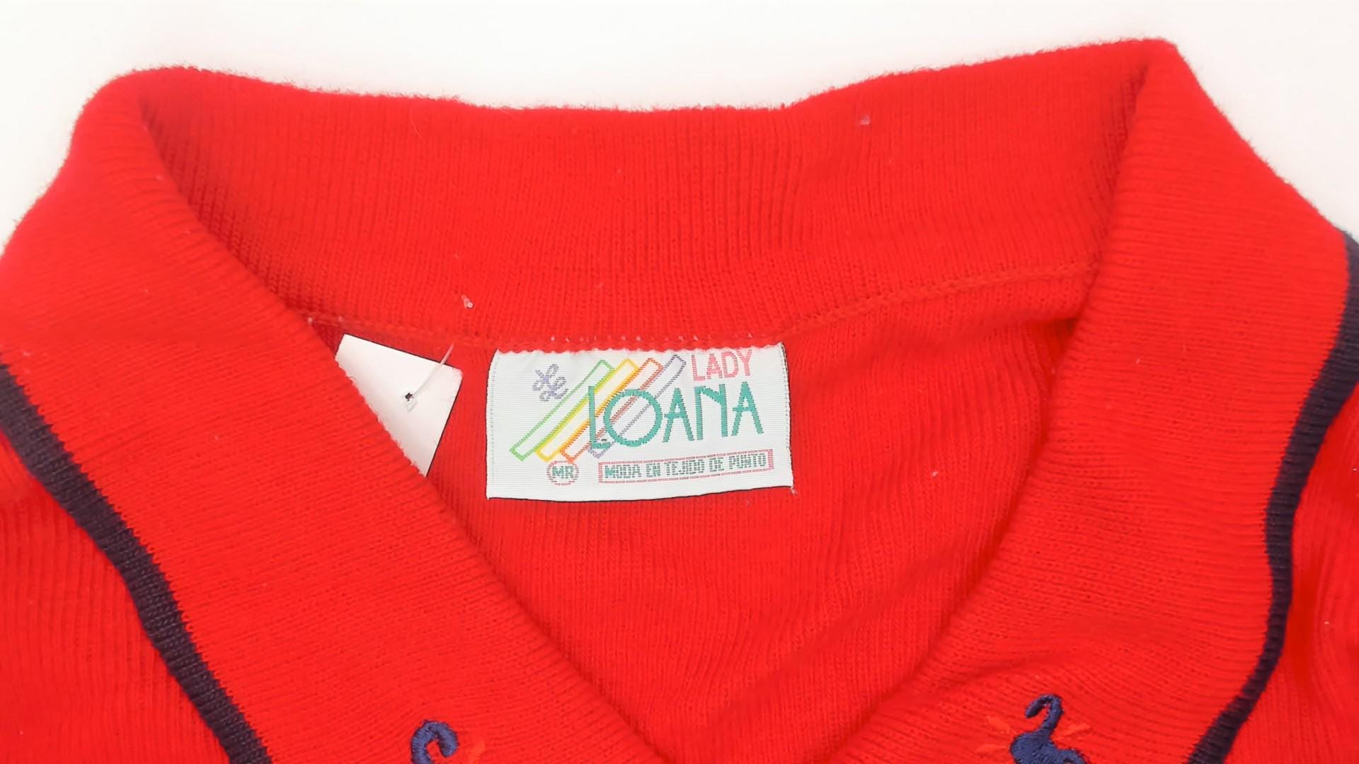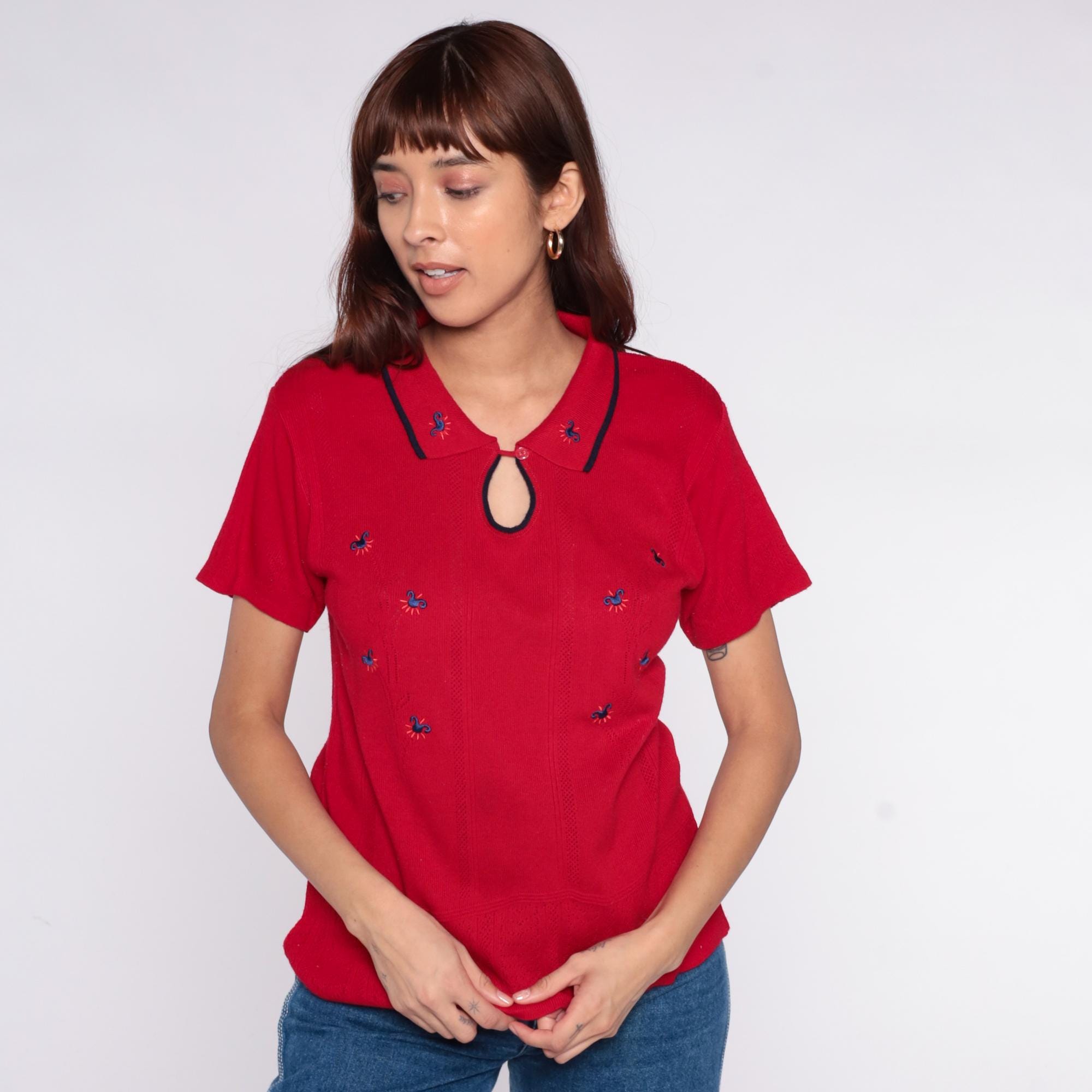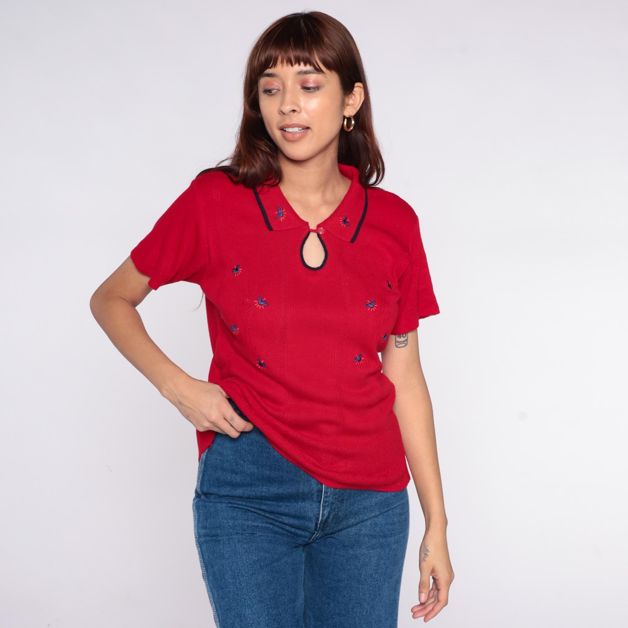 70s red knit polo top from Lady Loana with navy-trimmed collar and keyhole neckline with button closure. Blue embroidered flowers scattered across the front. Short sleeves with ribbed texture throughout.