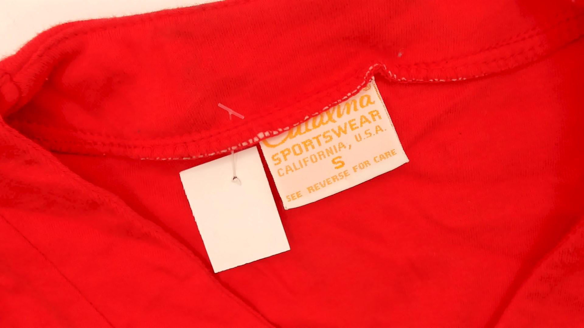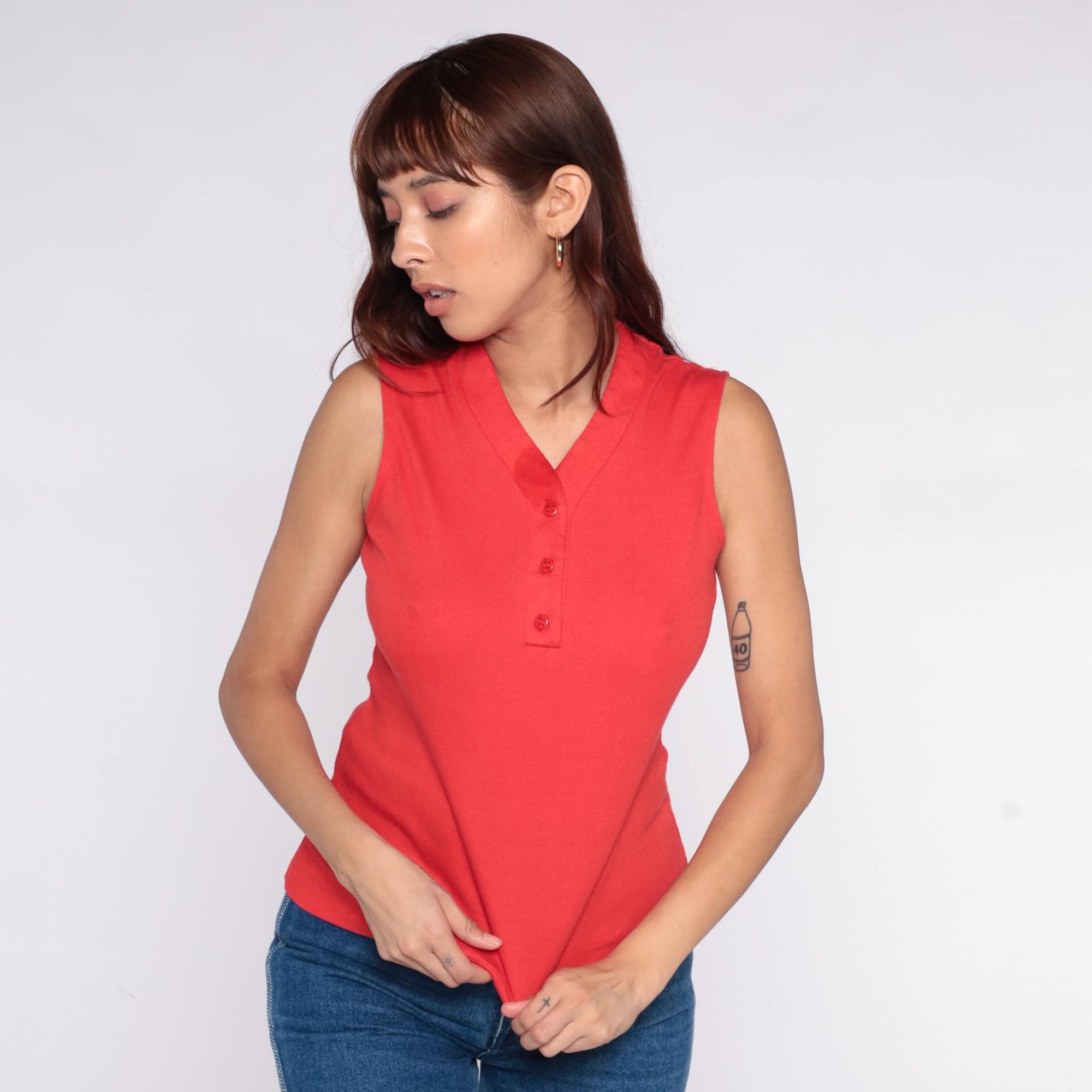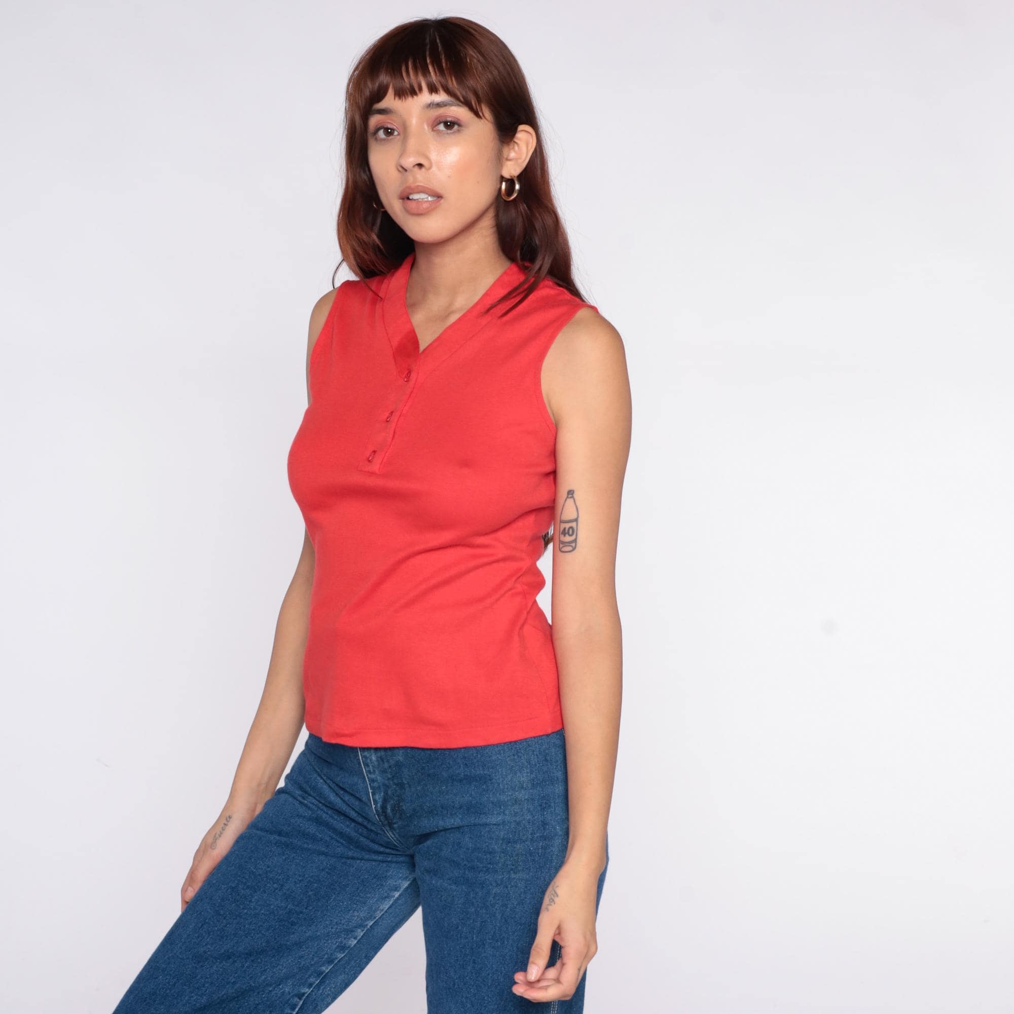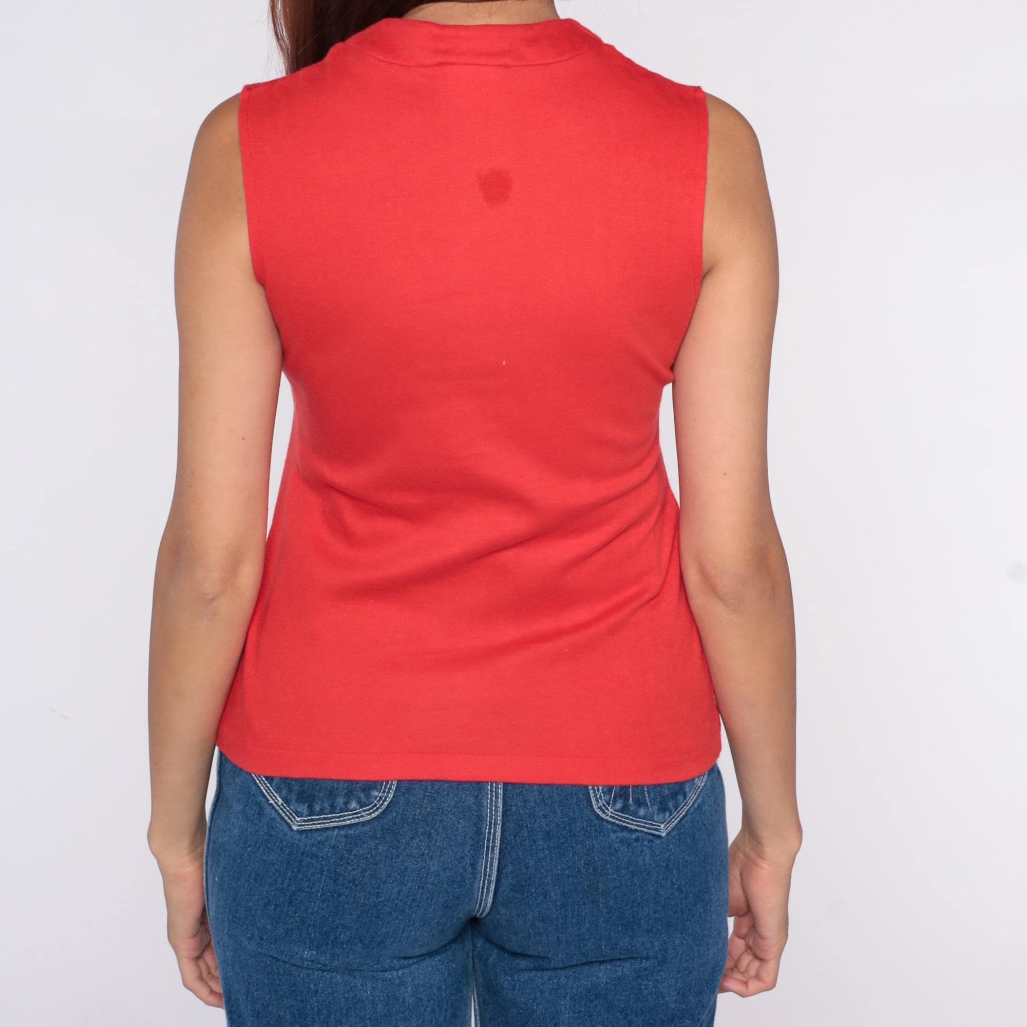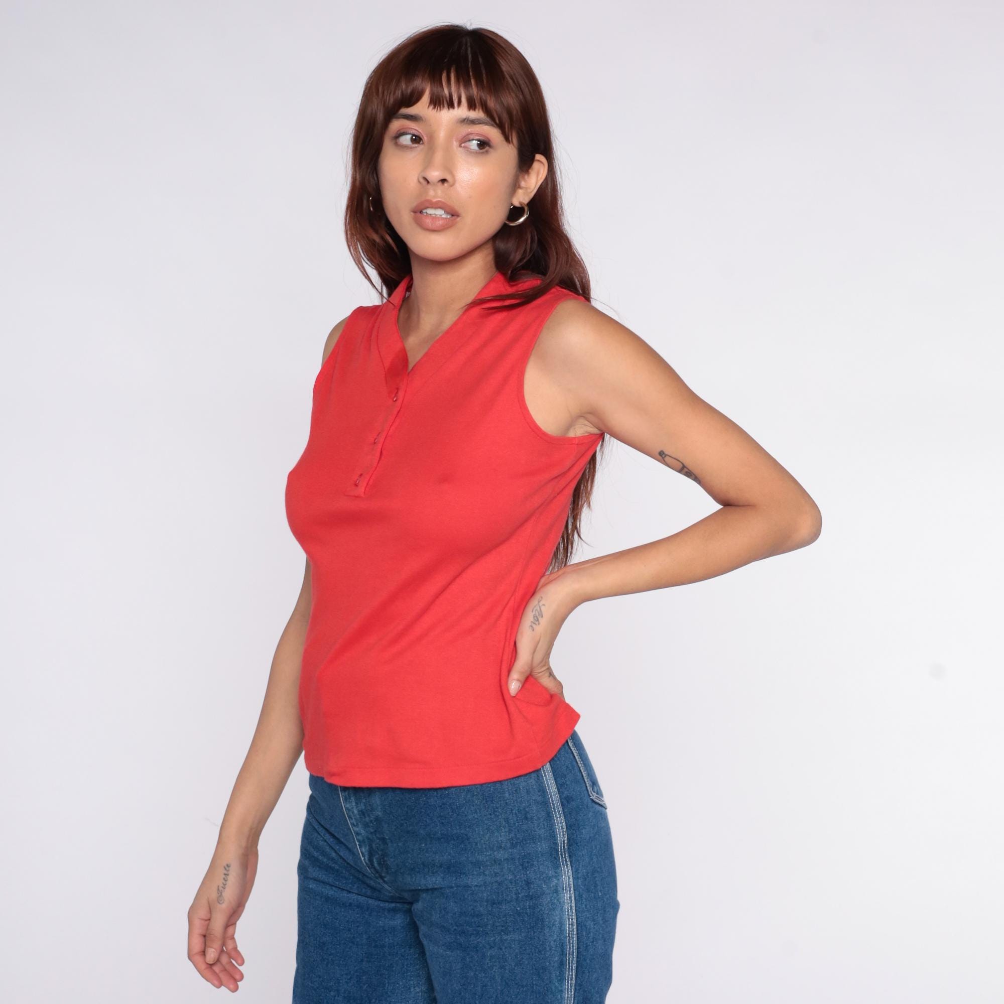 70s red sleeveless polo shirt from catalina sportswear with V-neckline, pointed collar, and three-button placket at front. Tank style with ribbed collar and armhole trim.