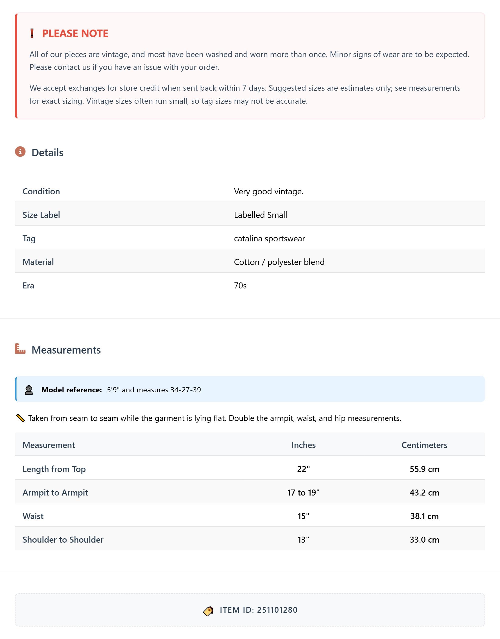 All of our pieces are vintage, and most have been washed and worn more than once. Minor signs of wear are to be expected. Please contact us if you have an issue with your order. We accept exchanges for store credit when sent back within 7 days.