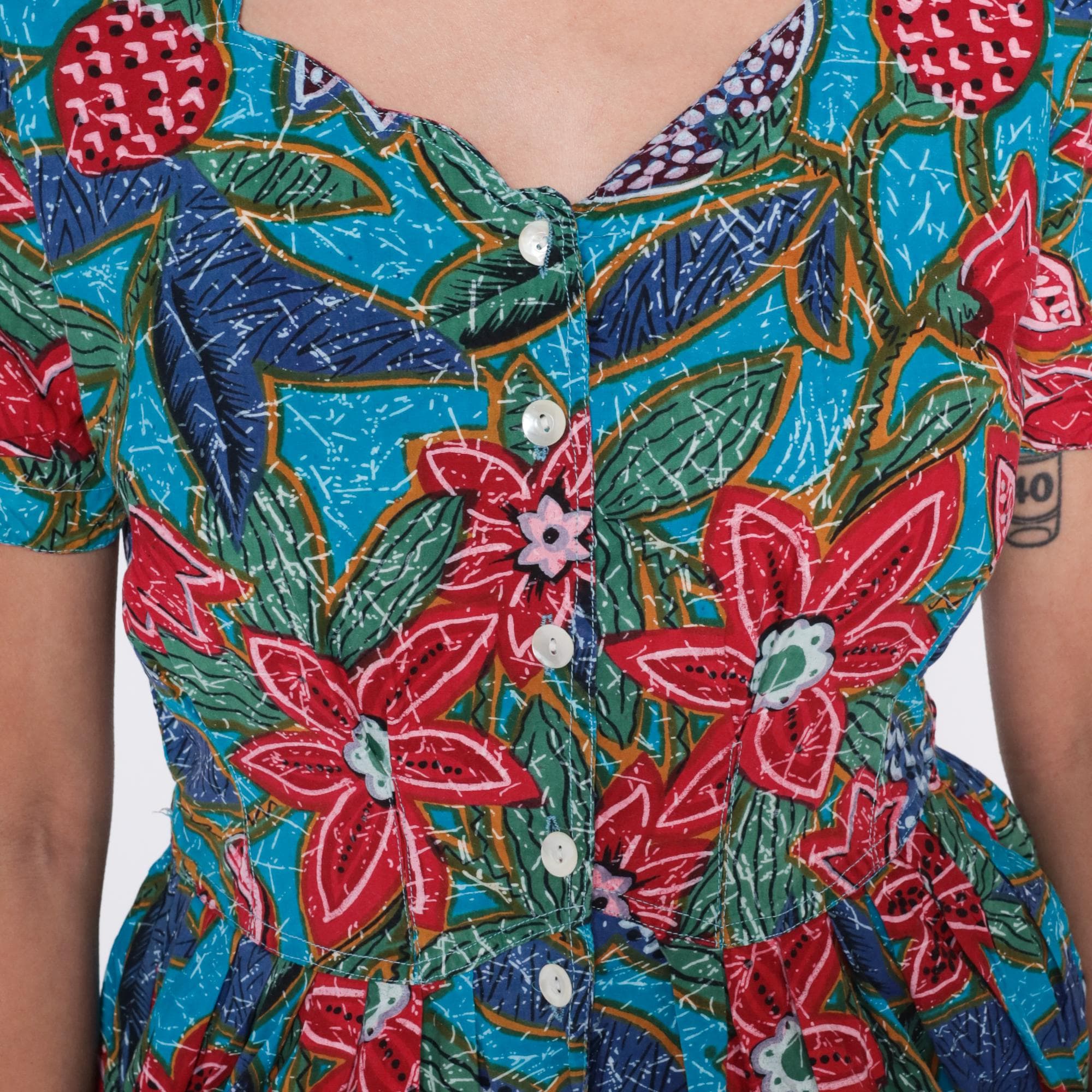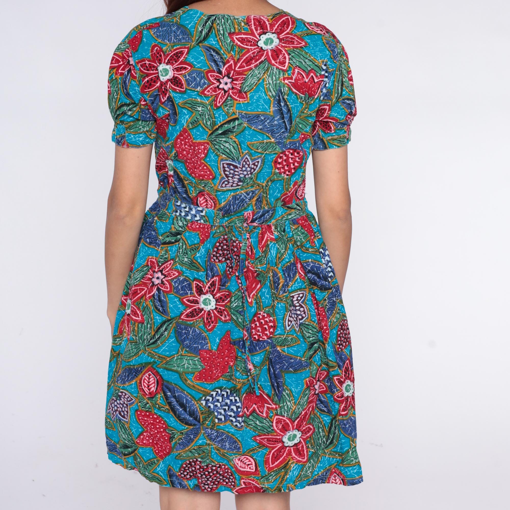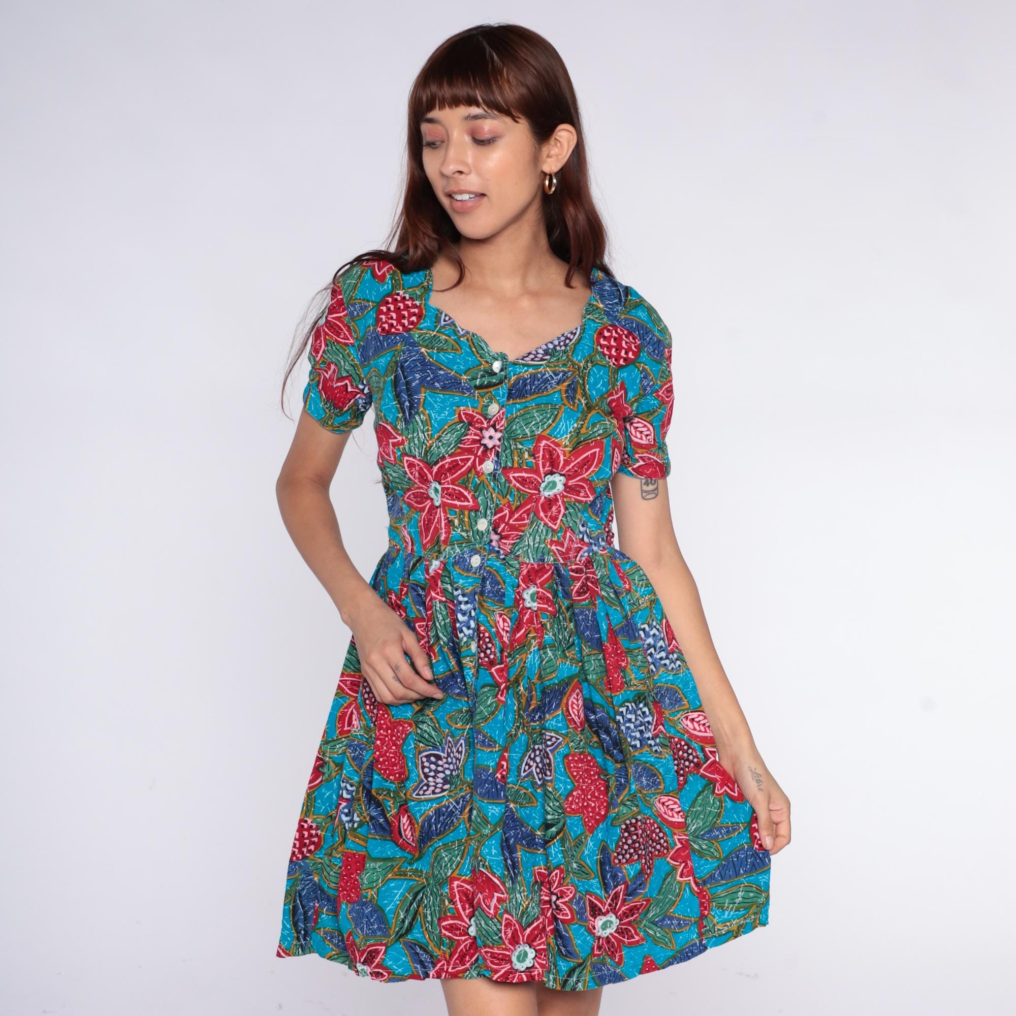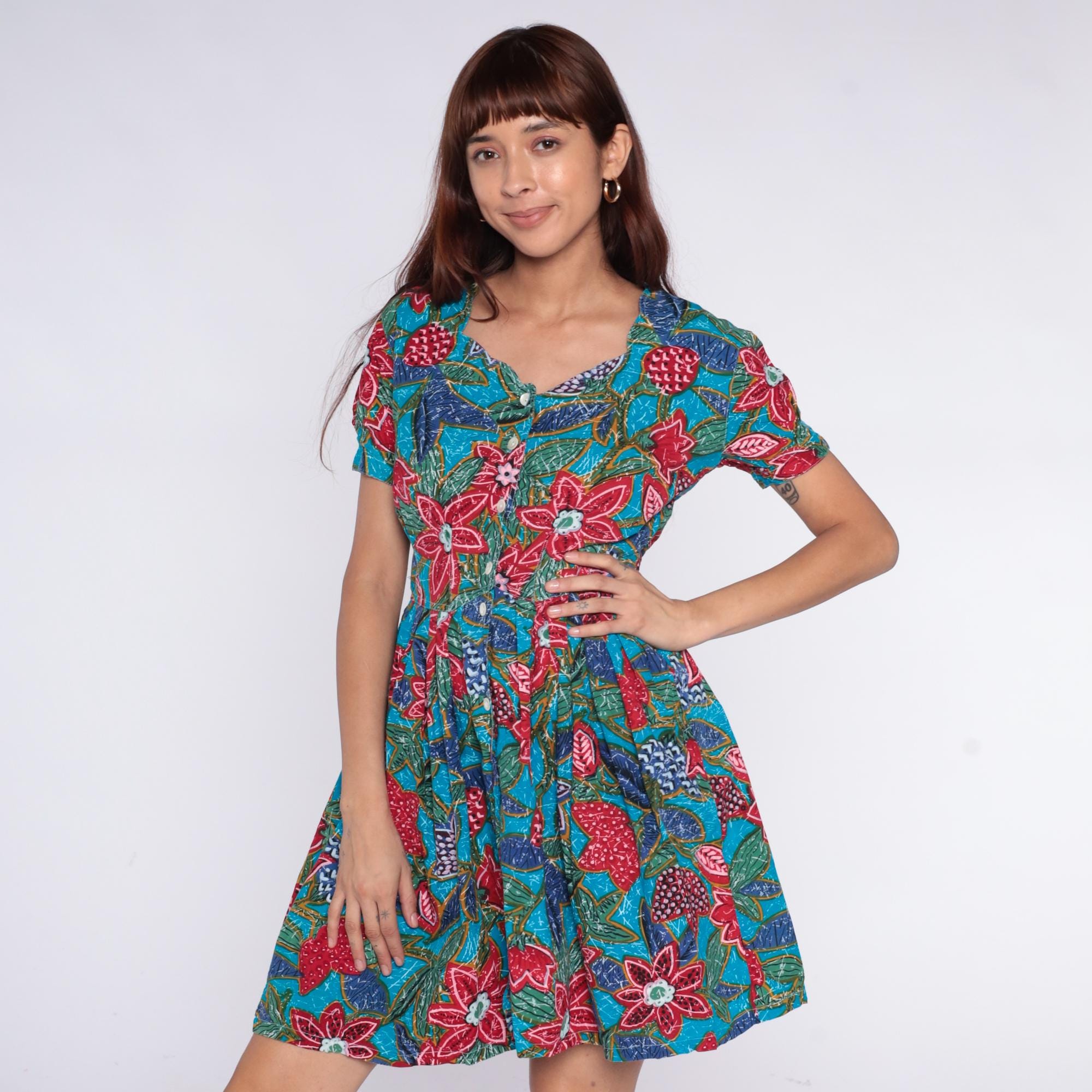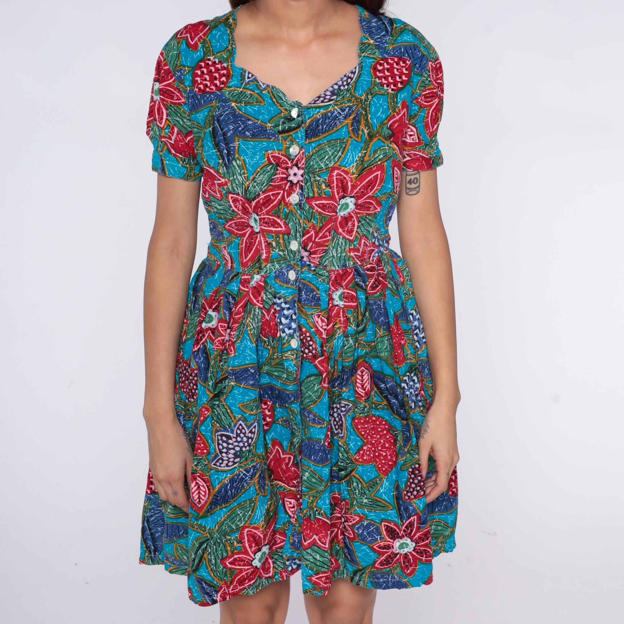 90s turquoise floral print dress from regarde! dresses with red, pink, and coral flowers across bright blue fabric. Button front closure, short puffed sleeves with gathered edges, fitted bodice with elasticated waist, A-line skirt.