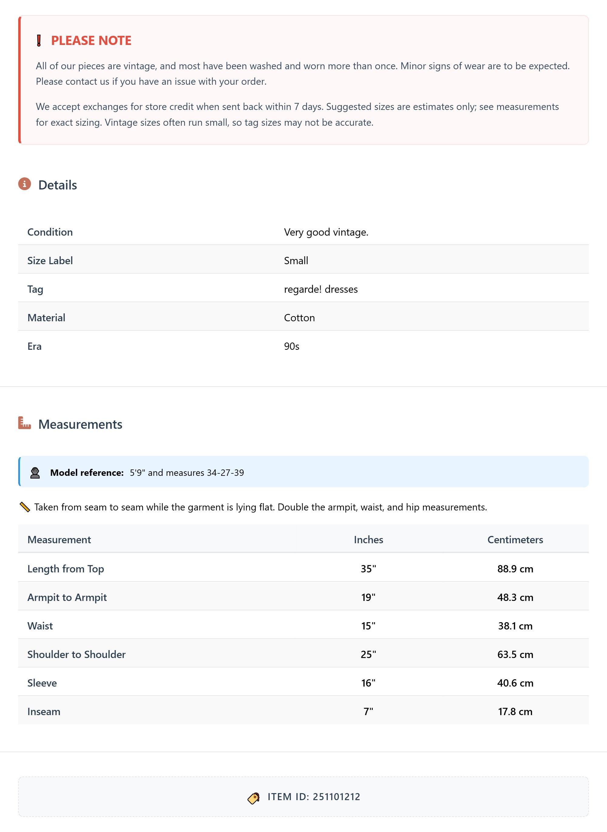 All of our pieces are vintage, and most have been washed and worn more than once. Minor signs of wear are to be expected. Please contact us if you have an issue with your order. We accept exchanges for store credit when sent back within 7 days.