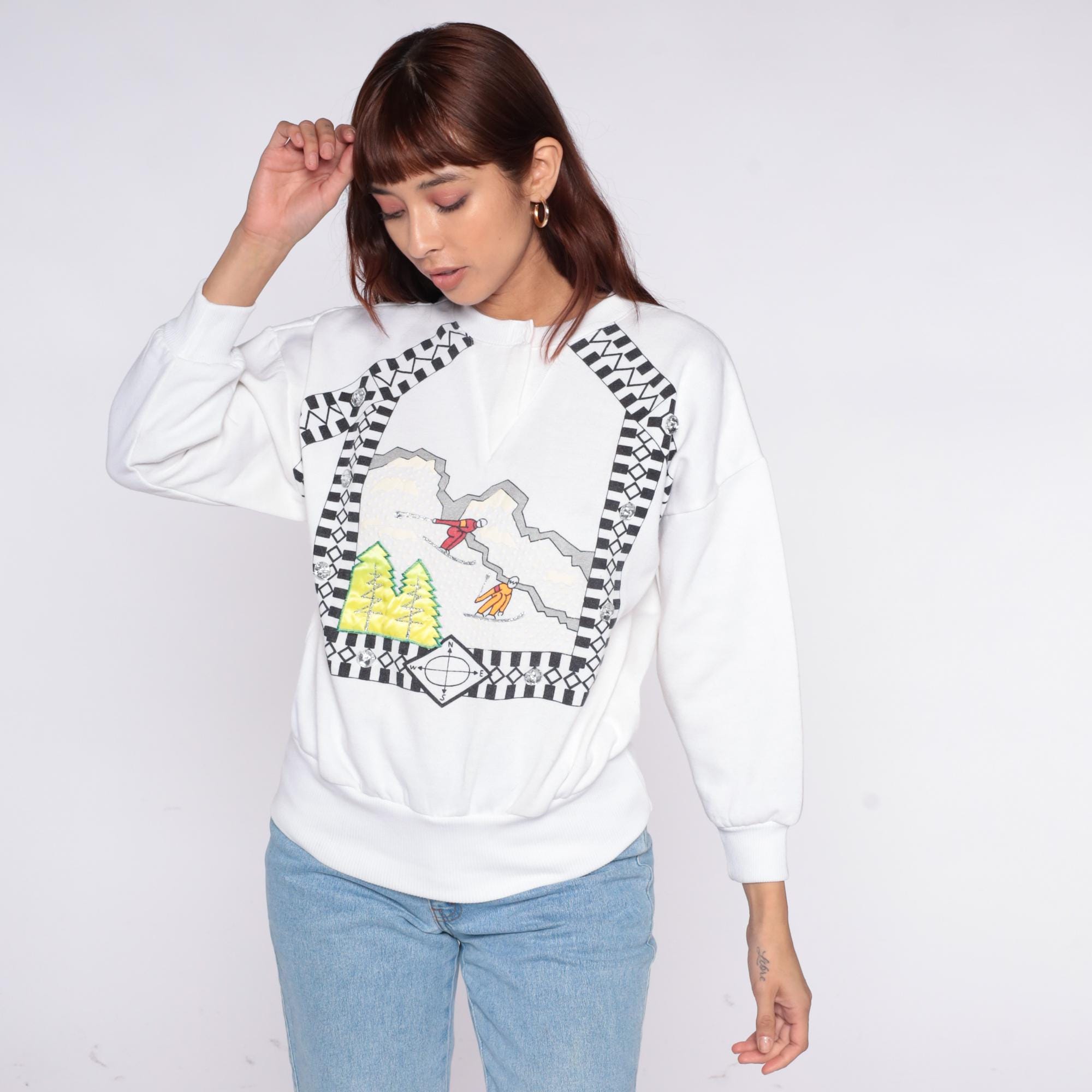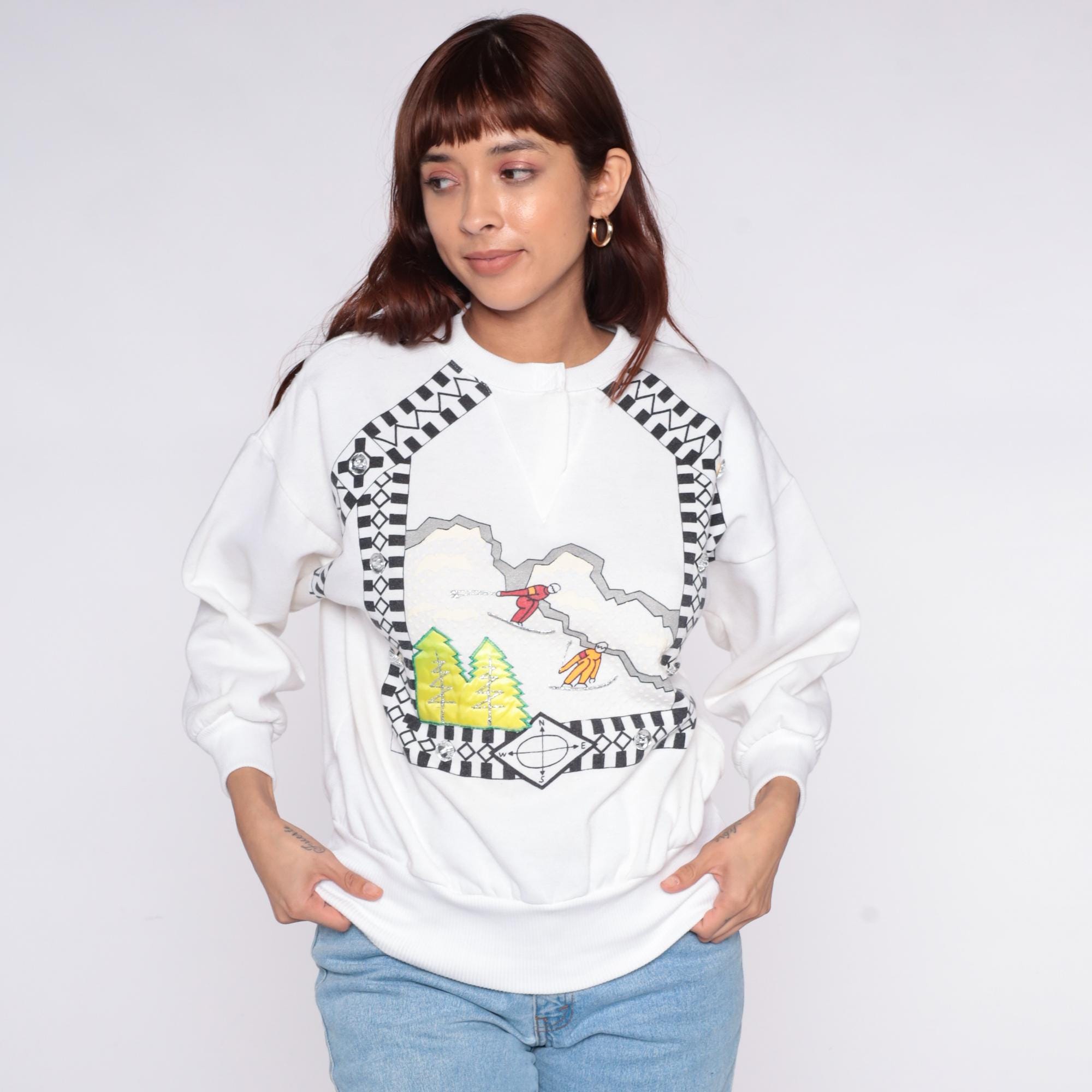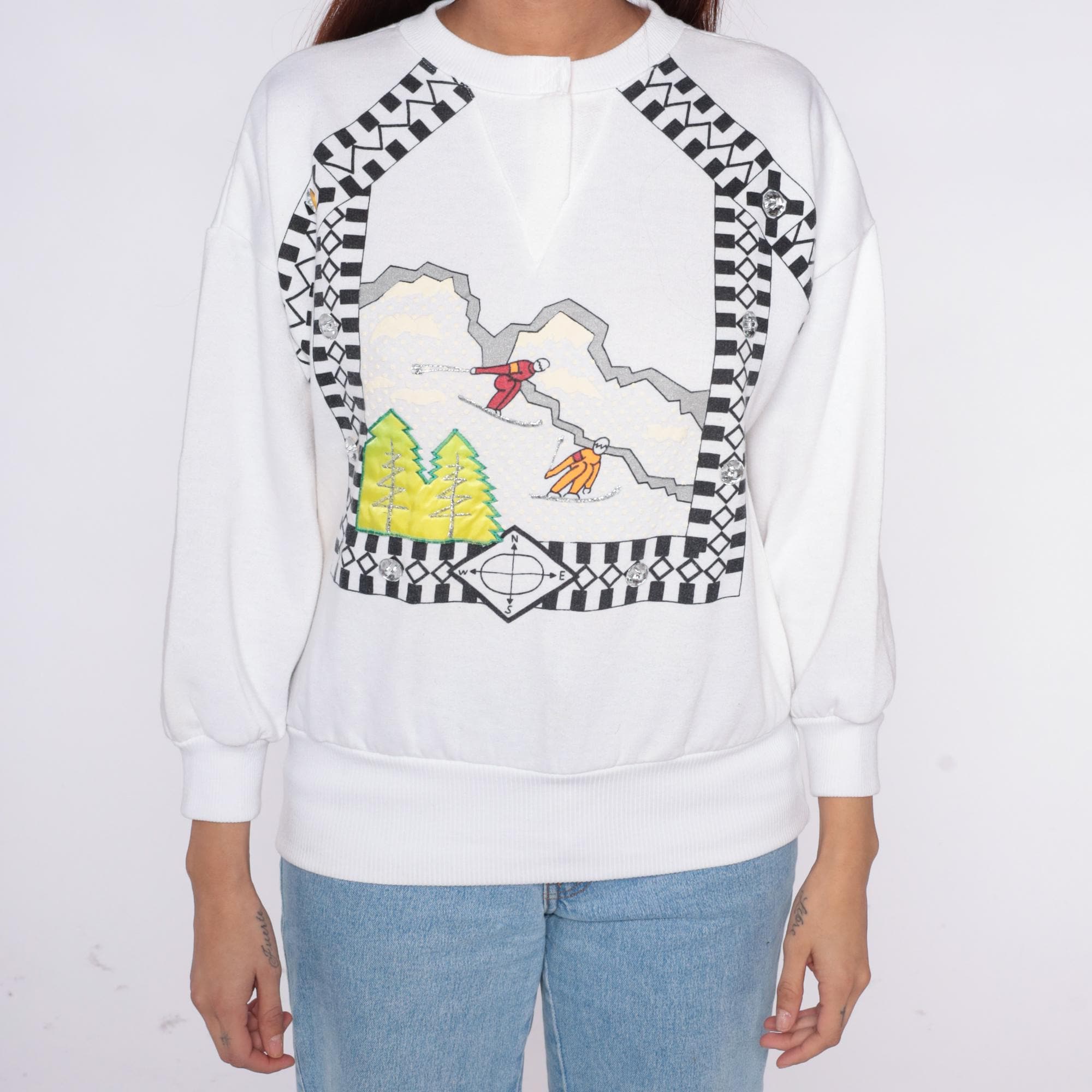90s white sweatshirt from Cristina with ski scene graphic across the front, featuring skiing figures on mountain slopes with green trees and checkered black and white border pattern.