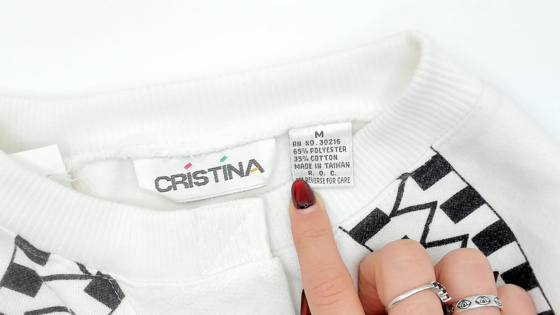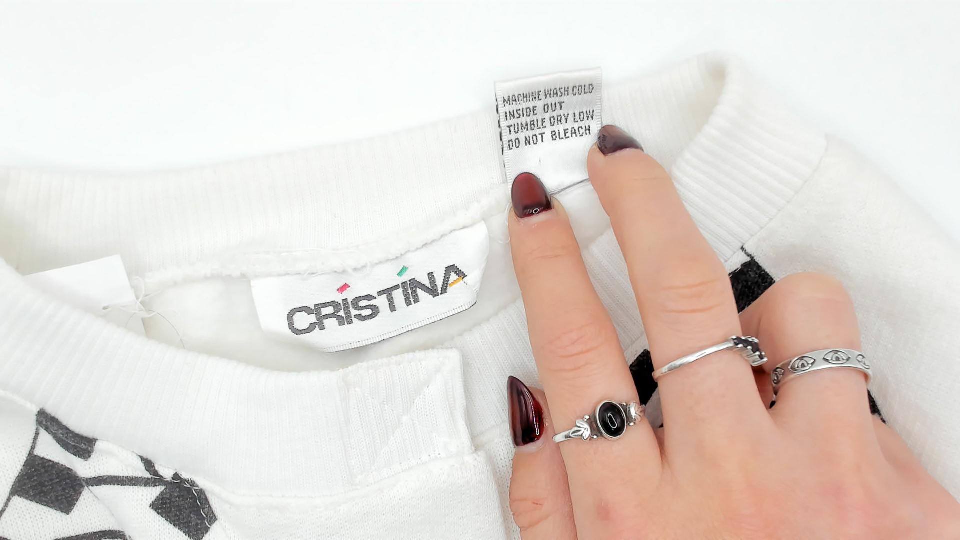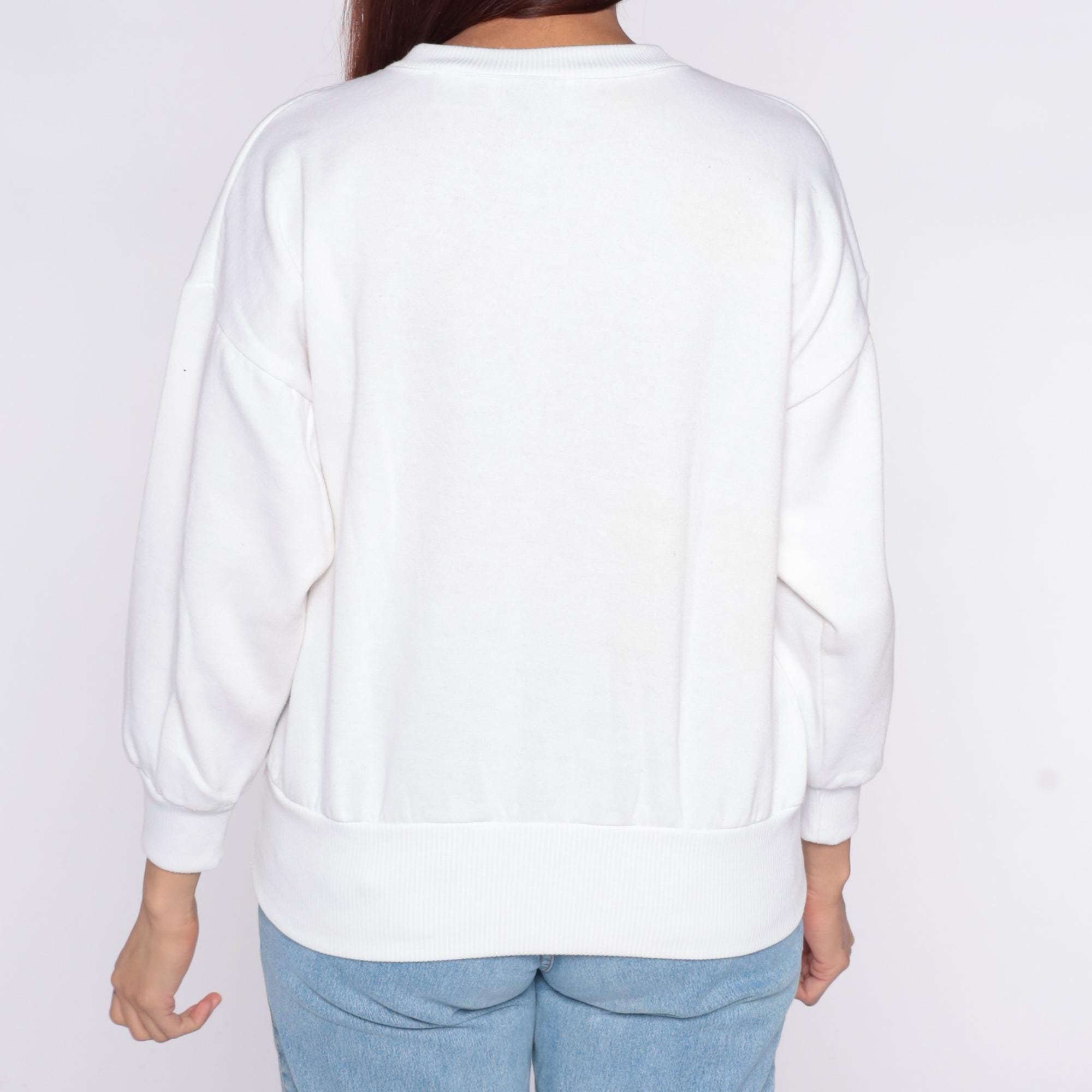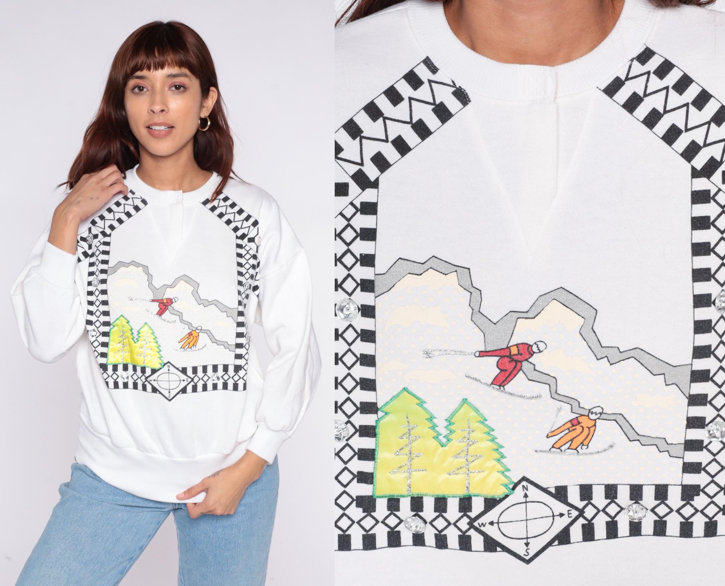 90s white sweatshirt from Cristina with ski scene graphic across the front, featuring skiing figures on mountain slopes with green trees and checkered black and white border pattern.
