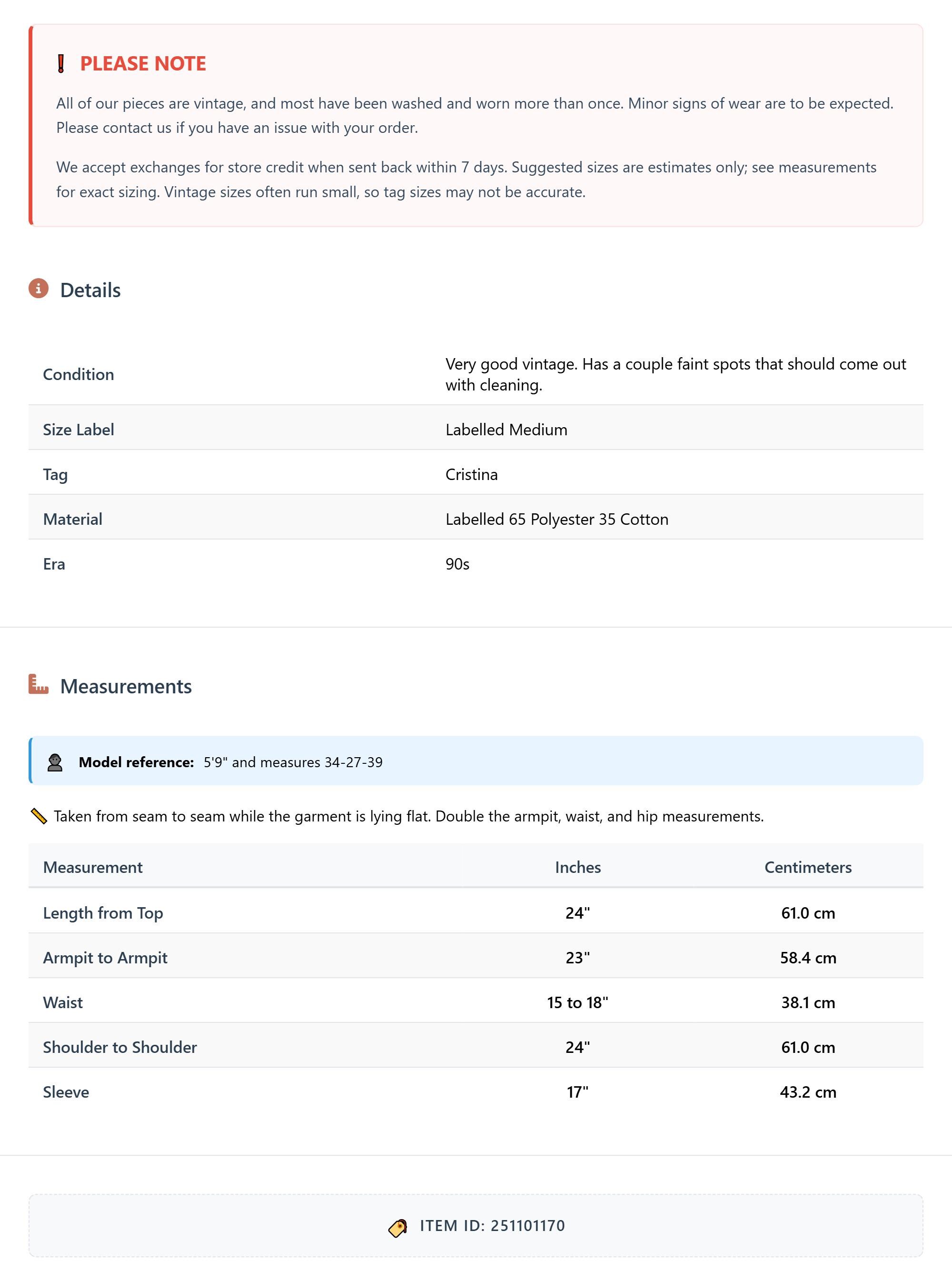 All of our pieces are vintage, and most have been washed and worn more than once. Minor signs of wear are to be expected. Please contact us if you have an issue with your order. We accept exchanges for store credit when sent back within 7 days.